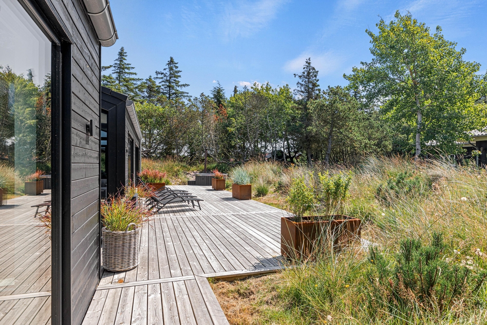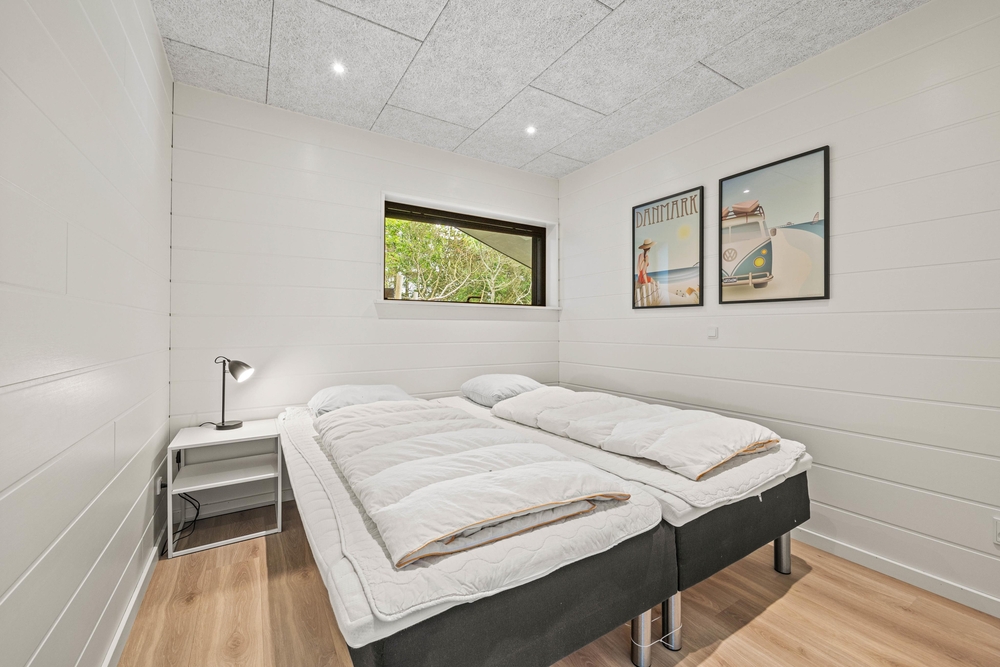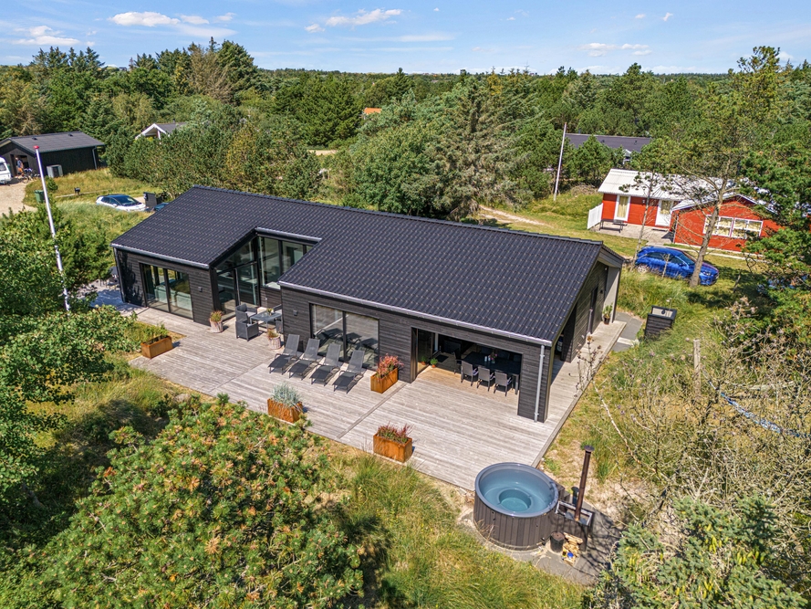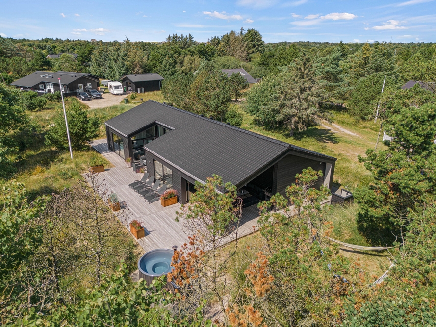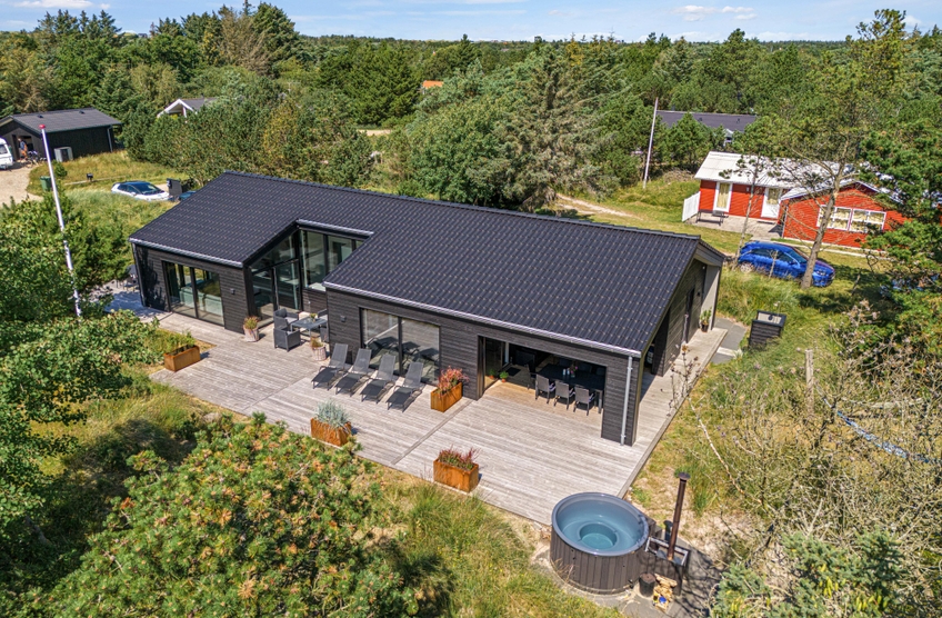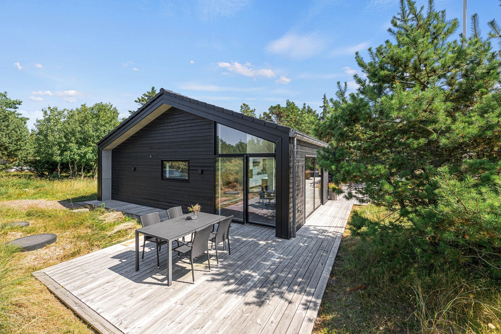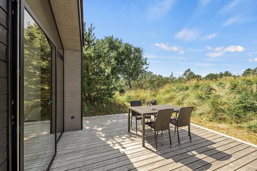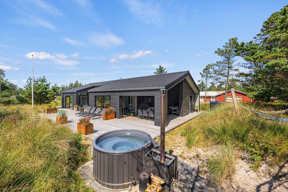 Et moderne og dejligt sommerhus til 8 gæster. En ren og minimalistisk indretning og de store smukke vinduer inviterer lyset indenfor og skaber den rette atmosfære. Udenfor venter jer en lækker overdækket træterrasse med loungeområde og et varmt vildmarksbad.