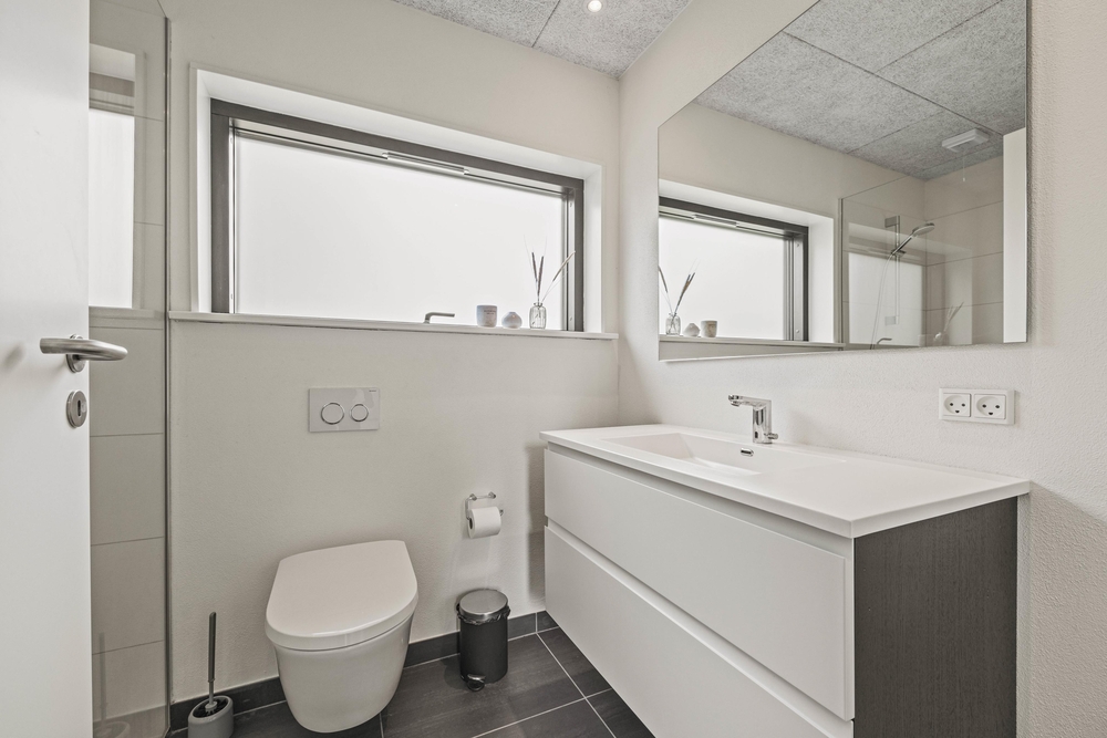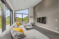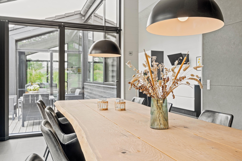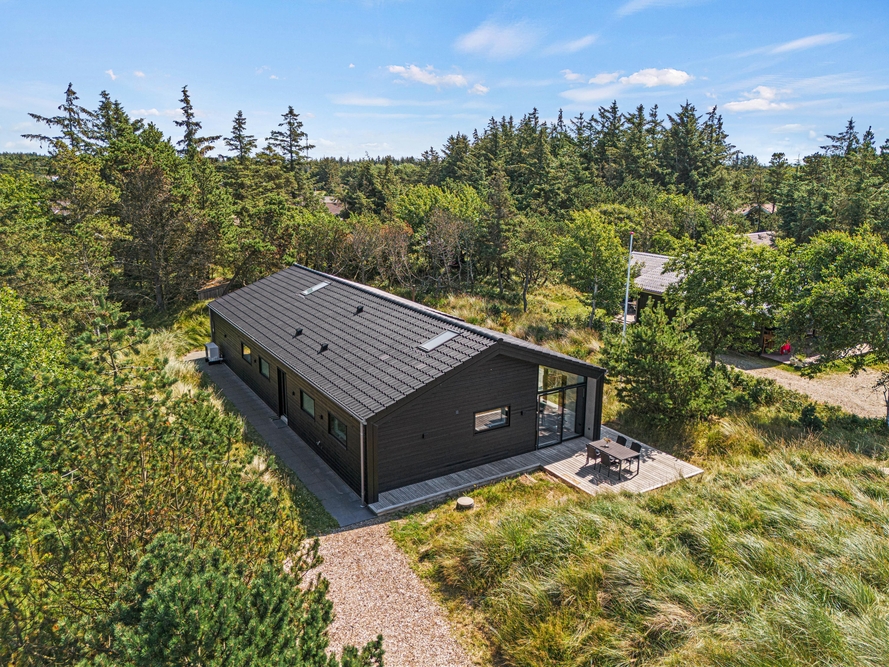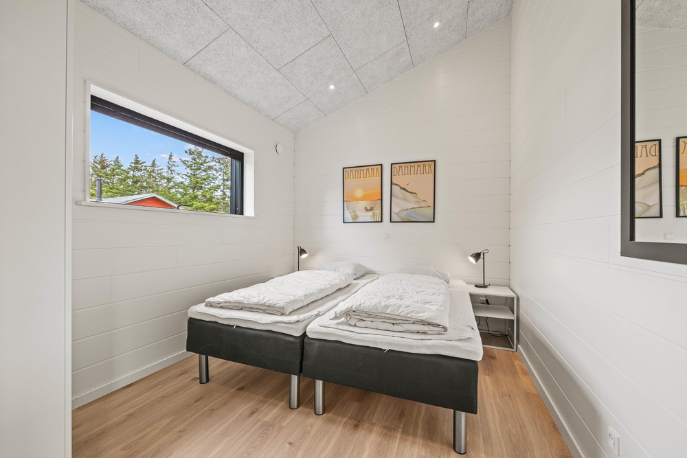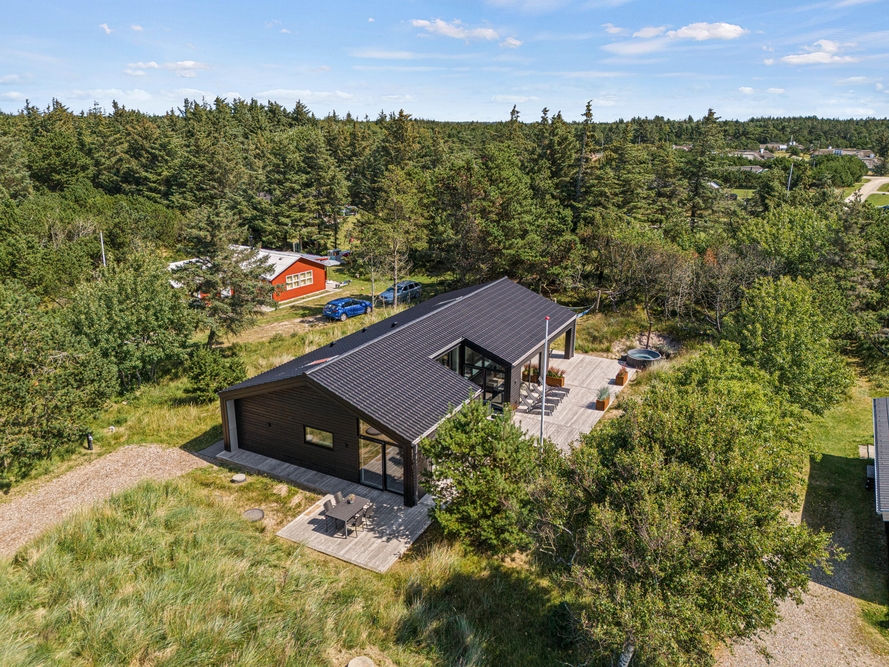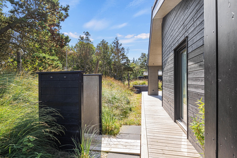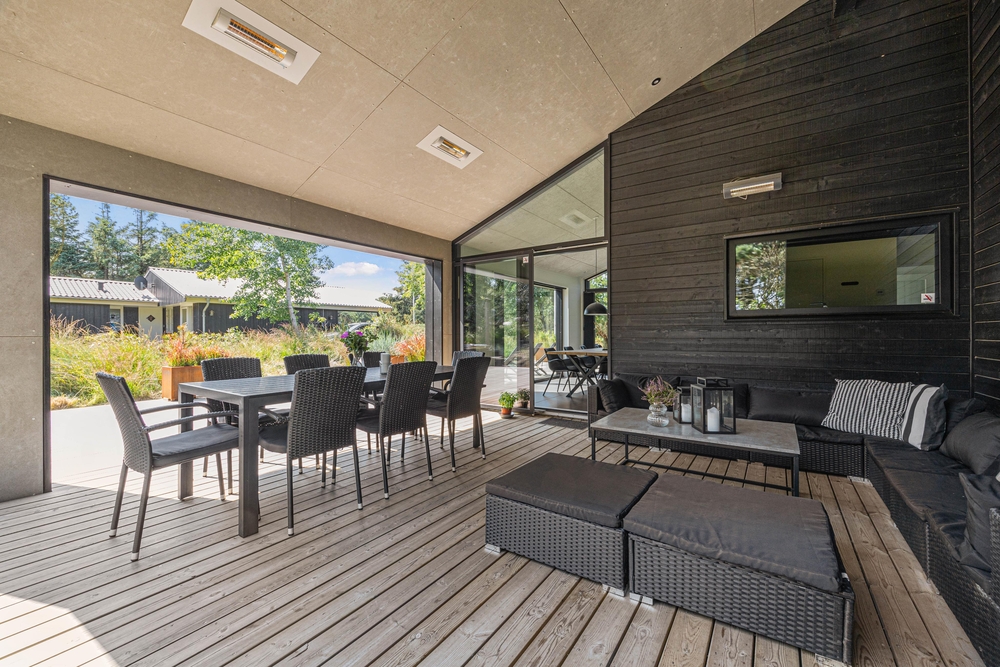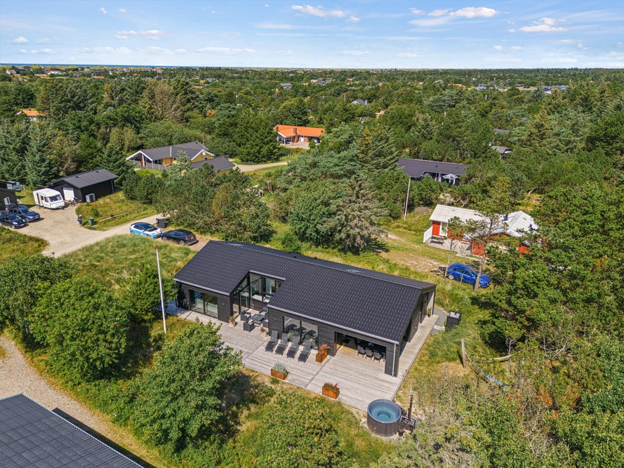 Et moderne og dejligt sommerhus til 8 gæster. En ren og minimalistisk indretning og de store smukke vinduer inviterer lyset indenfor og skaber den rette atmosfære. Udenfor venter jer en lækker overdækket træterrasse med loungeområde og et varmt vildmarksbad.