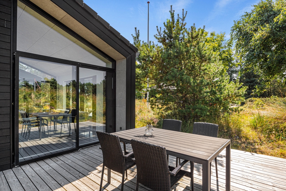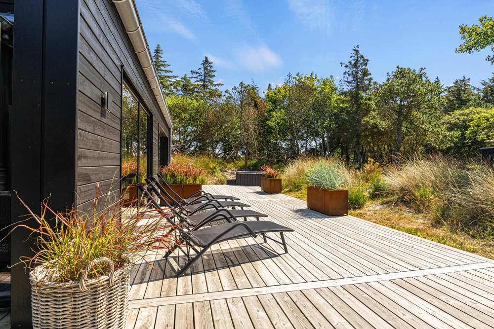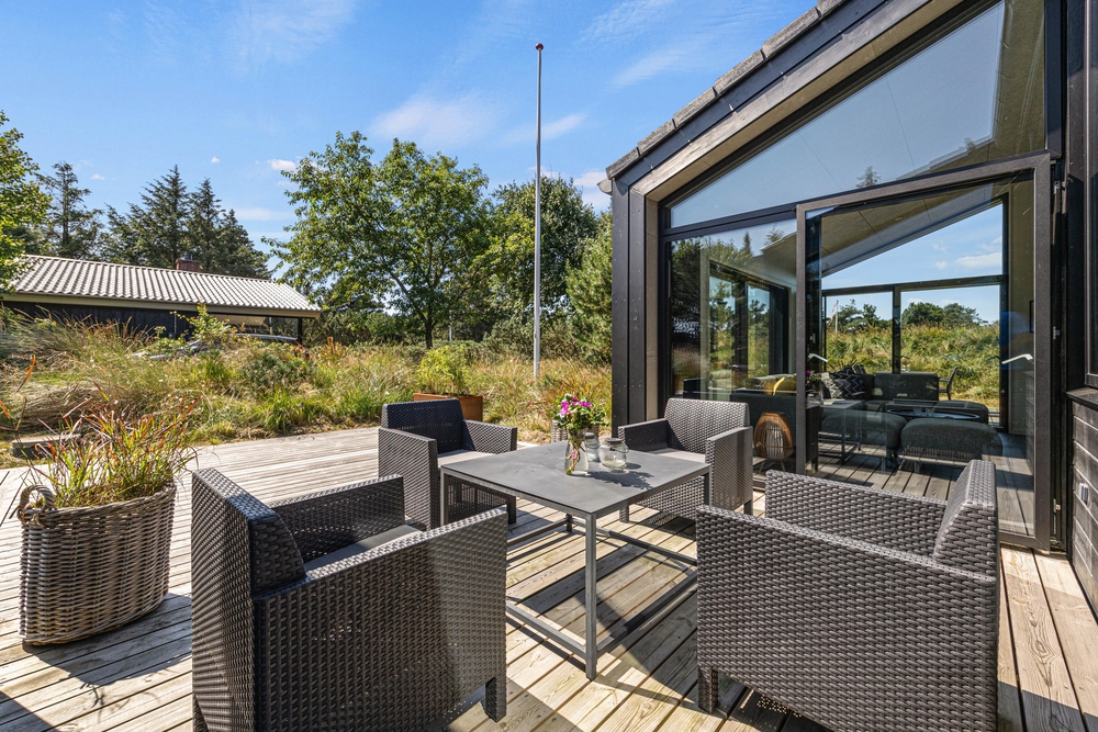 Udendørsarealerne på Snogevej 16 er helt i top! Feriehuset er beliggende på en naturgrund og har 140 m2 træterrasse, hvoraf 26 m2 er overdækket. Her er mange fine kroge med siddepladser, så I kan finde en plads både i skyggen som i solen. Særligt den overdækkede del er helt perfekt til en lækker morgenmad og de lune sommeraftner, hvor der skal tændes op i gasgrillen. Efter en lækker middag kan I fortsatte aftenen i det hyggelige loungeområde med sofa ? her kan I spille kort og drikke lækre drinks, imens morgendagens program planlægges.