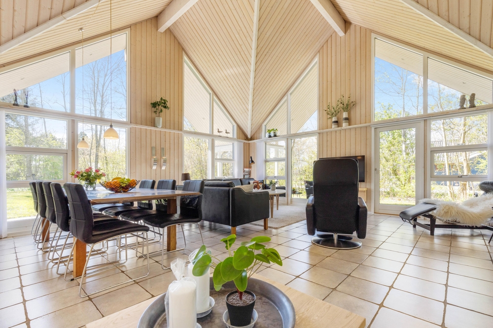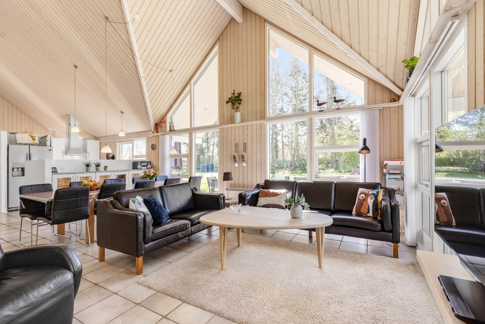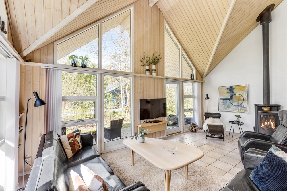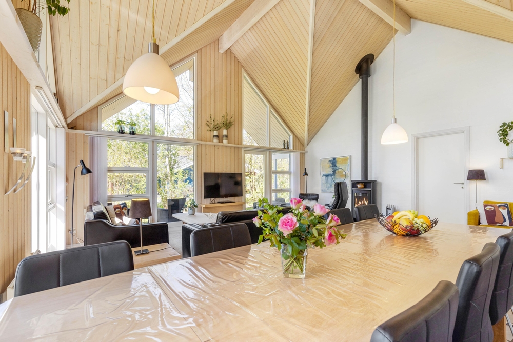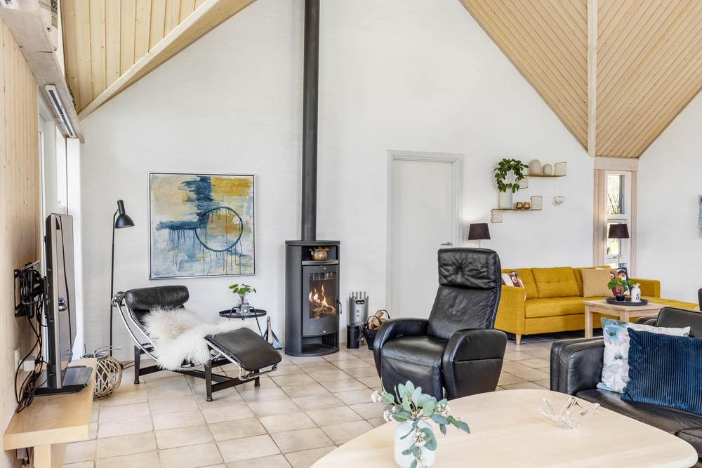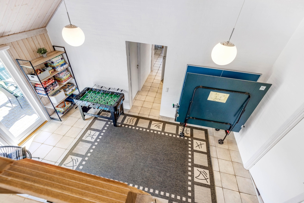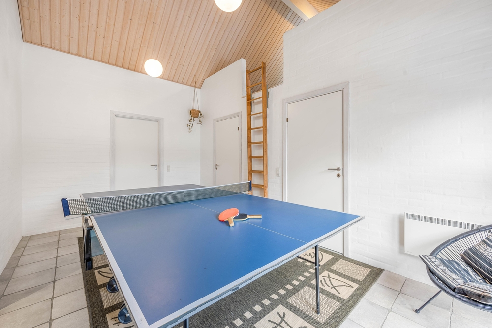 Opholdsrummene er nøje indrettet for at sikre både fredfyldte stunder ved den knitrende brændeovn og livligt samvær i det åbne og lyse fællesareal. Store vinduer slipper et blødt lys ind, der smukt falder over køkkenet, spisestuen og stuen, der glider sammen i en elegant symbiose, med lækre møbler og bordtennis.