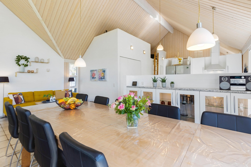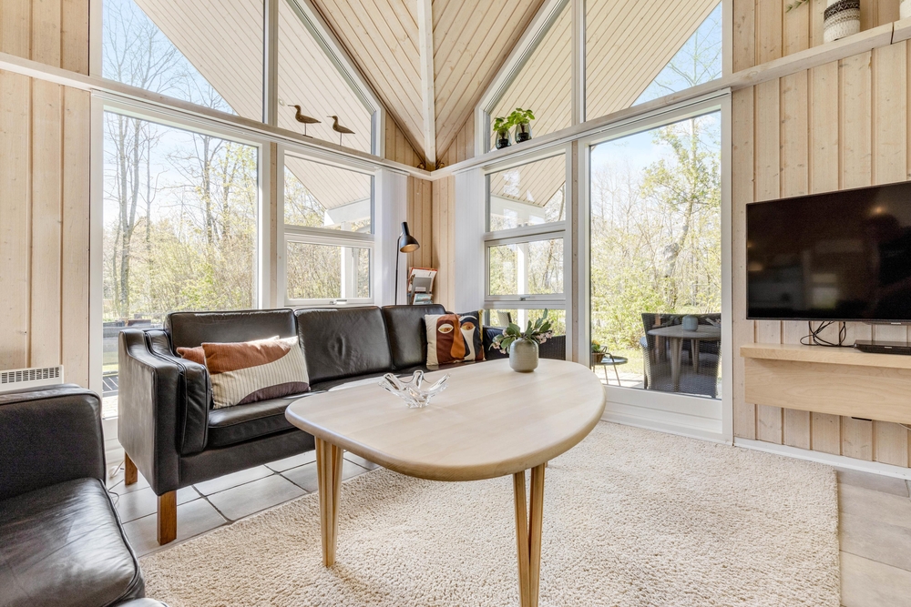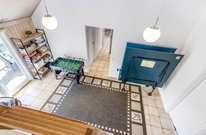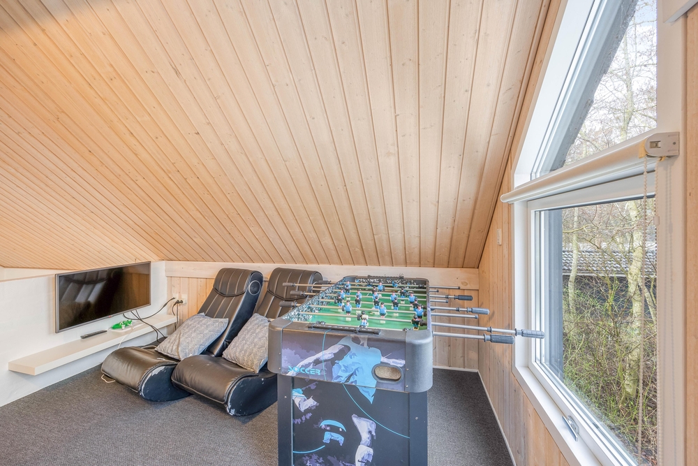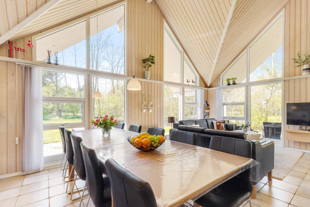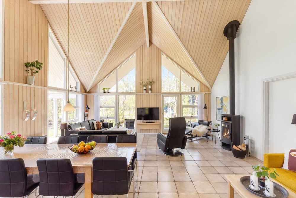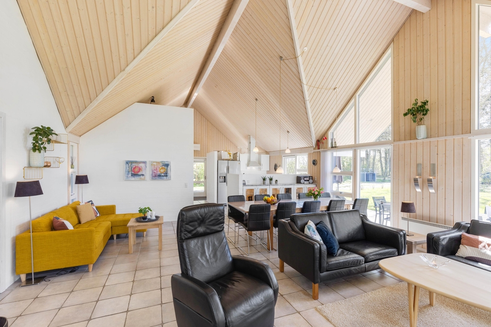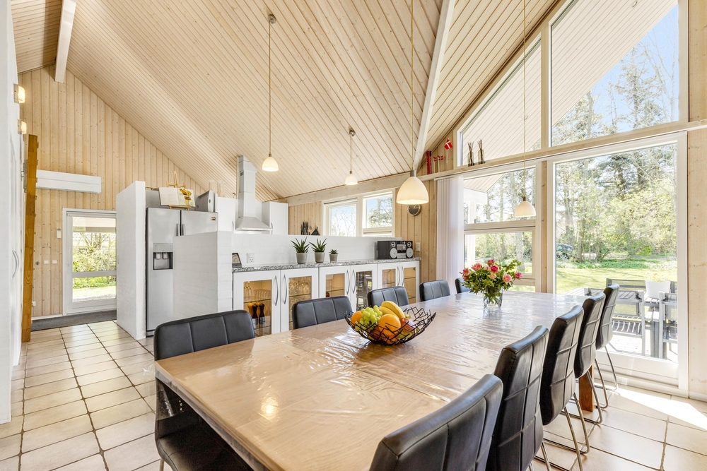 Opholdsrummene er nøje indrettet for at sikre både fredfyldte stunder ved den knitrende brændeovn og livligt samvær i det åbne og lyse fællesareal. Store vinduer slipper et blødt lys ind, der smukt falder over køkkenet, spisestuen og stuen, der glider sammen i en elegant symbiose, med lækre møbler og bordtennis.