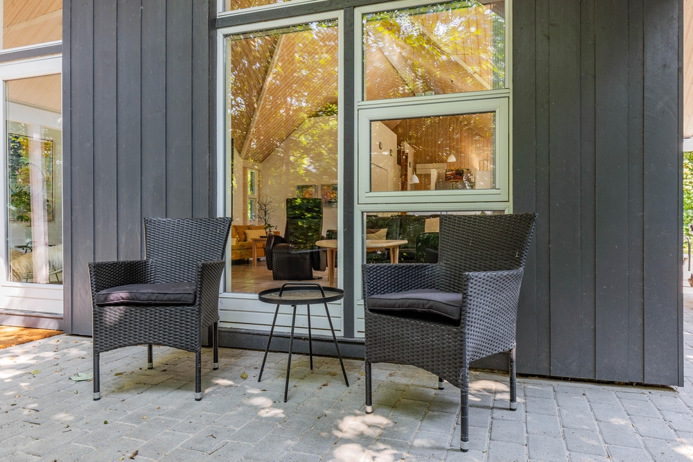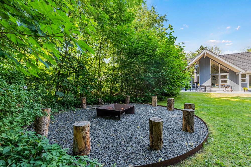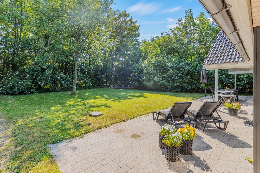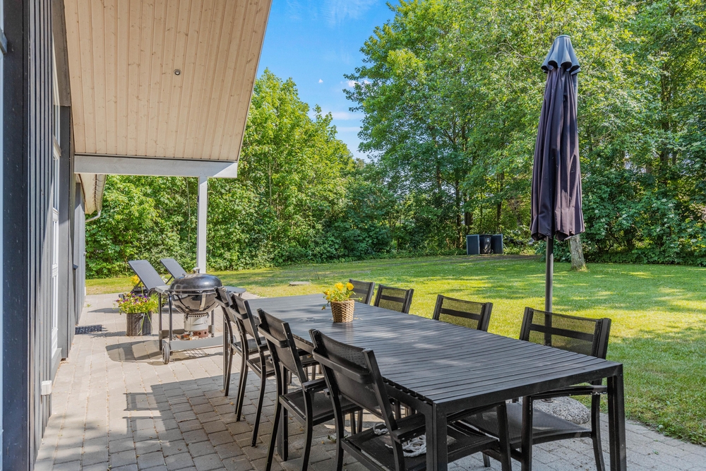 Det afskærmede og overdækkede terrasseområde er perfekt til at nyde måltider i det fri, uanset vejret. Her kan I samle jer omkring grillen og tilberede lækre retter, mens I nyder den fredelige atmosfære og fuglesang fra de omkringliggende træer. Terrassen fungerer som et perfekt sted til både frokost i solen og hyggelige aftener under de stjerneklare himmelstræk.