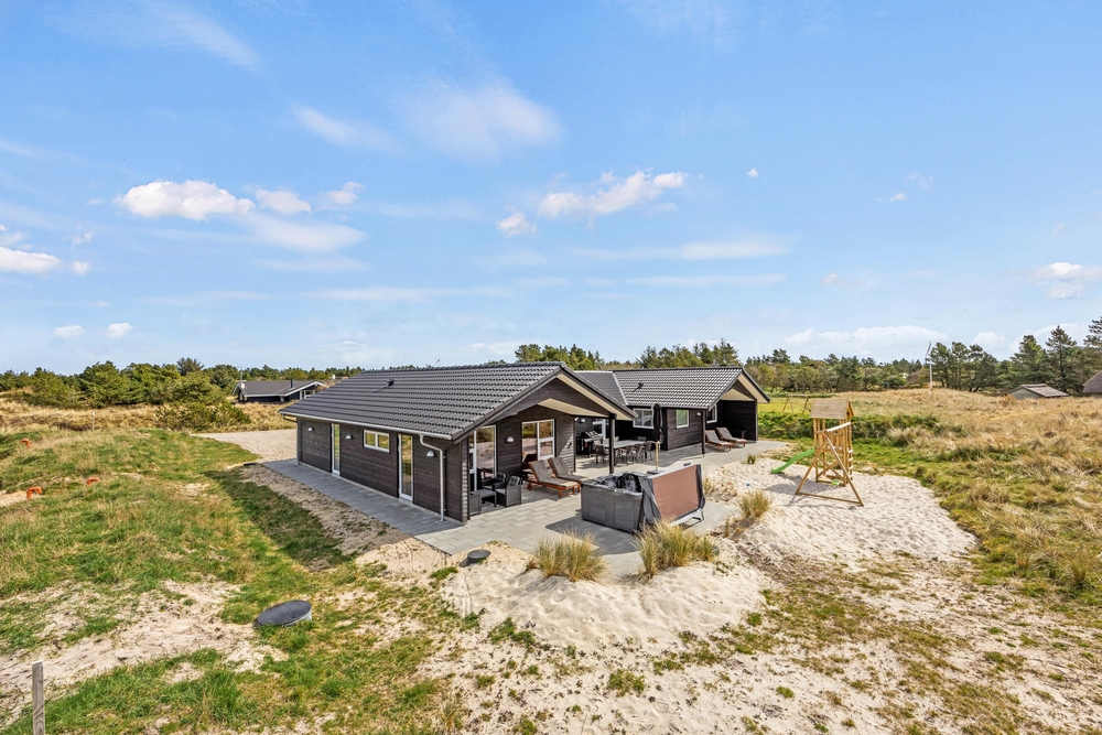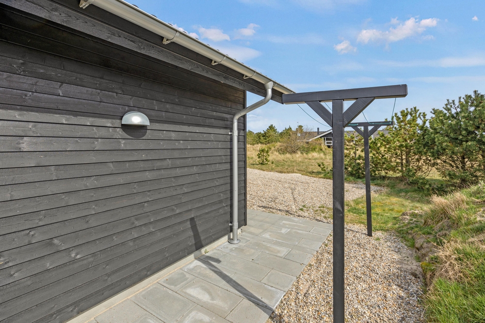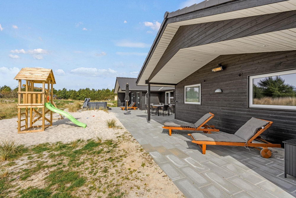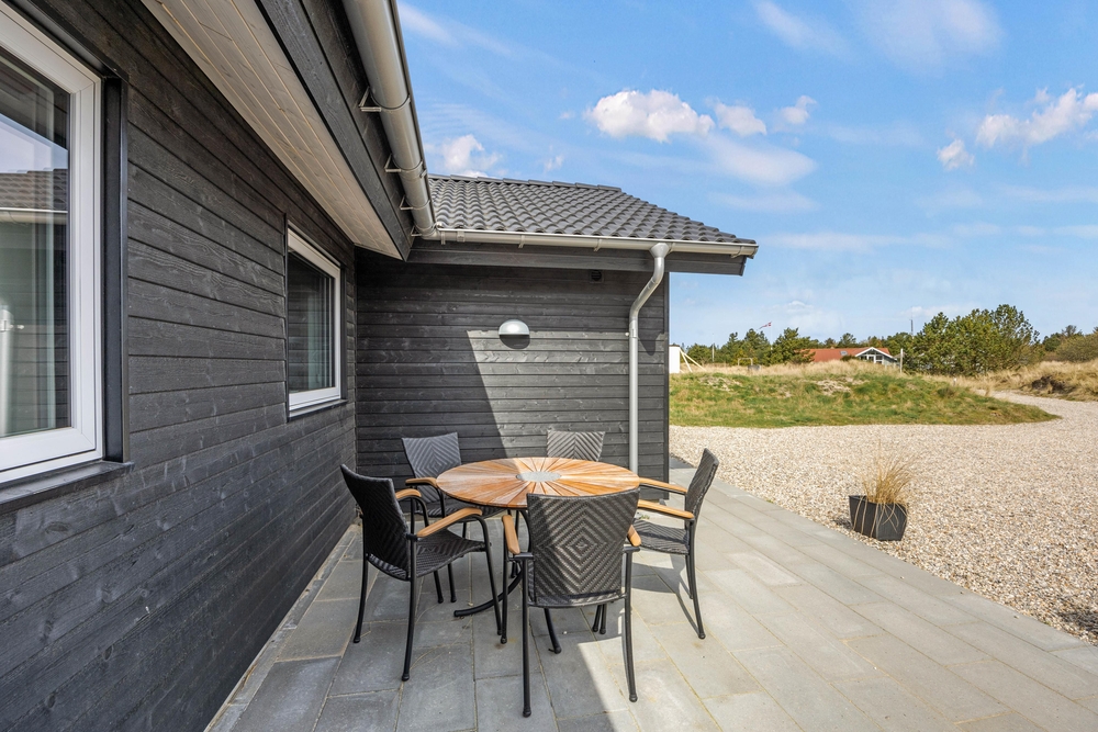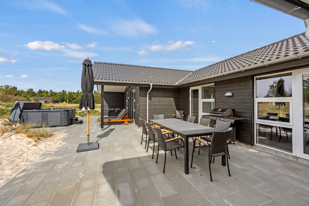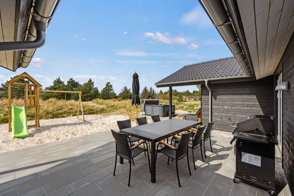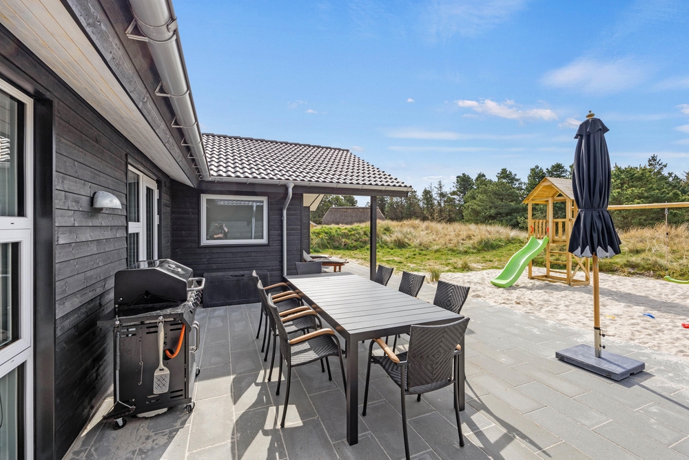 Sommerhuset er beliggende på en dejlig stor klitgrund og har en skøn fliseterrasse i syd. Fra køkkenet har I adgang til terrassen, hvor I kan holde grillaftner med lækre bøffer på grillen og et godt glas vin. Når timerne bliver sene, og luften bliver kølig, kan I gøre brug af terrassevarmeren. En del af grunden og terrassen er indhegnet, så hverken børn eller hunde kan løbe bort ? lågerne til hegnet er sågar børnesikrede, så de ikke selv kan åbne lågerne.