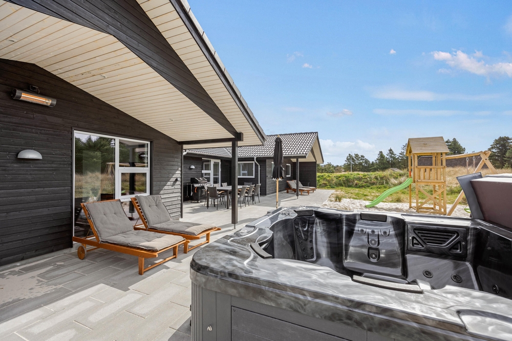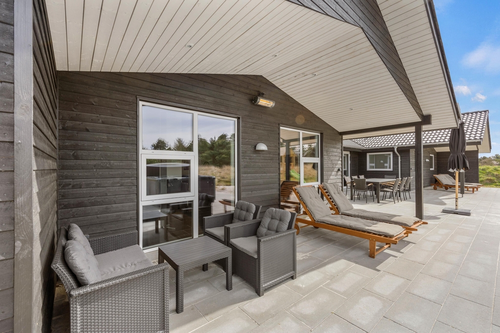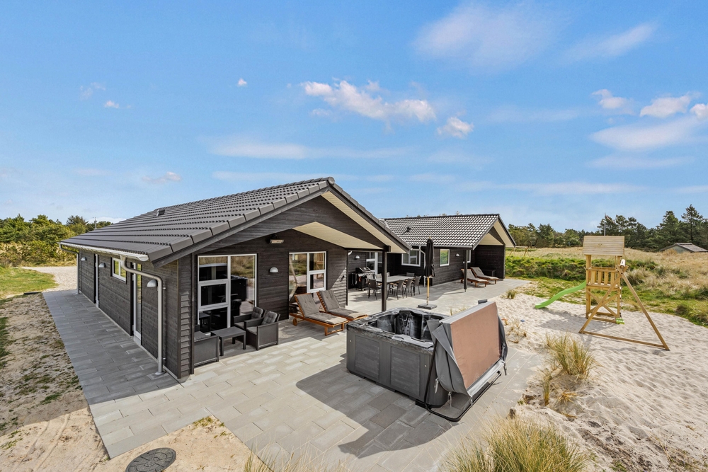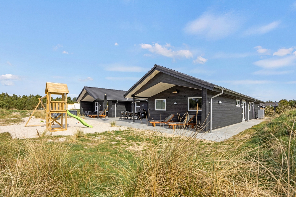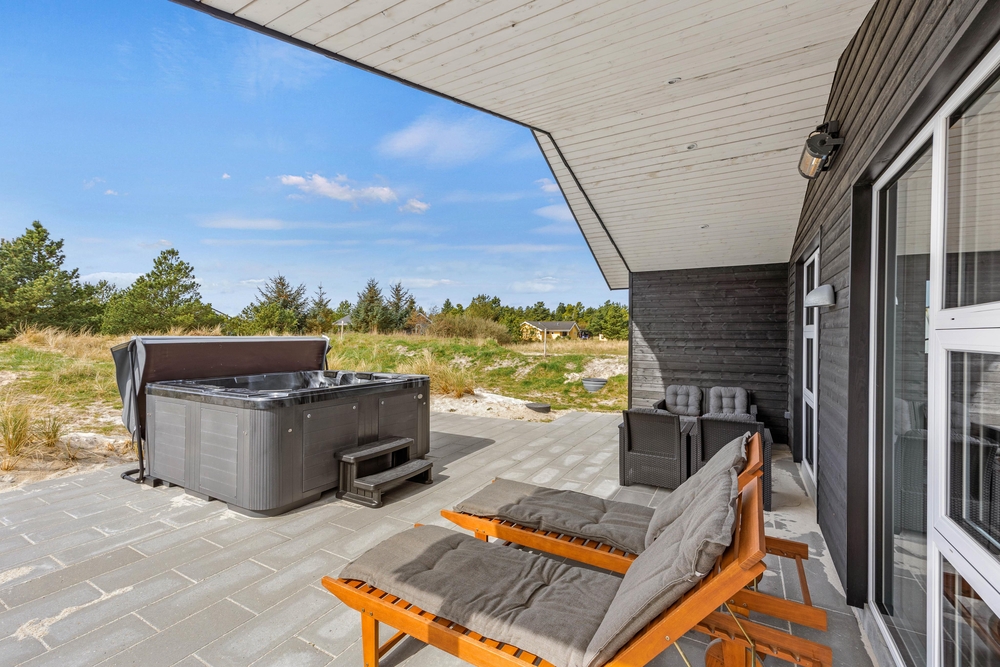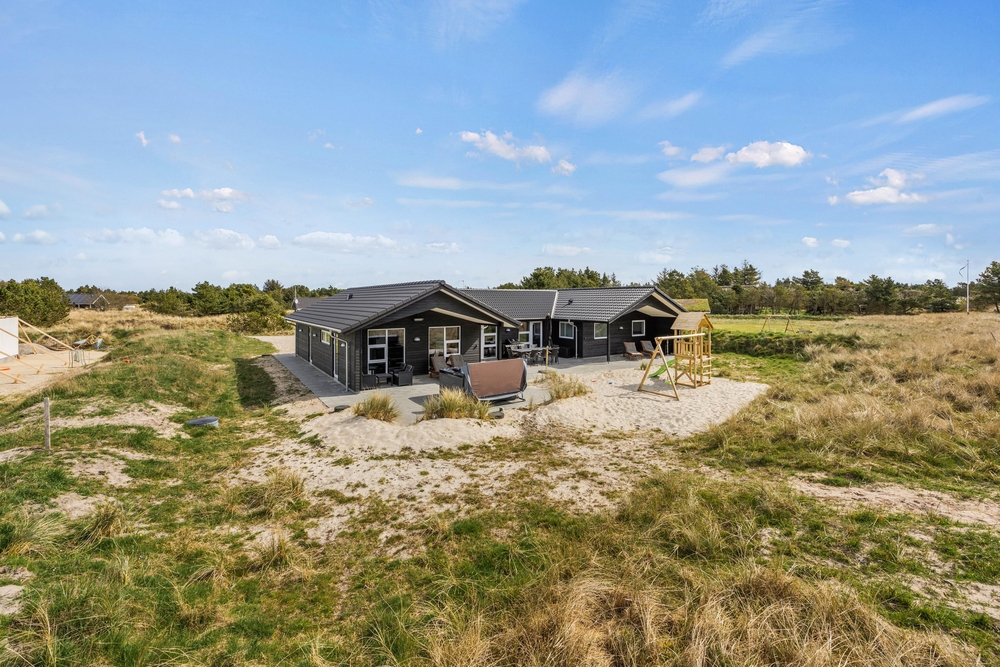 Sommerhuset er beliggende på en dejlig stor klitgrund og har en skøn fliseterrasse i syd. Fra køkkenet har I adgang til terrassen, hvor I kan holde grillaftner med lækre bøffer på grillen og et godt glas vin. Når timerne bliver sene, og luften bliver kølig, kan I gøre brug af terrassevarmeren. En del af grunden og terrassen er indhegnet, så hverken børn eller hunde kan løbe bort ? lågerne til hegnet er sågar børnesikrede, så de ikke selv kan åbne lågerne.