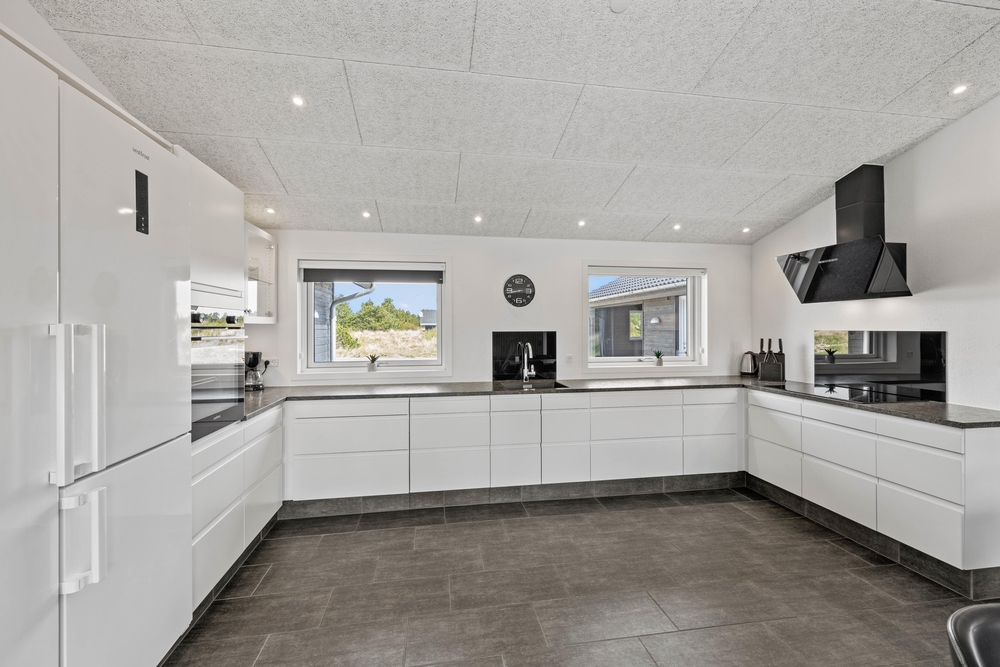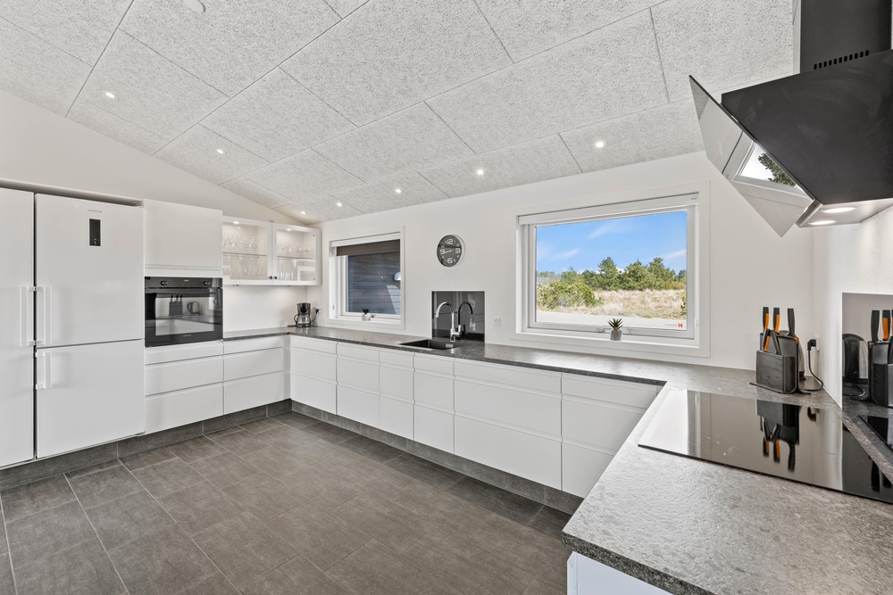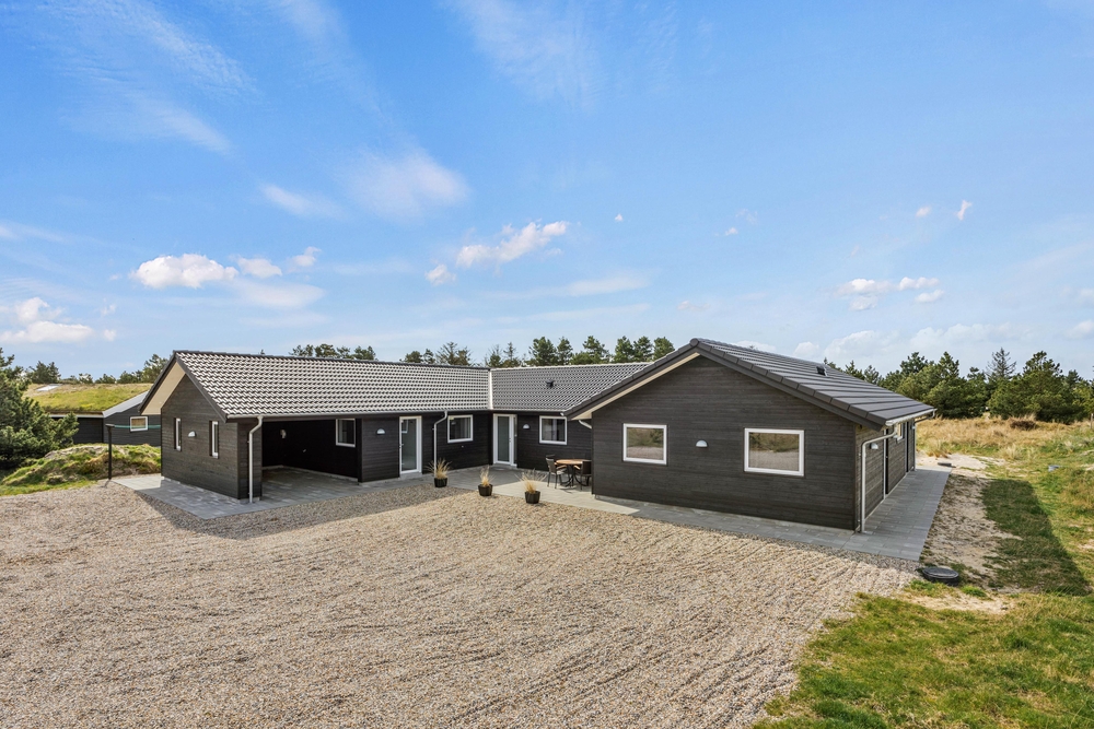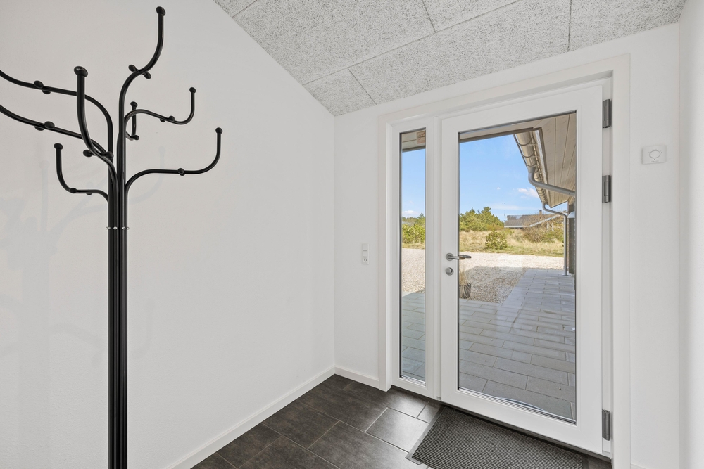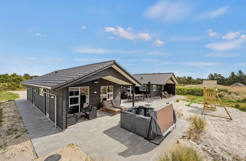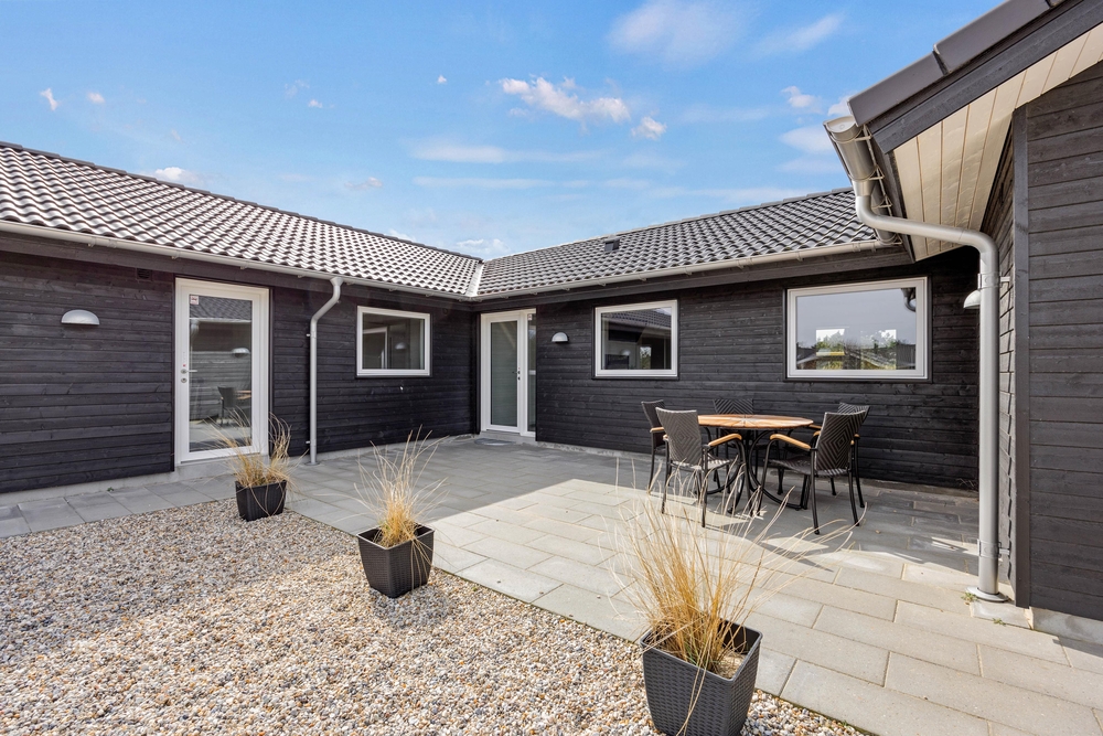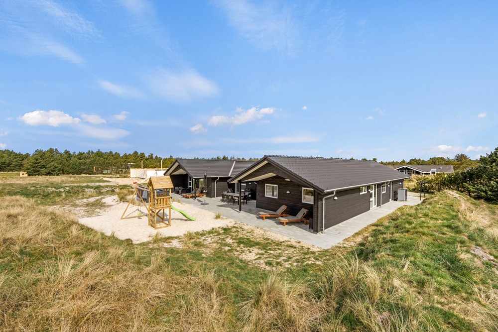 Sommerhuset er beliggende på en dejlig stor klitgrund og har en skøn fliseterrasse i syd. Fra køkkenet har I adgang til terrassen, hvor I kan holde grillaftner med lækre bøffer på grillen og et godt glas vin. Når timerne bliver sene, og luften bliver kølig, kan I gøre brug af terrassevarmeren. En del af grunden og terrassen er indhegnet, så hverken børn eller hunde kan løbe bort ? lågerne til hegnet er sågar børnesikrede, så de ikke selv kan åbne lågerne.