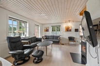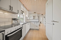 Fra stue i stueetagen er det åbent op ind til det funktionelle køkken, og rummet fungerer som feriehusets samlingspunkt. I køkkenet kan I sammen fremtrylle en lækker menu. Det er praktisk udstyret med blandt andet en fryser på 100L opvaskemaskine, der står for oprydningen.