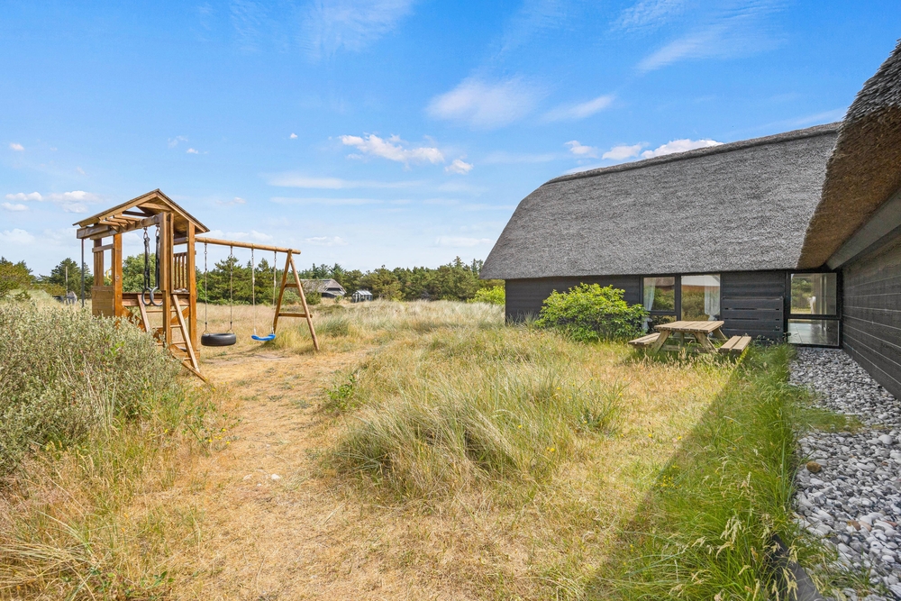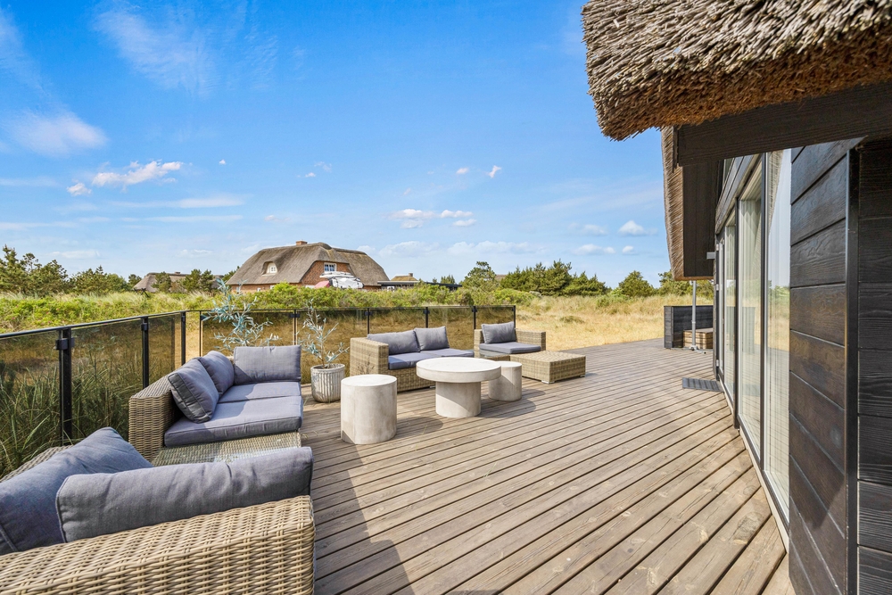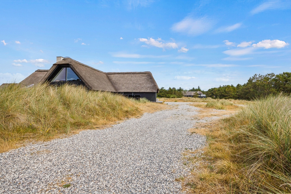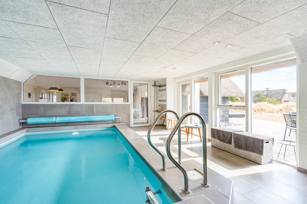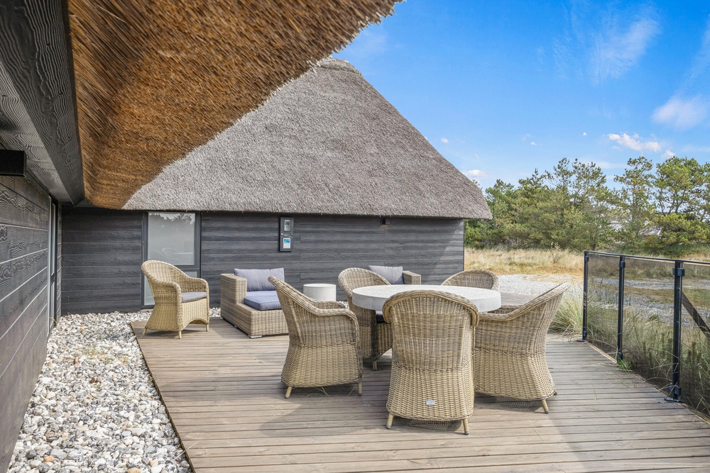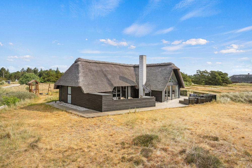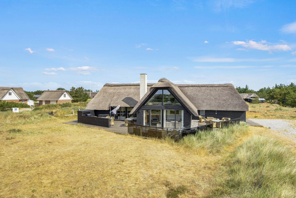 Dette stilfuld indrettede stråtækte poolhus har plads til helt op til 10 feriegæster, og hunden er også velkommen. Feriehusets indre rummer blandt andet en lækker poolafdeling med både swimmingpool, sauna og dampbad samt et aktivitetsrum. Prikken over i?et er selvfølgelig husets fantastiske beliggenhed kun fem minutters gang fra stranden og Blåvands centrum.