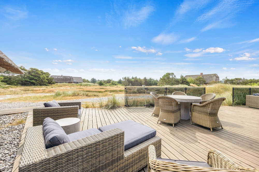Fra både poolafdelingen og alrummet er der udgang til ferieboligens skønne terrasse. Her finder alle feriegæster hurtigt en plads i solen, og på terrassens afskærmede del sidder I altid i læ af vinden. Der er suppleret op med masser af havemøbler og liggestole, og på de lune sommeraftener er det oplagt at tænde op i gasgrillen.
