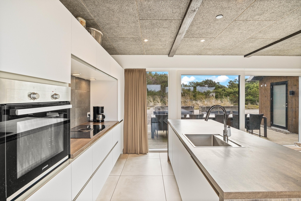 I det lyse og rummelige køkken med kogeø og moderne udstyr kan I være sammen om madlavningen og bagefter nyde den gode mad ved det store spisebord. I kan også nyde udsigten til den vajende marehalm gennem de store vinduespartier i køkkenet, hvor der desuden er udgang til den dejlige terrasse.