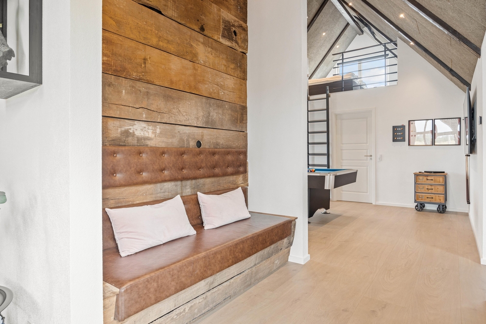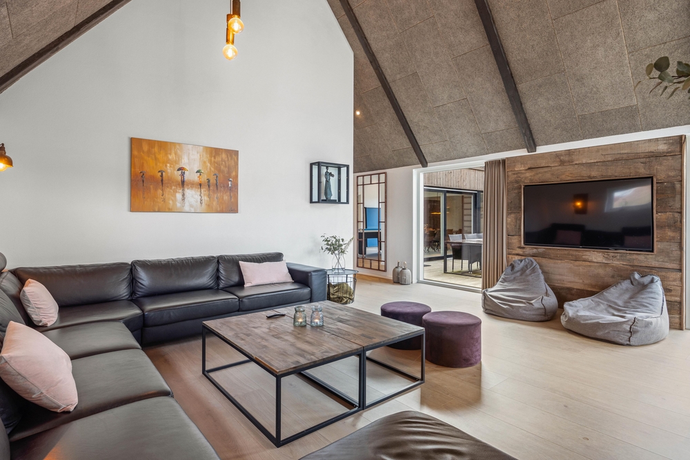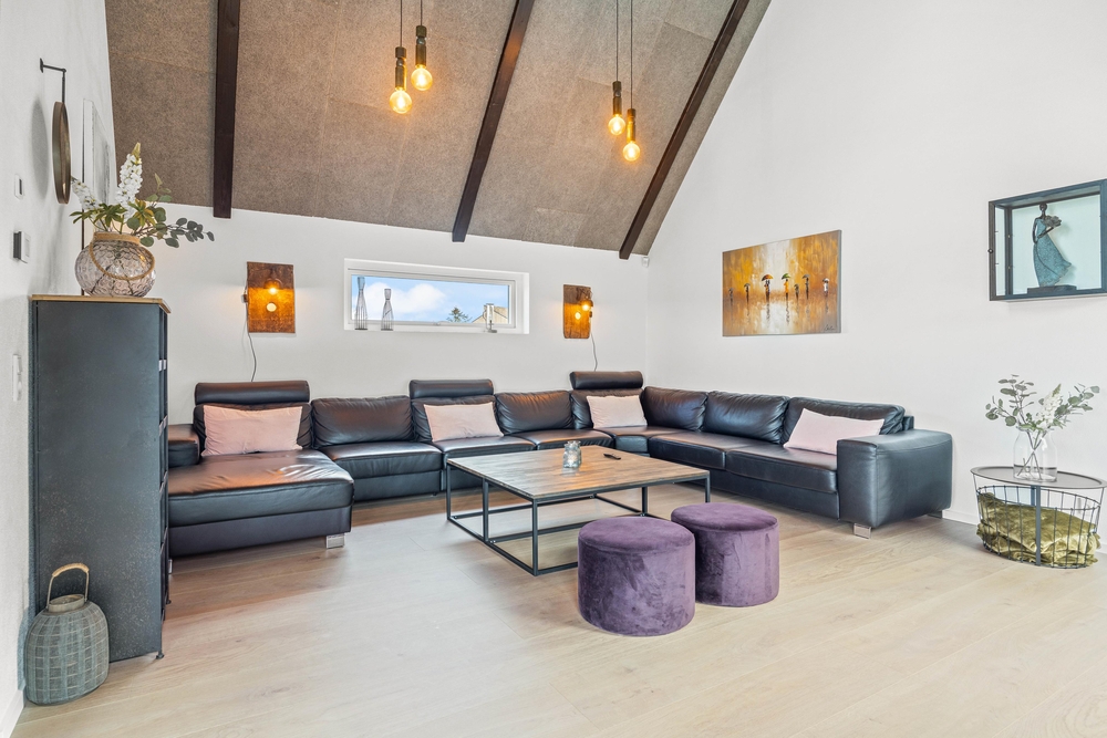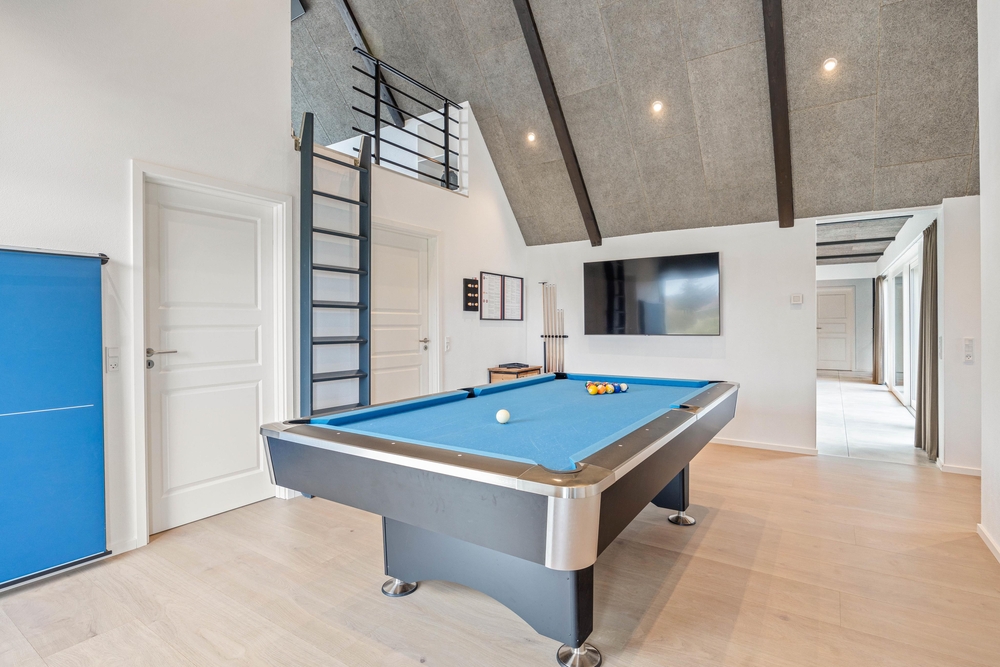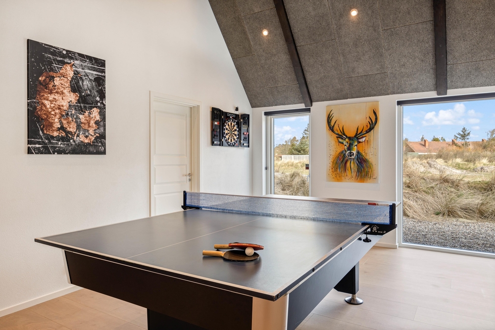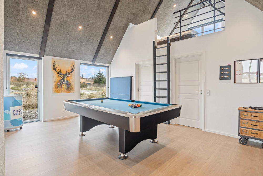 Sommerhuset på Sønder-Vasevej 2B byder på alt det udstyr, som I har brug for på en ferie og mere til. I det store opholdsrum er der højt til loftet, og de flotte kvalitetsmøbler indbyder til afslapning og fælles hygge. Ved siden af opholdsrummet ligger det store aktivitetsrum, hvor I kan afholde små turneringer i både billard og bordtennis.