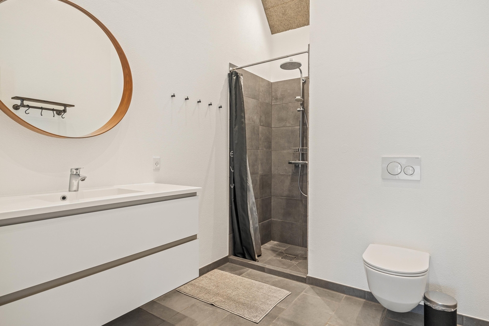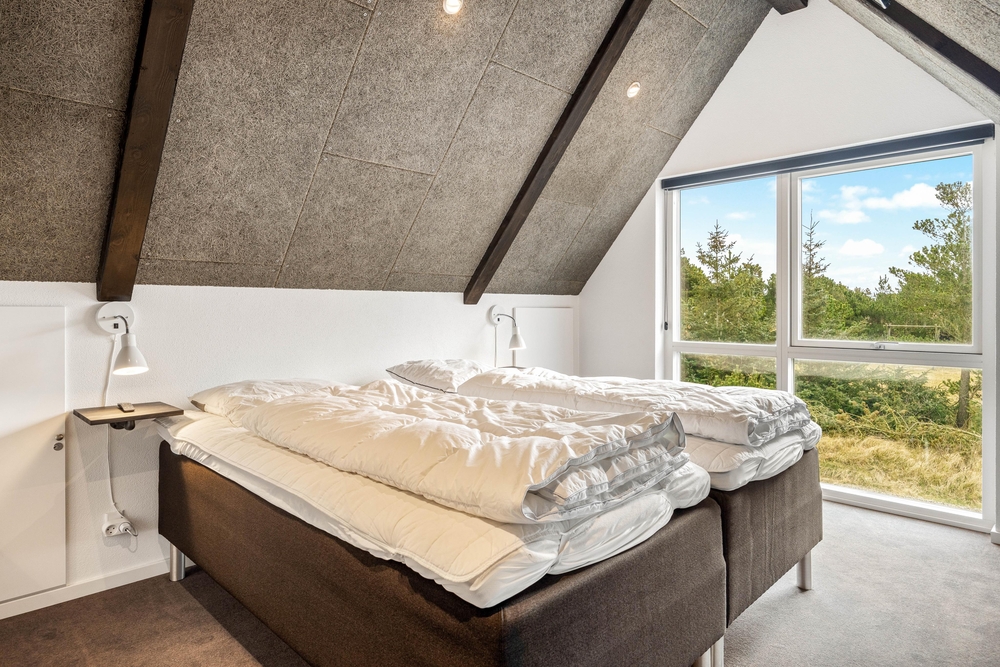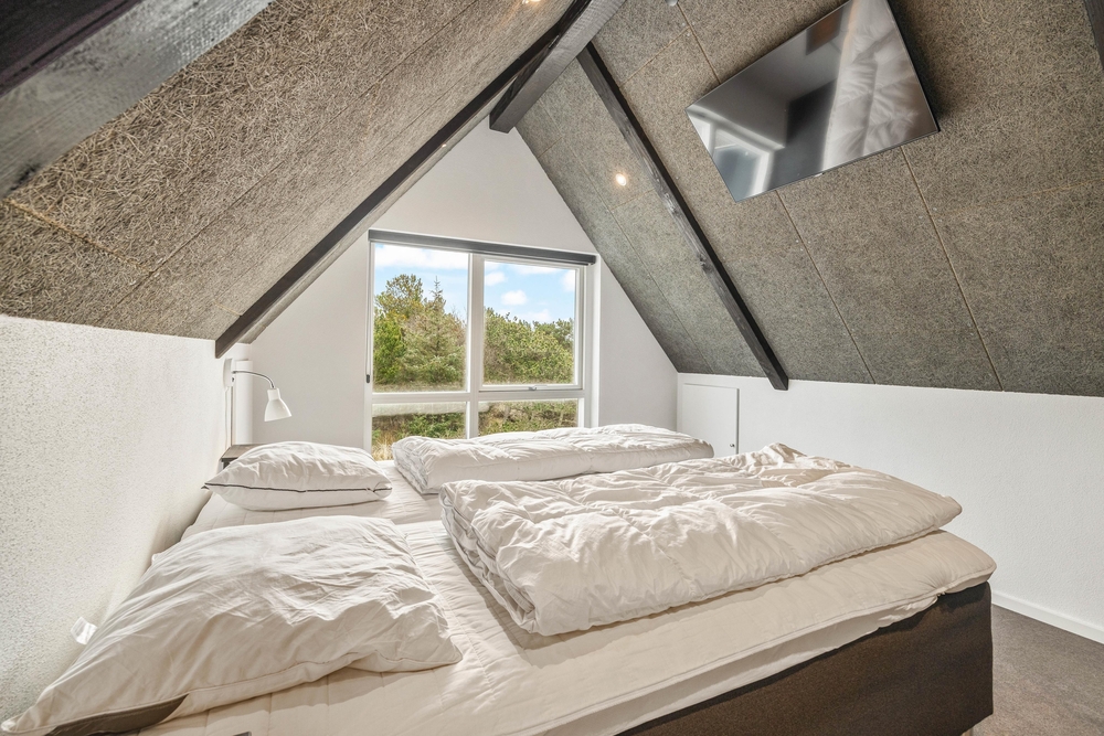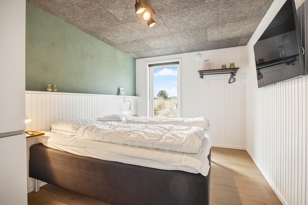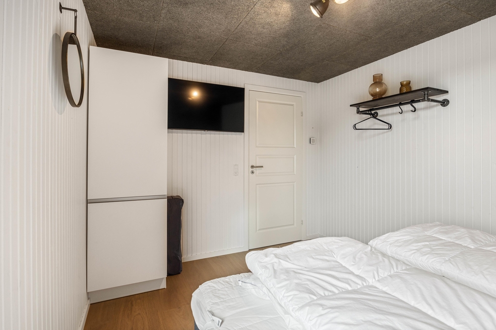 Sommerhusets to badeværelser er moderne og elegant indrettet og har naturligvis gulvvarme. Sovepladserne er placeret på to forskellige sider af huset, så I kan dele dem godt op ? f.eks. hvis I holder ferie med 2 familier. I alt er der 4 soveværelser med komfortable dobbeltsenge og 2 hemse med i alt 4 sovepladser. Alle soveværelser er smukt indrettet med lyse paneler og skabe og er udstyret med eget fjernsyn.