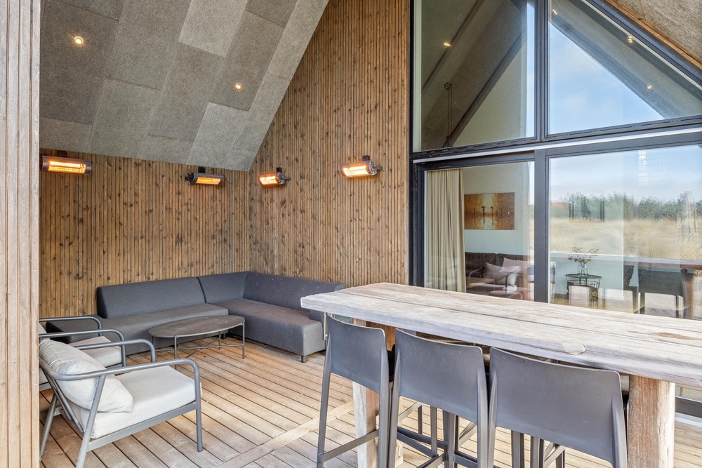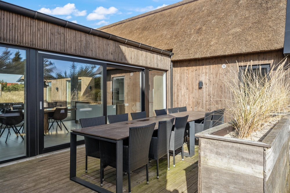 Fra opholdsstuen har I adgang til den rummelige, overdækkede terrasse, hvor I kan sidde i læ for Vestenvinden og på de kølige dag få varmen fra strålevarmerne. Fra køkkenet er der adgang til den åbne og delvis afskærmede terrasse, hvor I kan nyde en dejlig middag kreeret af feriens grillmester. Skulle I have lyst til en middagslur, eller er vejret til solbadning, er der naturligvis solvogne og parasol til jeres rådighed.