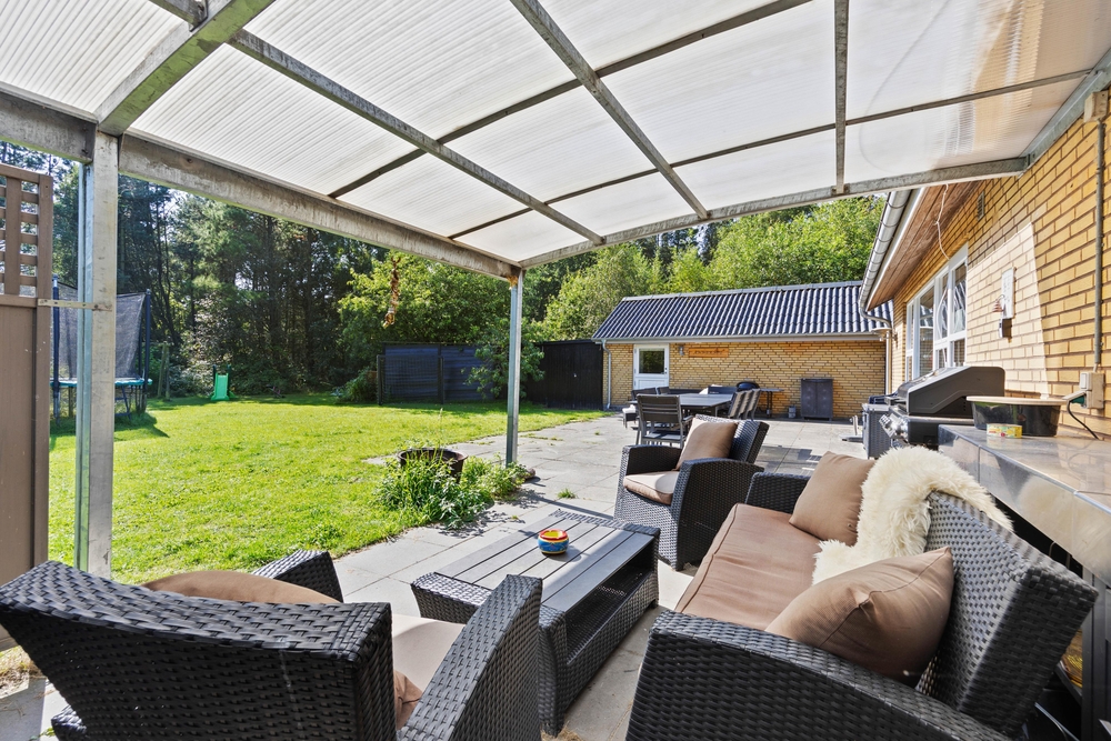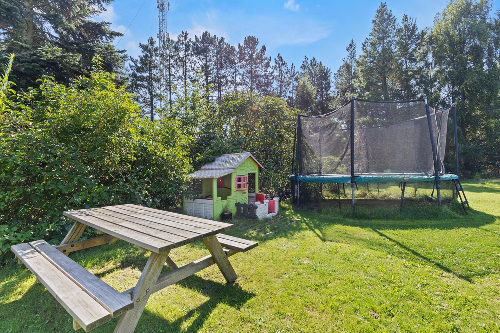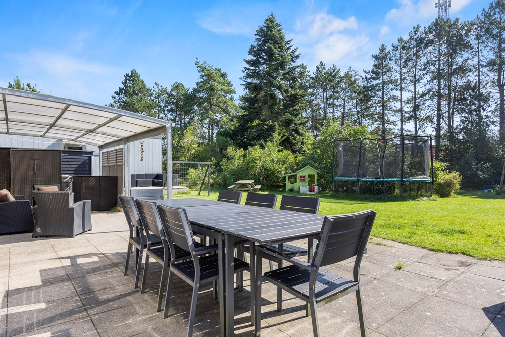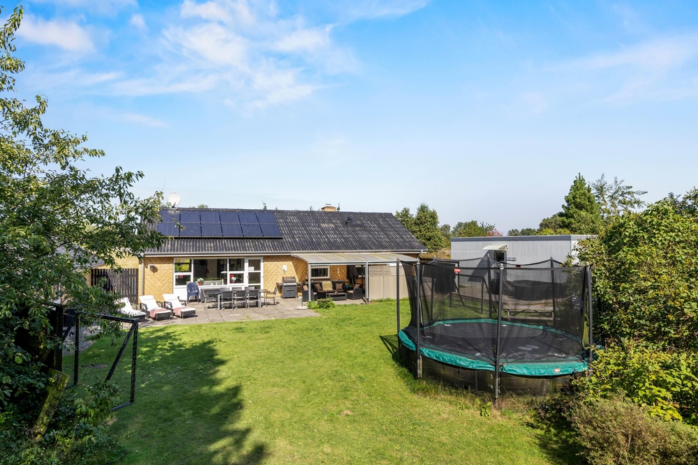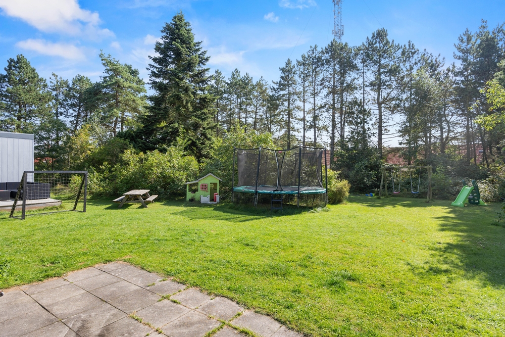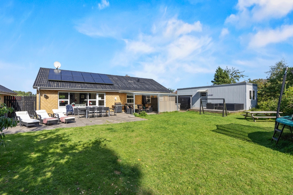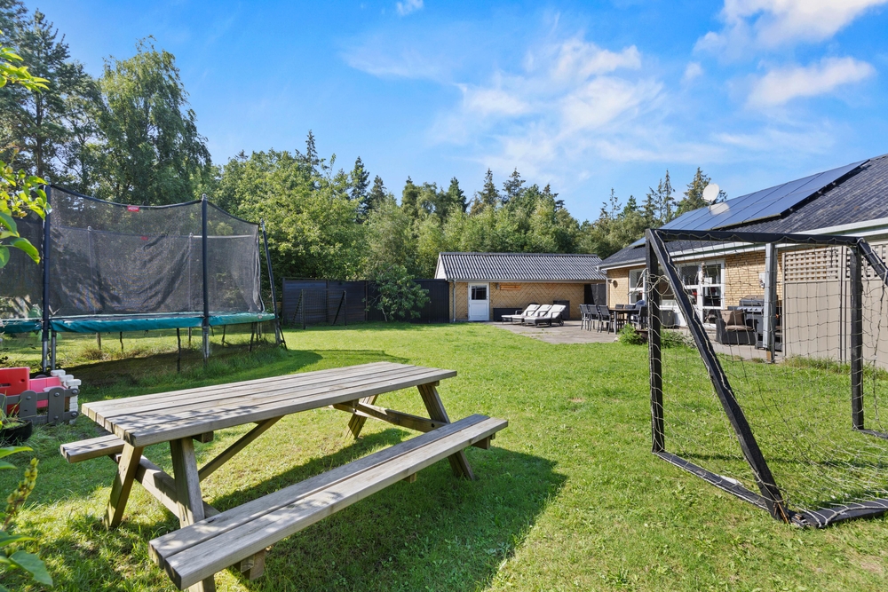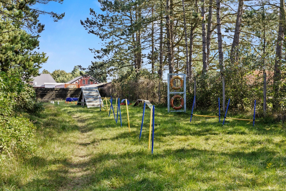 Slap af på terrassen med solbadning i de komfortable liggestole eller træk jer tilbage i havemøblerne, så I kan følge med i de øvrige aktiviteter herude. Til børnene er der sandkasse, gynge, legehus, trampolin, rutsjebane, fodboldmål, basketballkurv og 3-i-1-legebord, så de behøver ikke at kede sig. Agilitybanen til hunde er en oplagt øveplads, hvor hundene både bliver udfordret fysisk og mentalt. Udekøkkenet og gasgrillen trækker nok mere i de voksne, som kan tilberede et lækkert fælles grillmåltid, som I kan nyde sammen, imens skyggerne bliver lange. Tænd for terrassevarmeren, hvis det begynder at blive køligt, det forlænger samværet og øger hyggen. Hele haven er hegnet ind med låger og hegn, hvilke sørger for, at både børn og hunde ikke kan fare vildt.