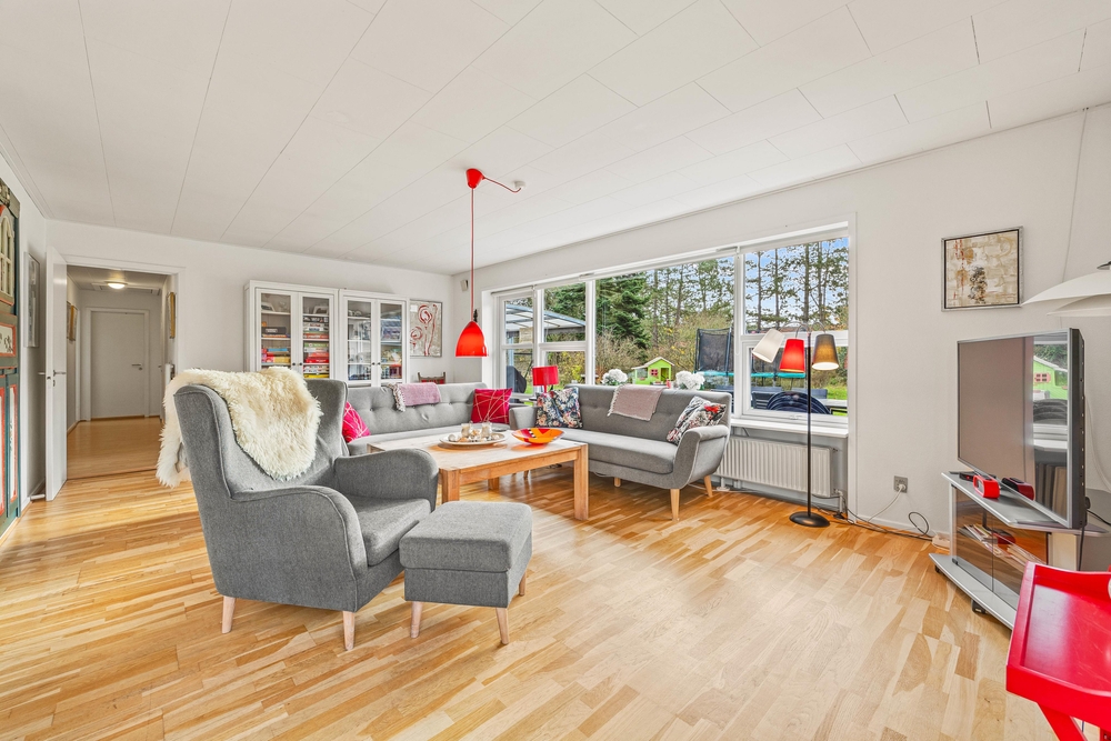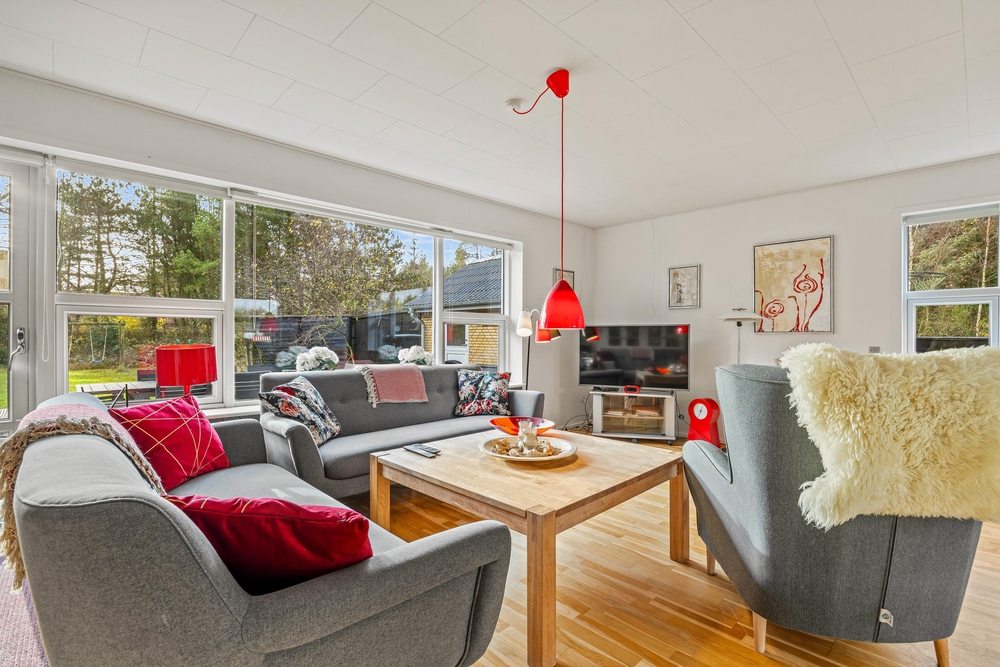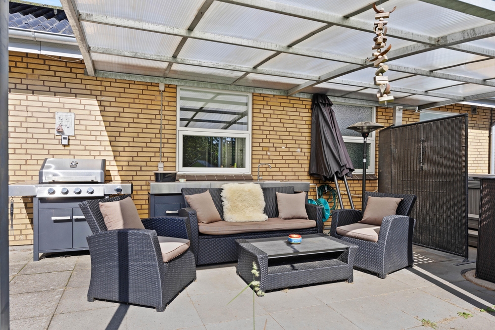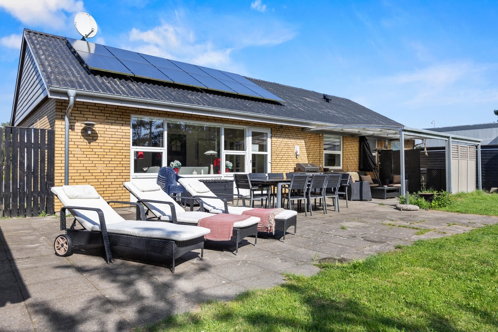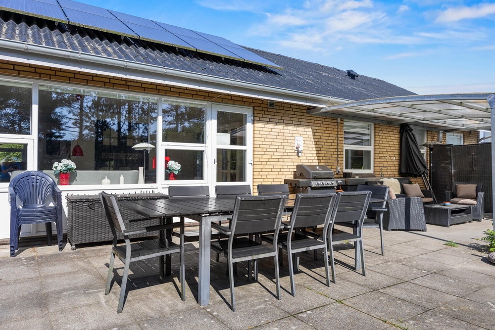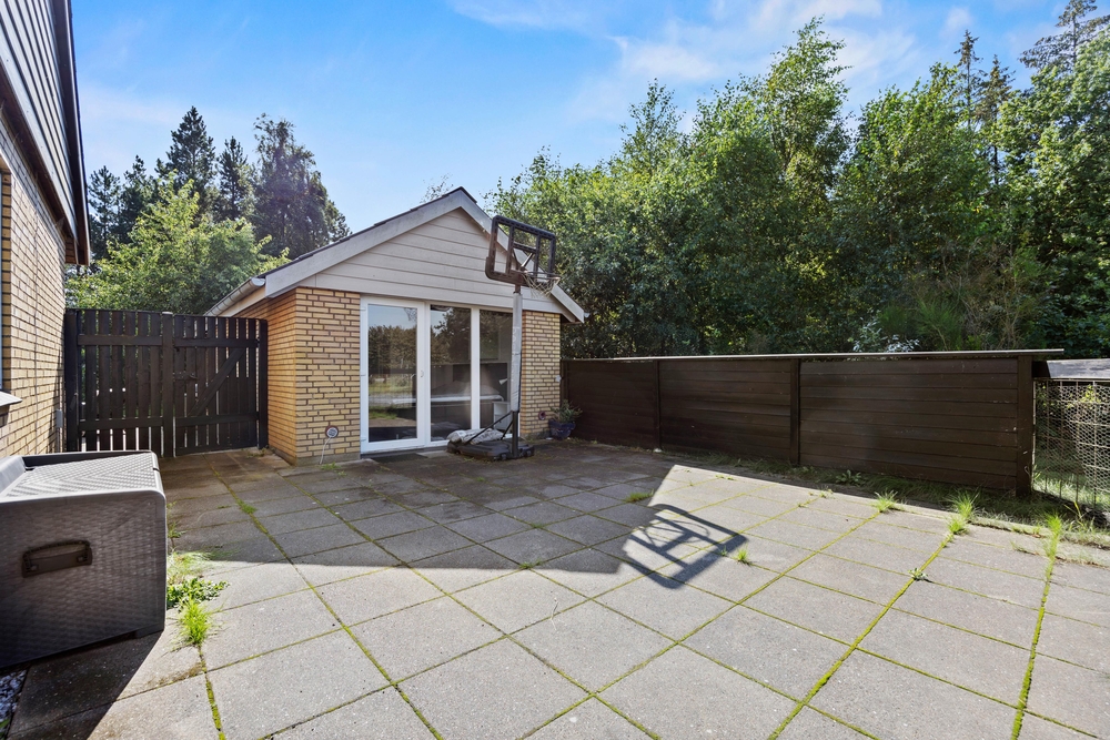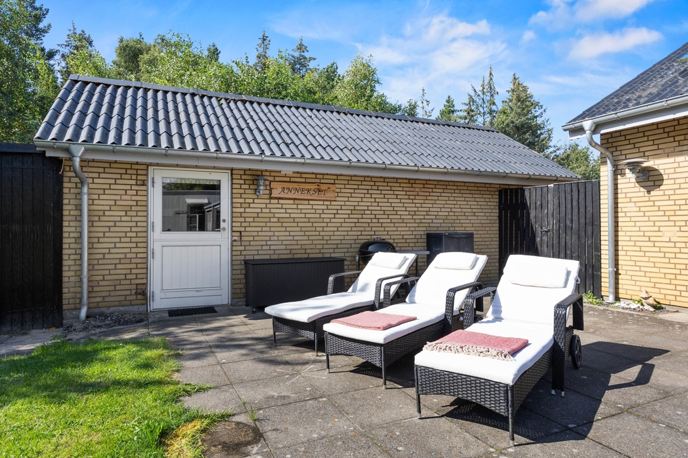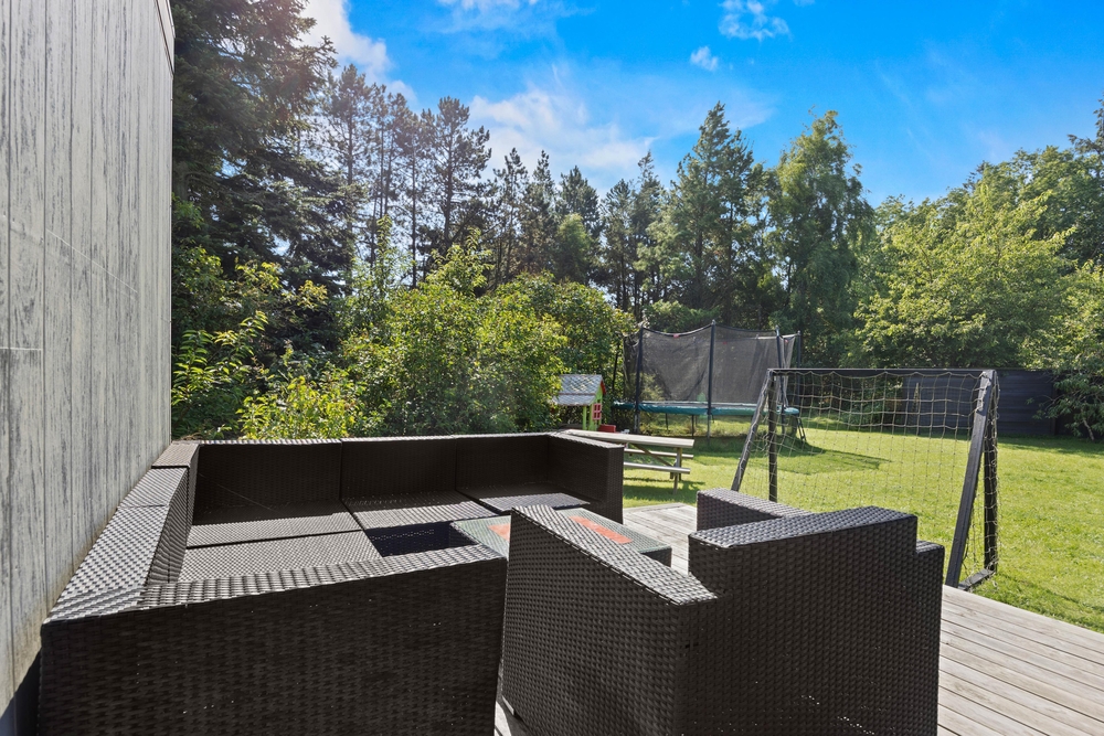 Slap af på terrassen med solbadning i de komfortable liggestole eller træk jer tilbage i havemøblerne, så I kan følge med i de øvrige aktiviteter herude. Til børnene er der sandkasse, gynge, legehus, trampolin, rutsjebane, fodboldmål, basketballkurv og 3-i-1-legebord, så de behøver ikke at kede sig. Agilitybanen til hunde er en oplagt øveplads, hvor hundene både bliver udfordret fysisk og mentalt. Udekøkkenet og gasgrillen trækker nok mere i de voksne, som kan tilberede et lækkert fælles grillmåltid, som I kan nyde sammen, imens skyggerne bliver lange. Tænd for terrassevarmeren, hvis det begynder at blive køligt, det forlænger samværet og øger hyggen. Hele haven er hegnet ind med låger og hegn, hvilke sørger for, at både børn og hunde ikke kan fare vildt.