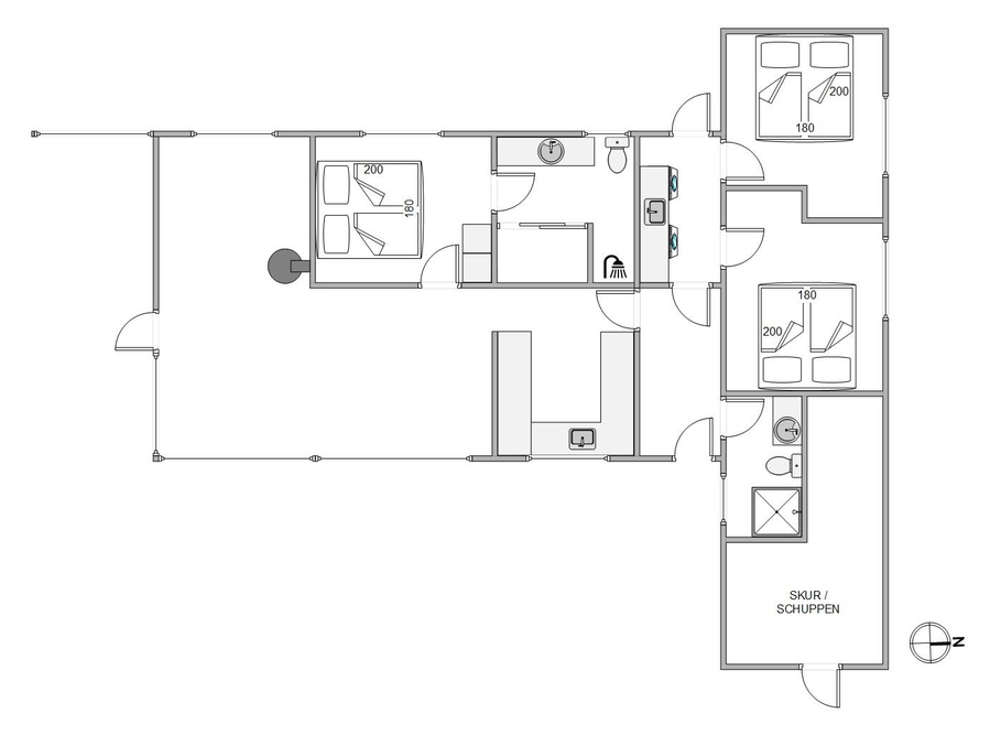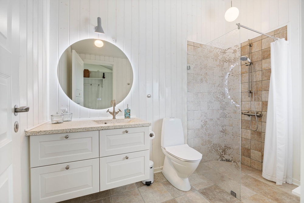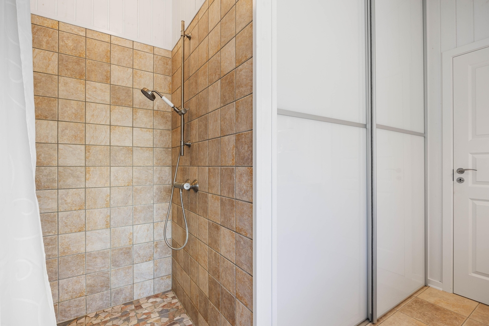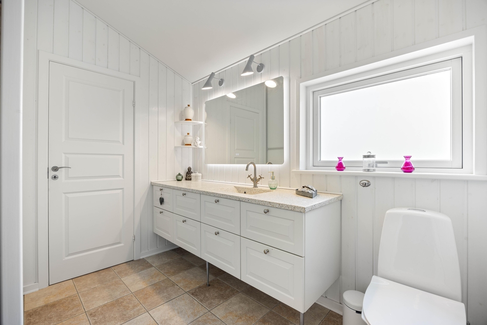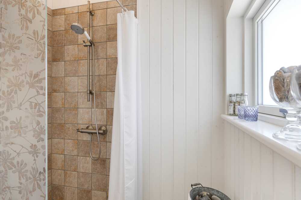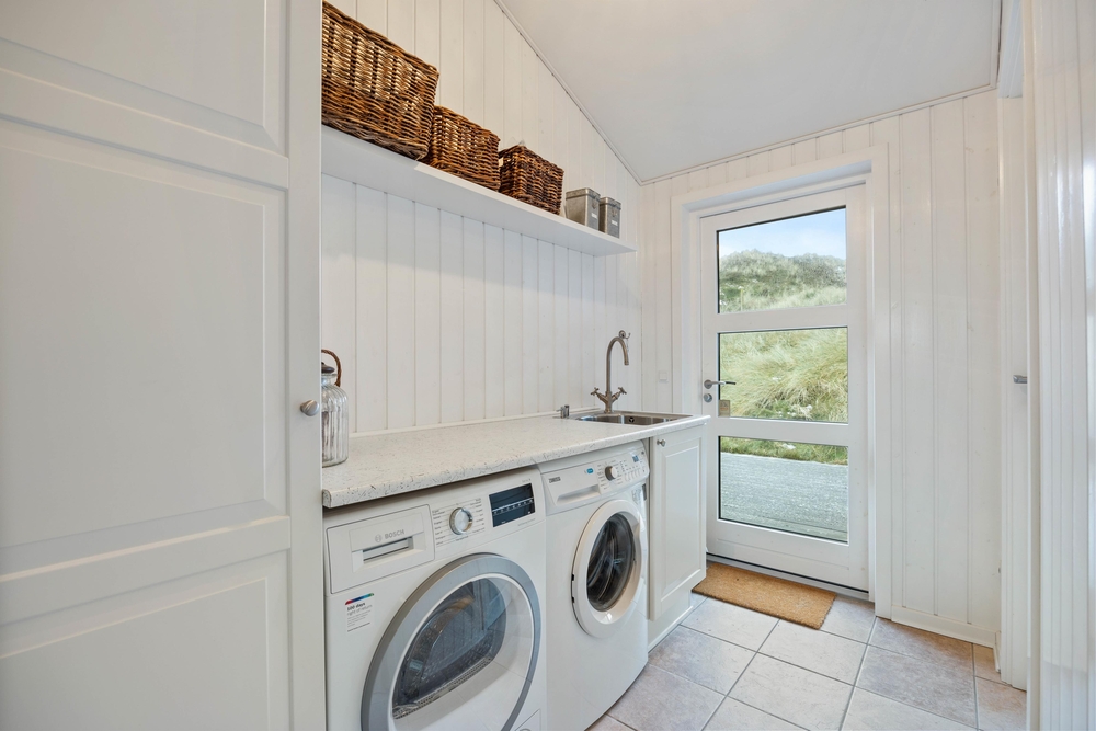 Sommerhuset er 109 m2 stort, og der er plads til 6 personer. Derfor er der 6 sovepladser fordelt i tre soveværelser, hvoraf de alle har dobbeltsenge. Derudover har sommerhuset 2 badeværelser, som begge har dejlig gulvvarme. I sommerhuset finder I også både en vaskemaskine og tørretumbler, så det bliver nemt for jer at vaske jeres tøj.