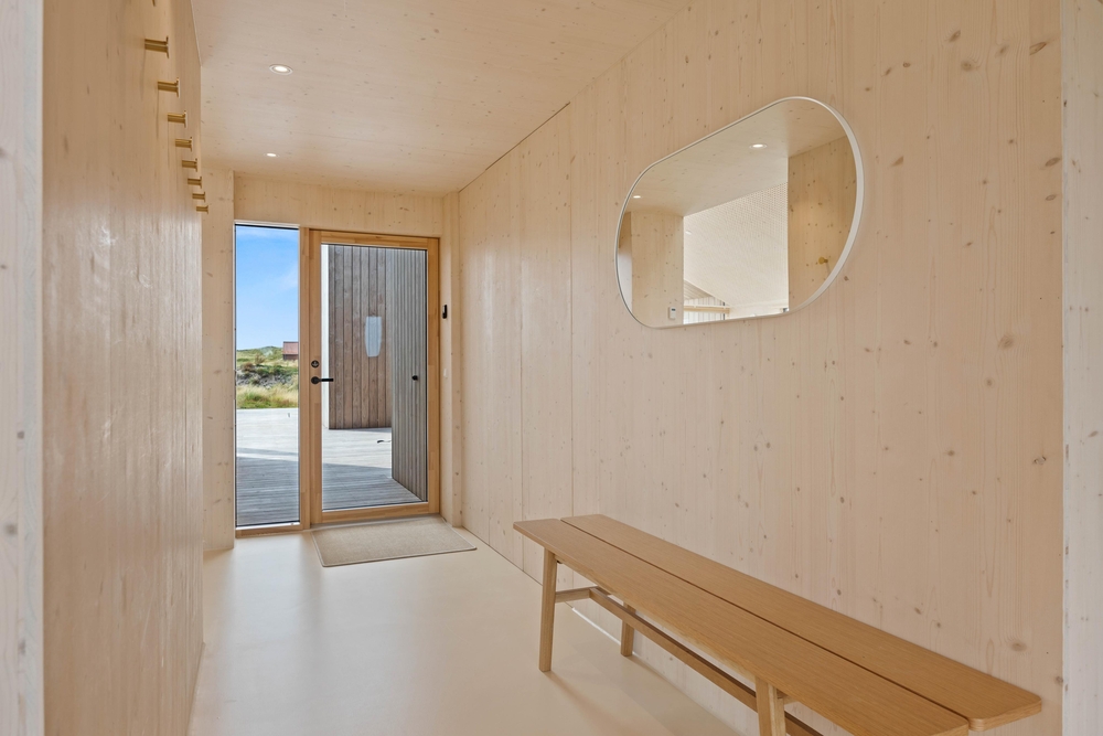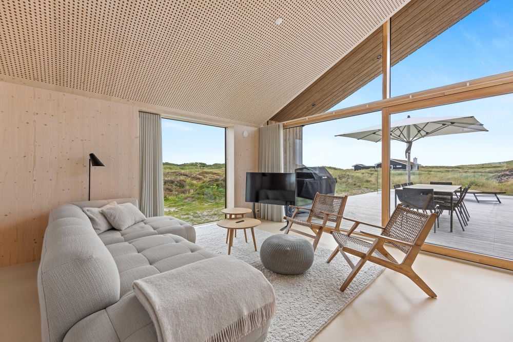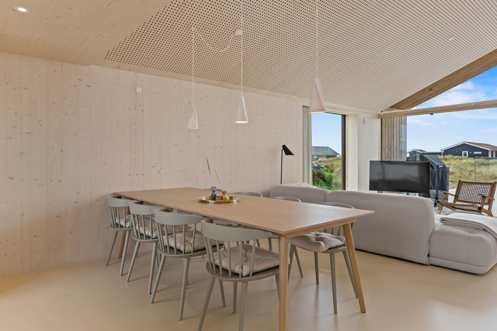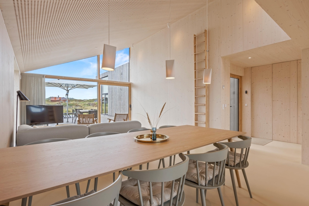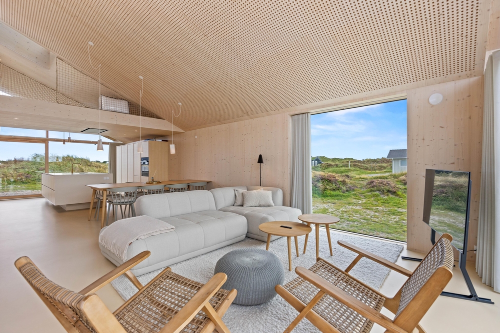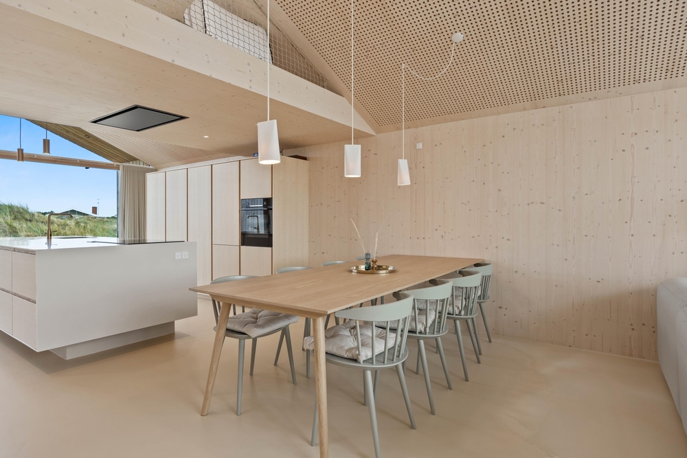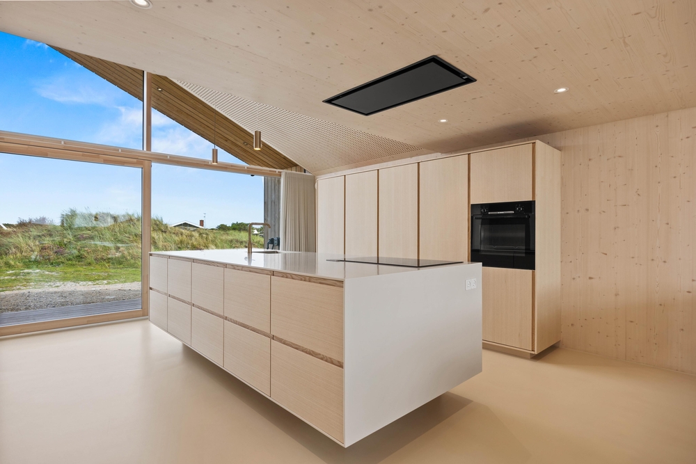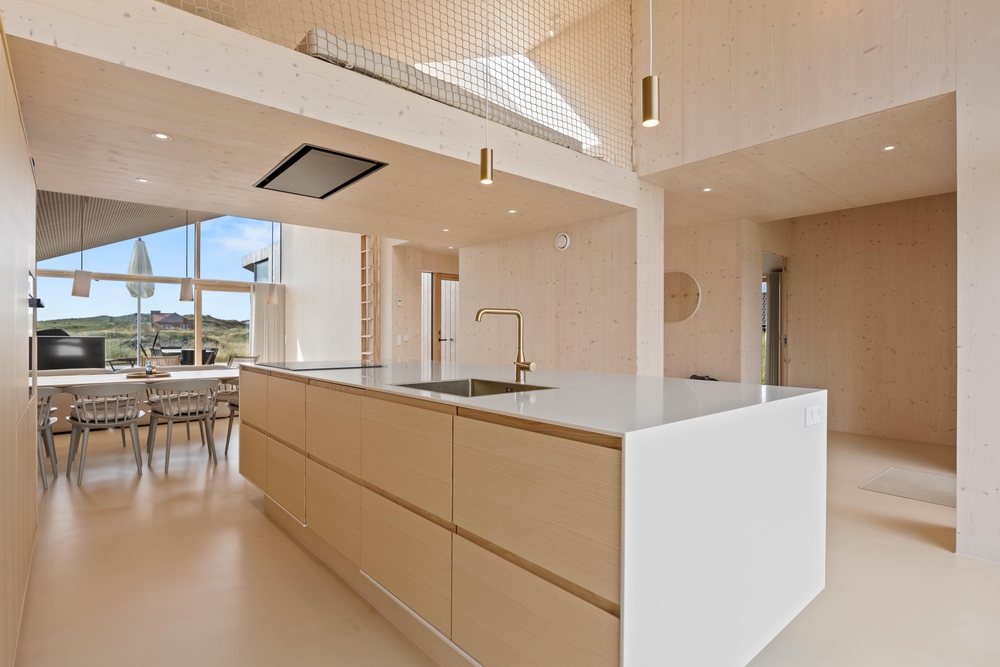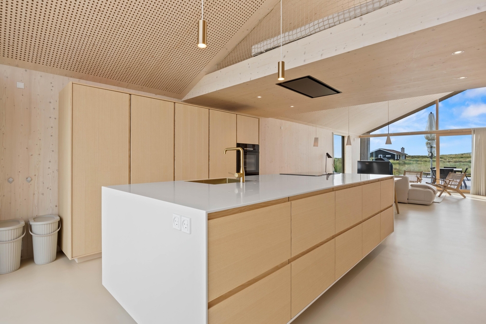 På Søndermarken 17, vil I straks føle jer hjemme, når I træder ind ad døren. Den lyse, nordiske indretning er gennemført hele vejen igennem. Slap af i sofaen samtidig med, at I føler jer omgivet af naturen og klitterne. Designet med stue/spiseplads/køkken i åbent plan gør, at alle kan være sammen, selv om I har gang i forskellige aktiviteter. Det arkitekttegnede køkken i asketræ og corian har mange faciliteter som opvaskemaskine, 2 køleskabe og en stor induktionskogeplade. Her er alt det nødvendige for at tilberede et vellykket måltid.