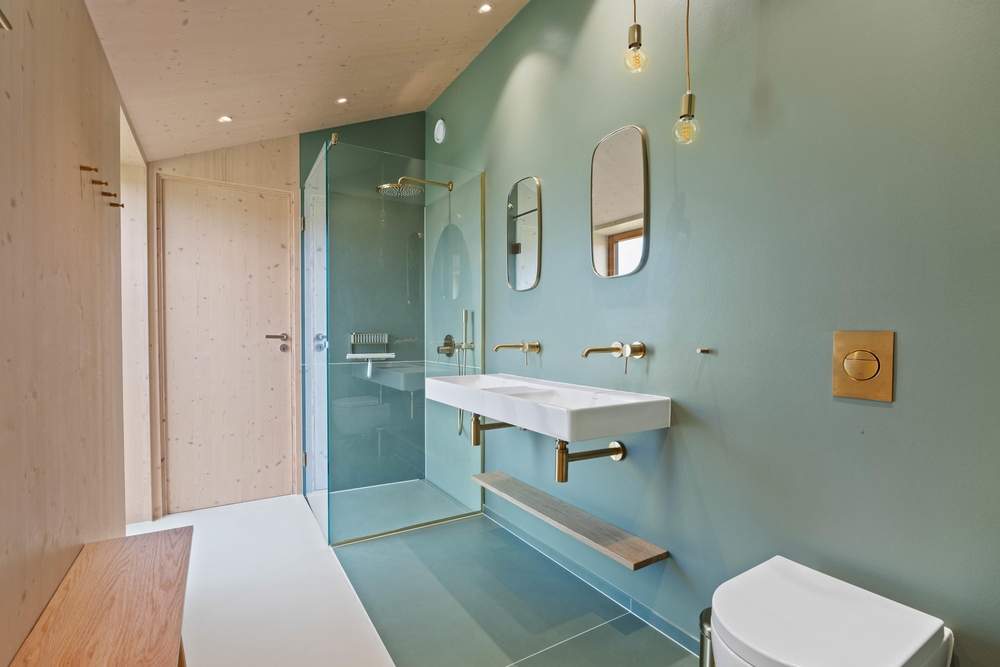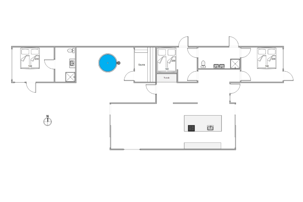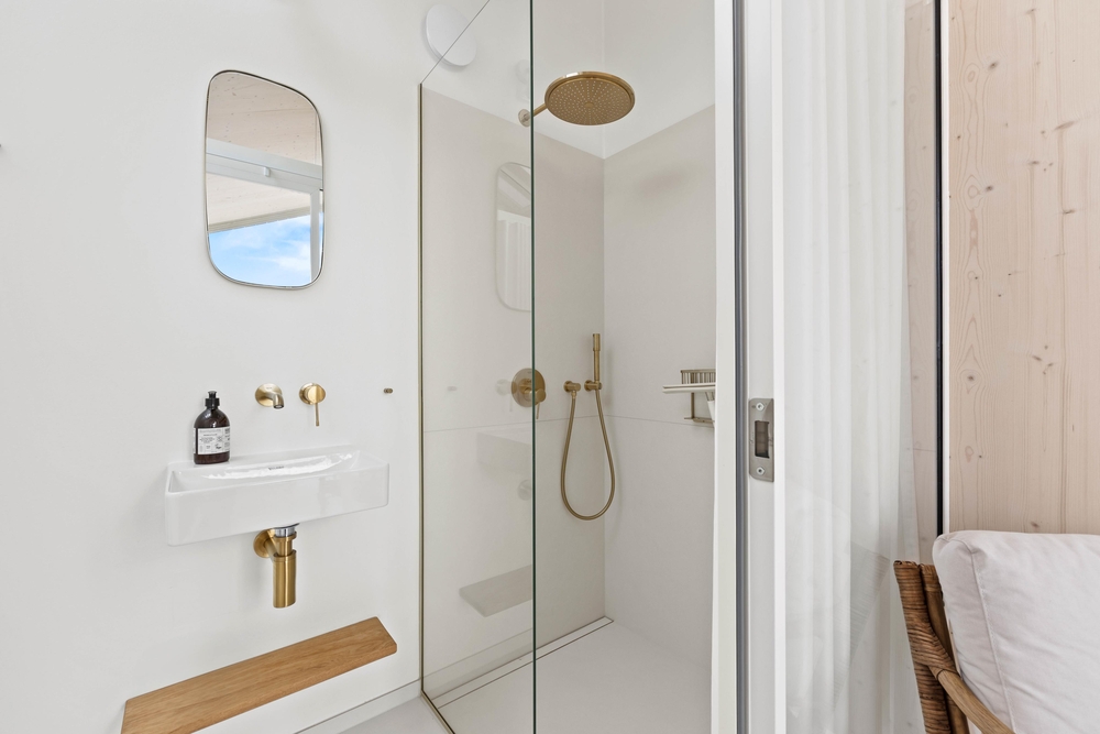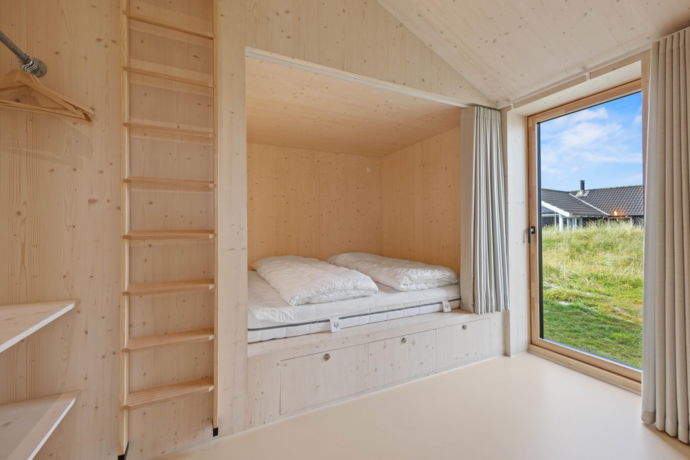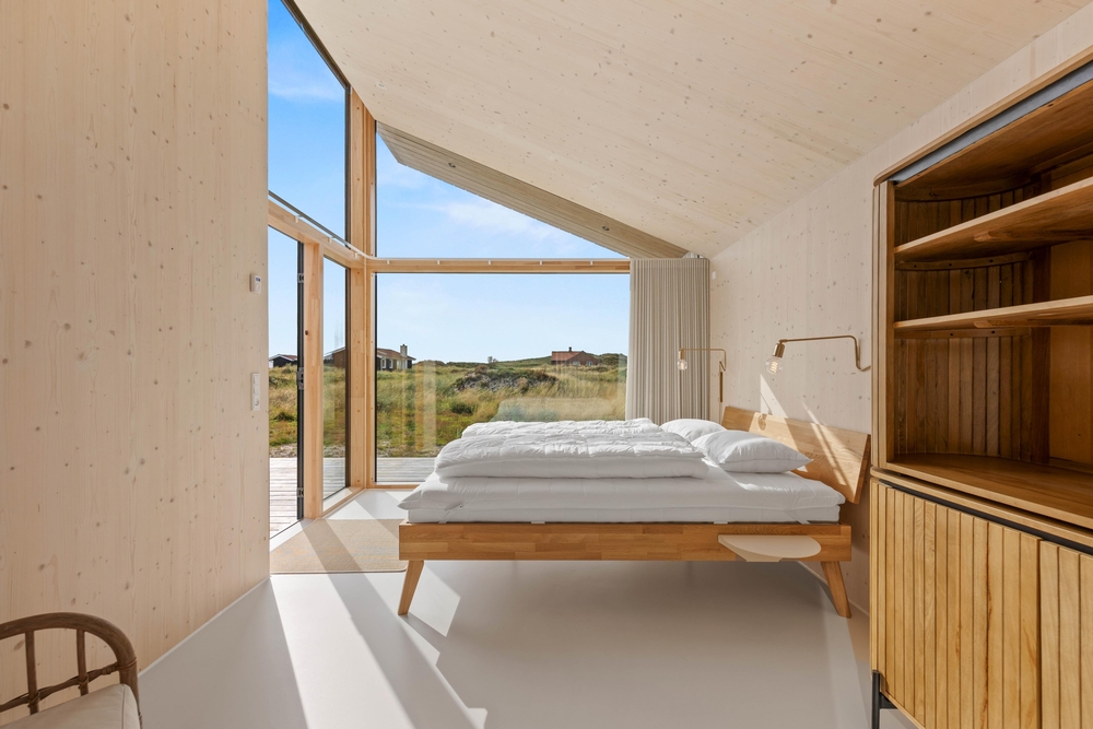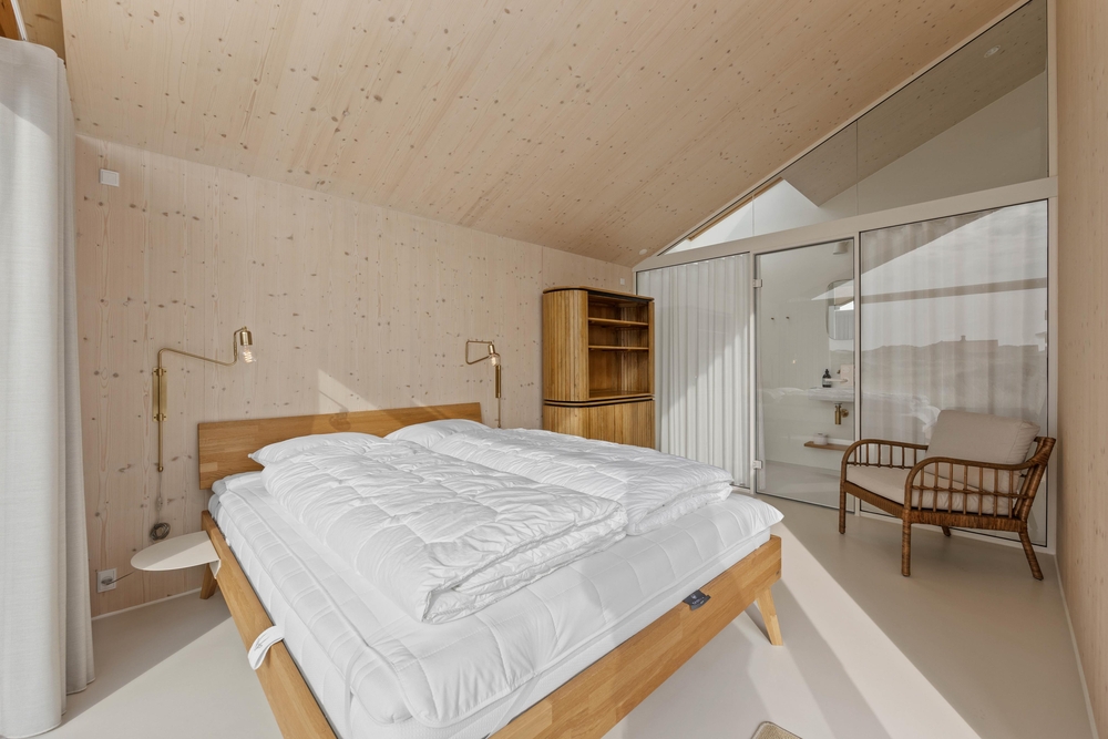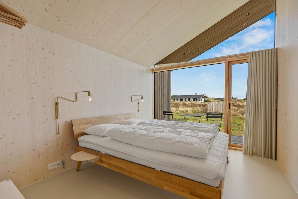 De 2 rummelige badeværelser med gulvvarme er flisebelagte med moderne italienske fliser og har dobbelte håndvaske. De 3 soveværelser er alle udstyret med store, komfortable dobbeltsenge, som er perfekte til afslapning efter en lang dag i den friske vesterhavsluft. Et soveværelse med eget badeværelse ligger for sig selv i annekset, hvor det føles som at sove direkte i klitterne.