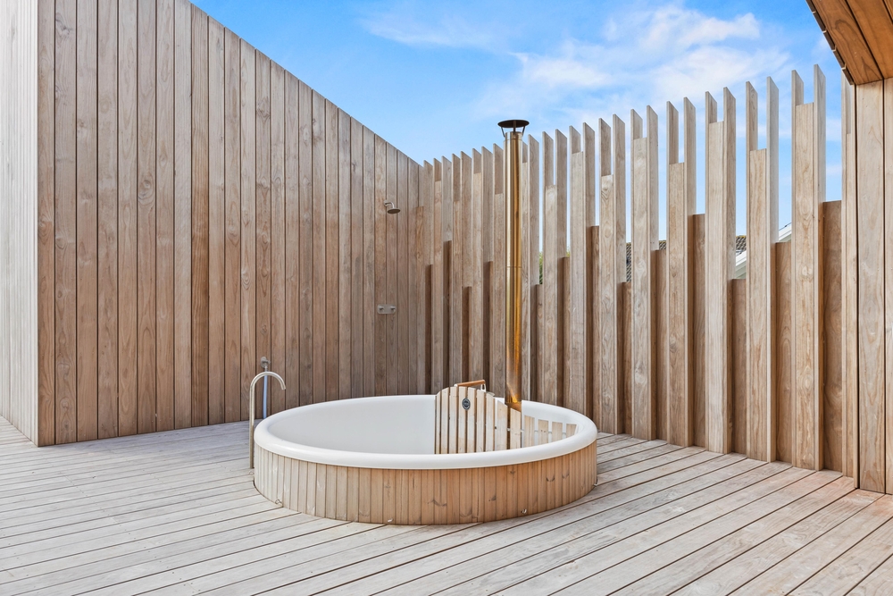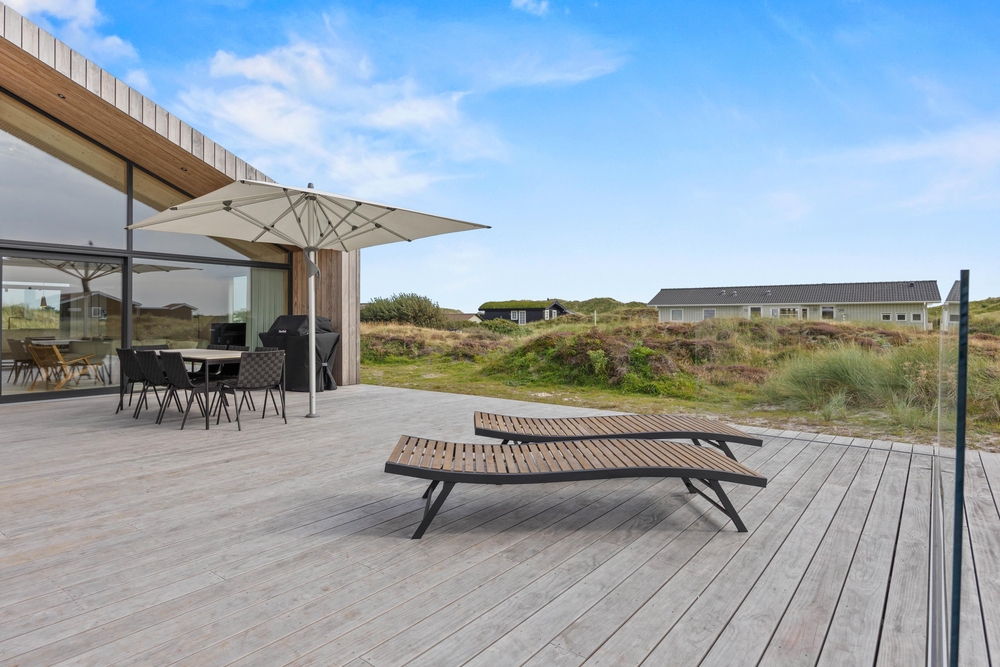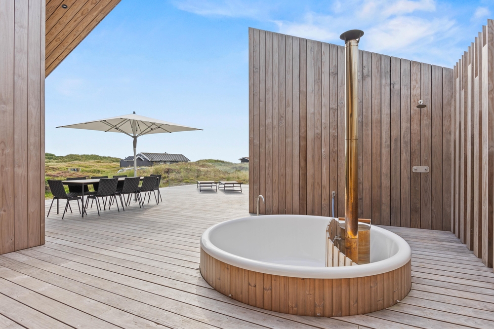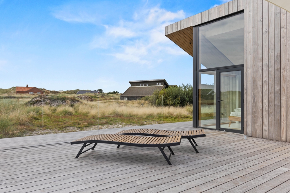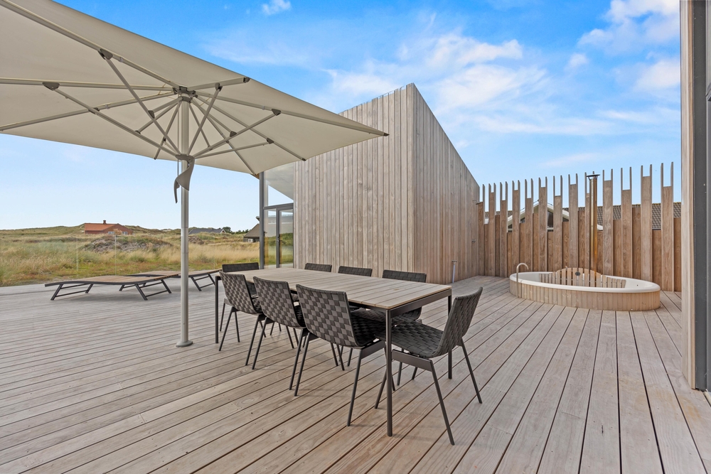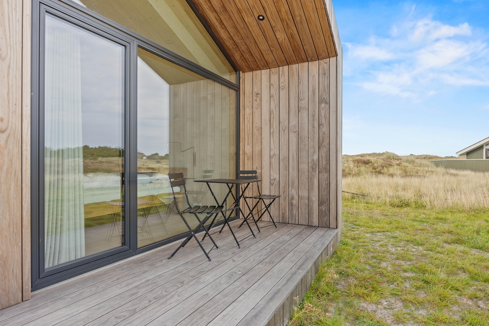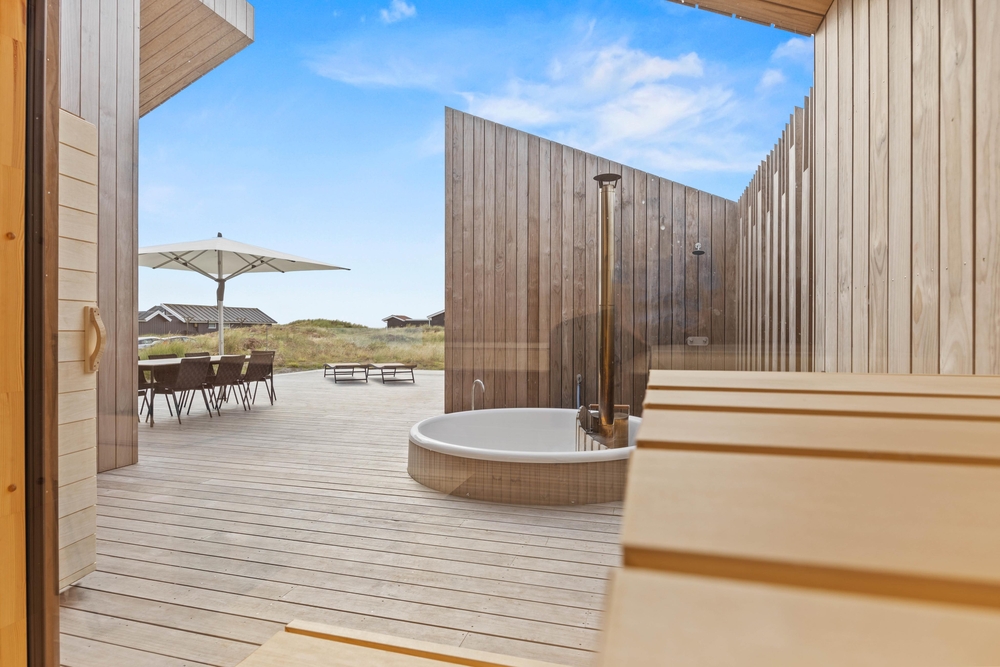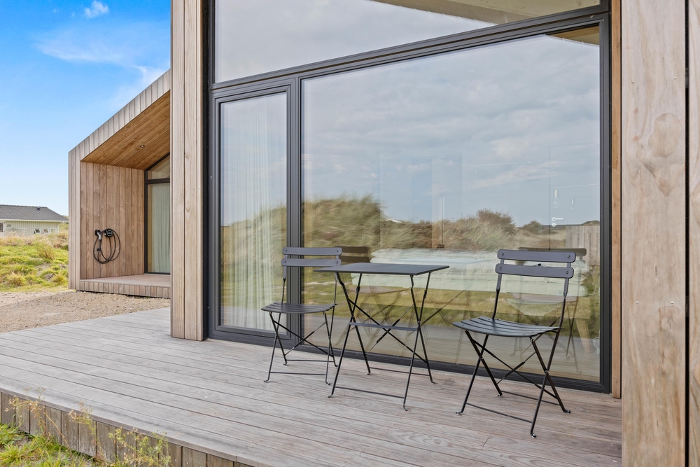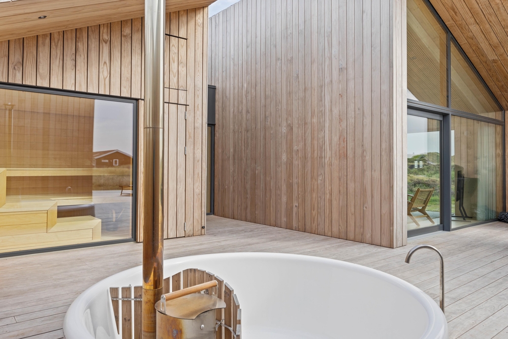Den smukke terrasse har både et beskyttet og et overdækket område, så I kan flytte rundt efter solen. Tag solbad på liggestolene eller slap af i havemøblerne. Nyd morgensolen på den østvendte loggia og de spektakulære solnedgange fra den vestvendte terrasse. Efter en spadseretur langs stranden eller en tur gennem de smukke naturområder i Sønderho, kan I gøre brug af det integrerede wellnessområde. Skyl sandet af under udebruseren, her er både koldt- og varmt vand (denne kan benyttes fra april til november)? og nyd afslapningen og nærheden til naturen i saunaen og vildmarksbadet.