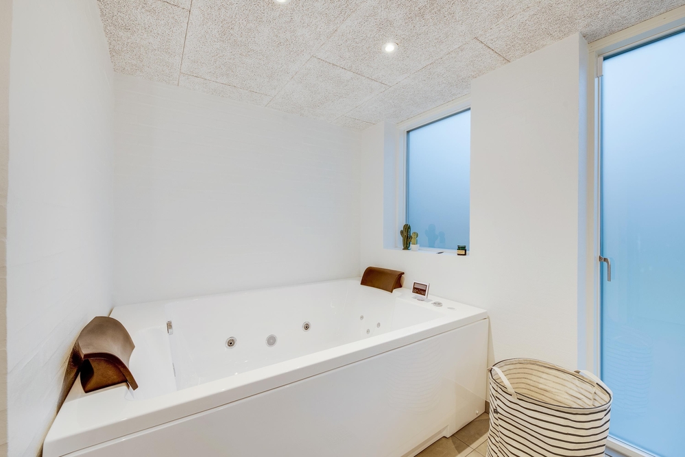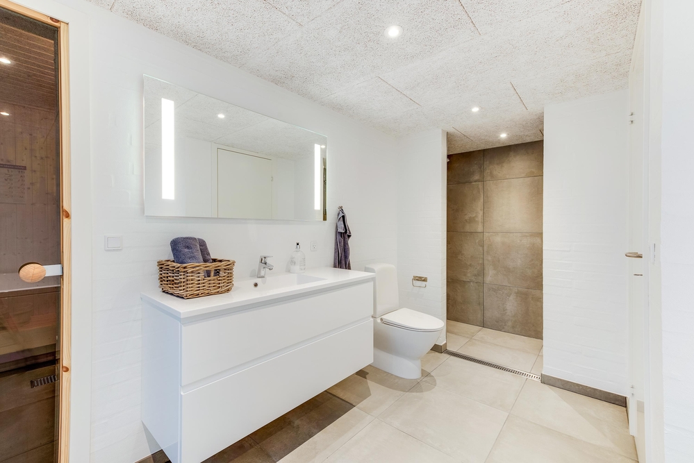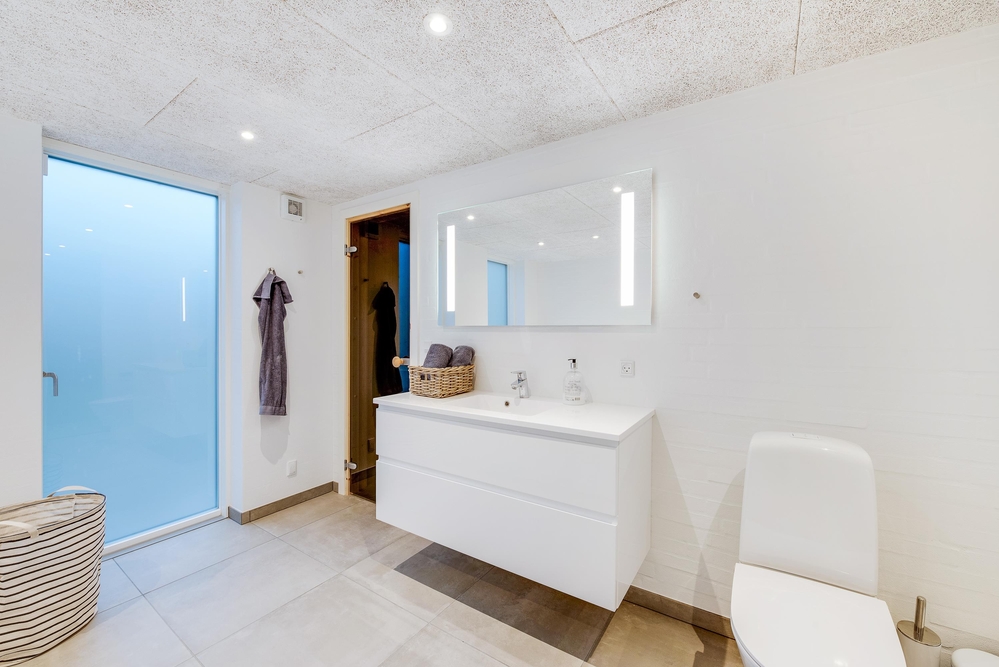 De lyse og flotte omgivelser vil hurtigt få jer til at føle jer godt tilpas, og indretningen rummer flere lækre highlights. I det ene af to badeværelser finder I jeres egen private wellnessafdeling med både sauna og spabad, hvor I kan forkæle jer selv og hinanden lidt ekstra på de sene aftener.