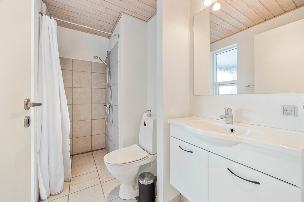 Stueetagen indeholder 2 indbydende badeværelser med gulvvarme. I saunaen kan man få slappet af. Køkkenet er lyst og moderne, og er praktisk indrettet med loft til kip og åben forbindelse til stuen. I køkkenet er der alt hvad man skal bruge af faciliteter i form af køleskab, keramiske kogeplader, varmluftovn og en mikrobølgeovn samt opvaskemaskine. I den hyggelige opholdsstue er der brændeovn.