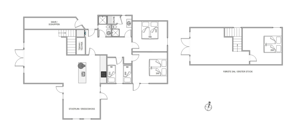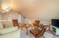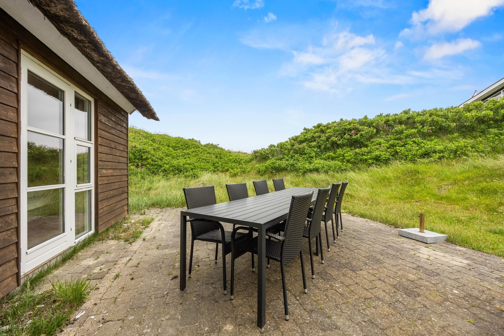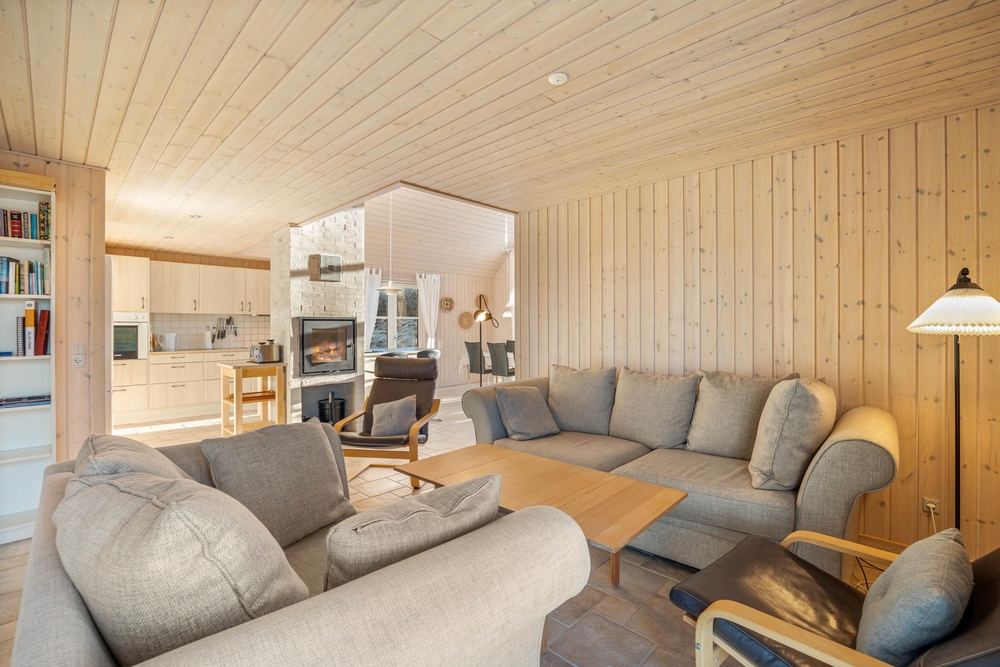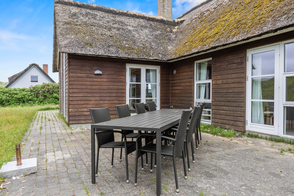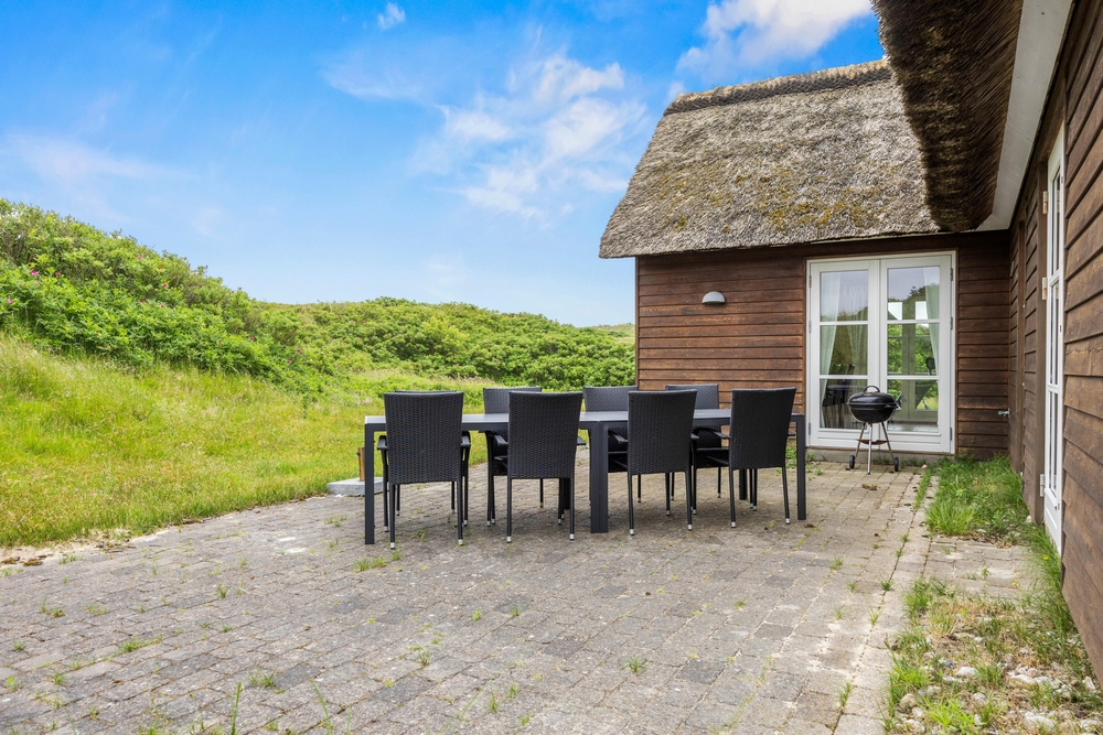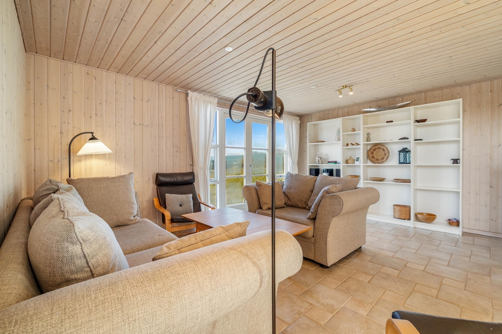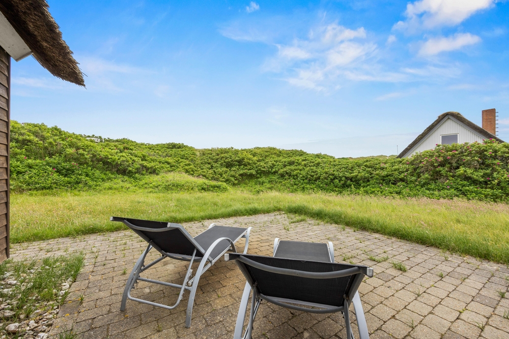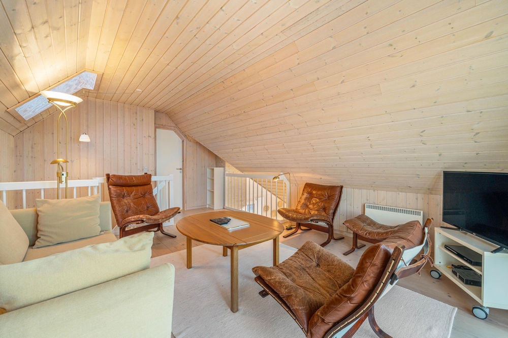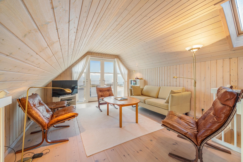 På første salen ligger et lyst soveværelse, hvor der også tv-er stue med hav kig og en fransk altan. Der er henholdsvis tre danske og tyske kanaler på tv?et. Dette dejlige feriehus indbyder til gåture på stranden og grillaftner på den indhegnede terrasse.