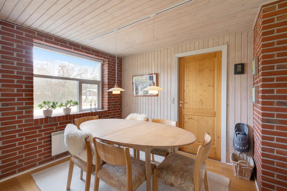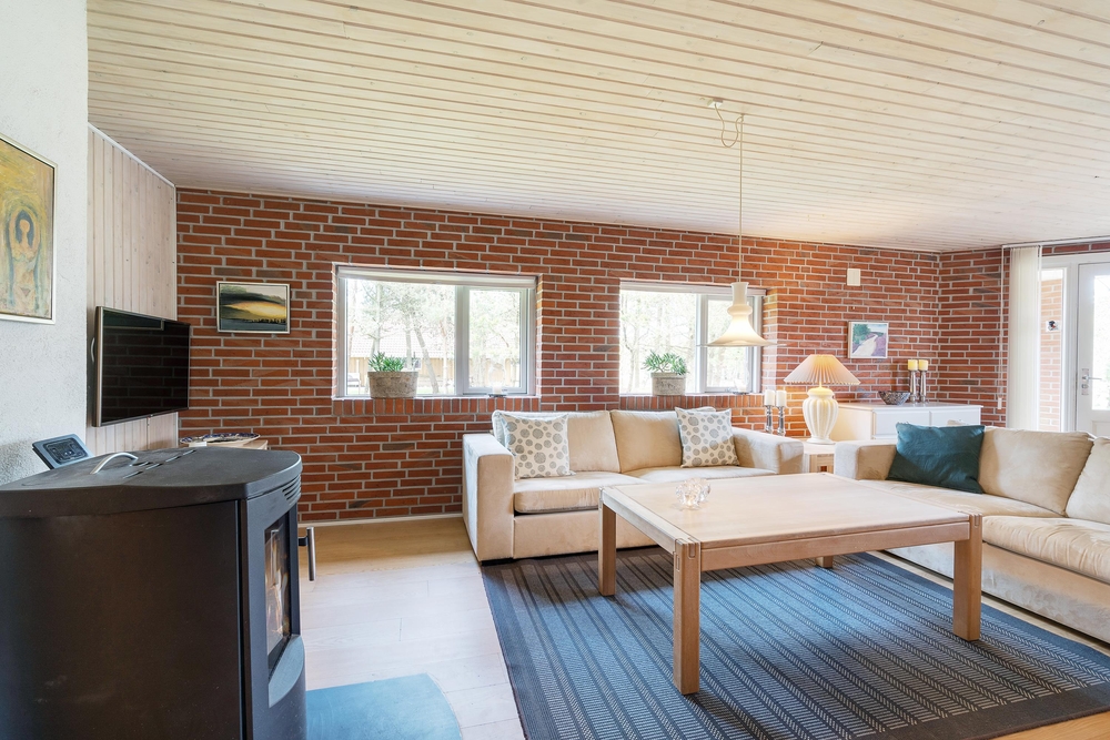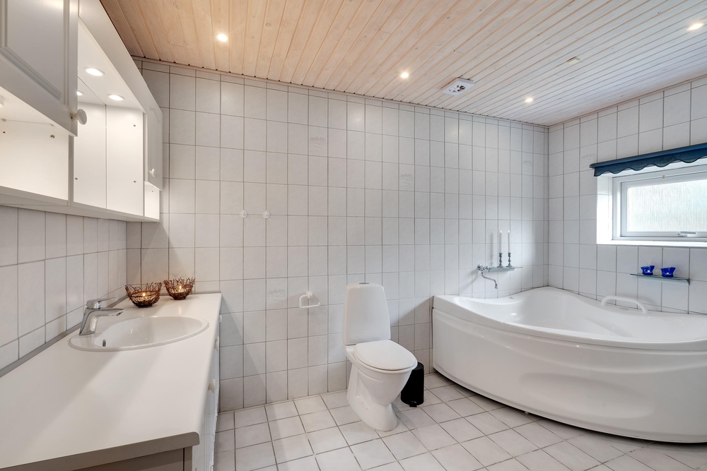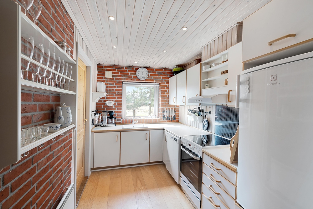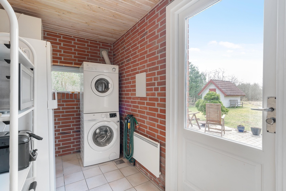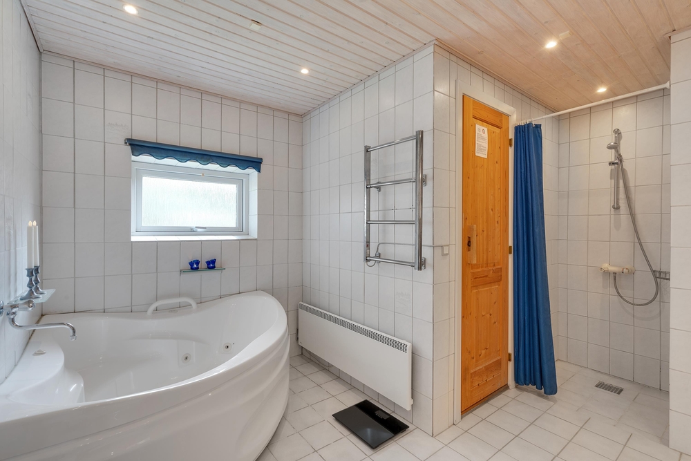 Hverdagens bekvemmeligheder følger selvfølgelig med, for i sommerhuset er der både vaskemaskine, tørretumbler og opvaskemaskine, så efter et lækkert måltid aftensmad, kan I samles på sofaen til et spil kort, se en god film, eller læse en bog i ro og fred, mens den knitrende brændeovn giver rummet varme og en hyggelig stemning. Ønsker I endnu mere varme, finder I det i feriehusets badeværelse med både sauna og spa, hvor der selvfølgelig også er gulvvarme. Her kan I lade op igen efter en dejlig dag i Houstrups fantastiske natur.
