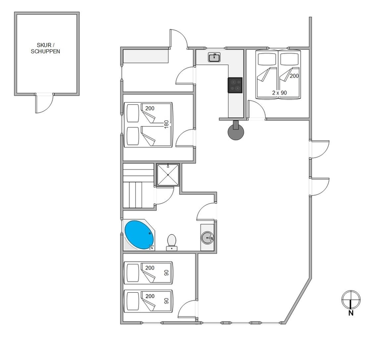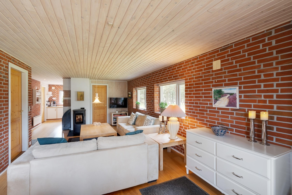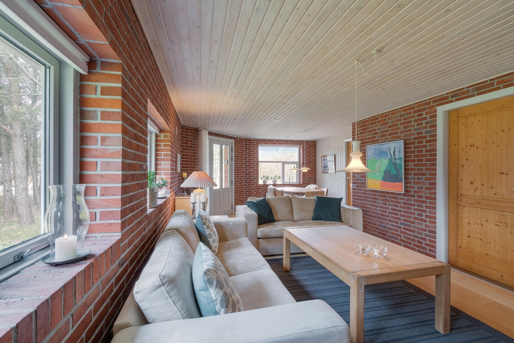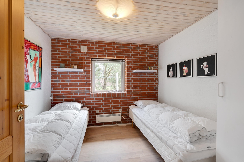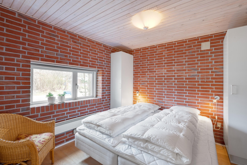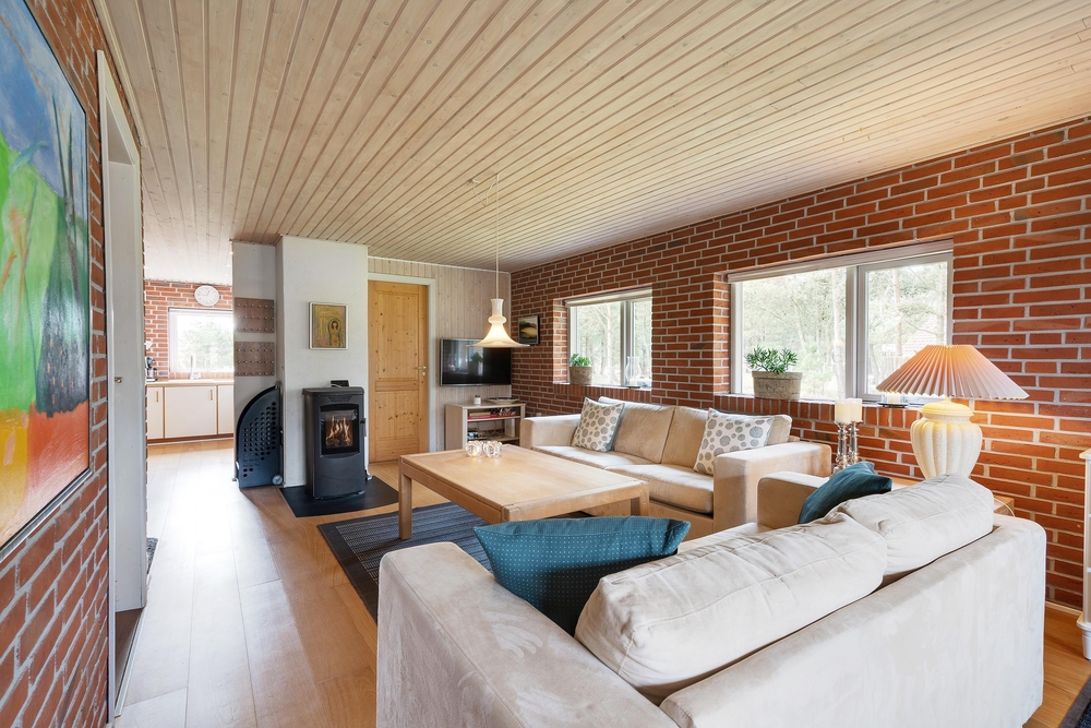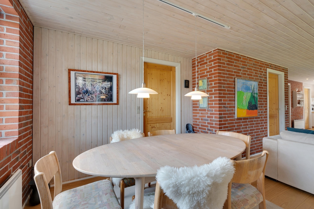 Hverdagens bekvemmeligheder følger selvfølgelig med, for i sommerhuset er der både vaskemaskine, tørretumbler og opvaskemaskine, så efter et lækkert måltid aftensmad, kan I samles på sofaen til et spil kort, se en god film, eller læse en bog i ro og fred, mens den knitrende brændeovn giver rummet varme og en hyggelig stemning. Ønsker I endnu mere varme, finder I det i feriehusets badeværelse med både sauna og spa, hvor der selvfølgelig også er gulvvarme. Her kan I lade op igen efter en dejlig dag i Houstrups fantastiske natur.