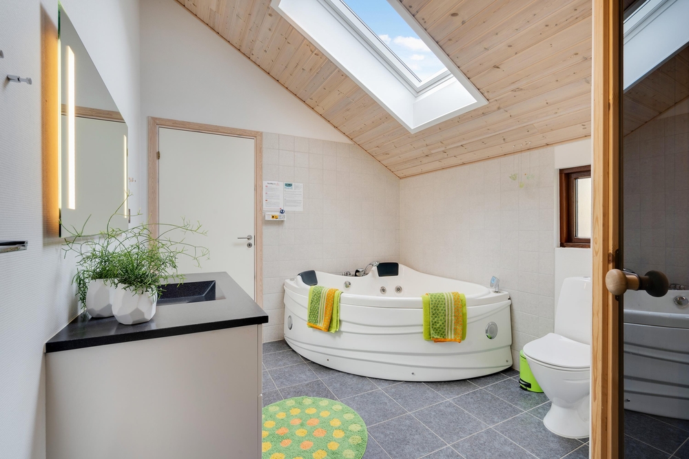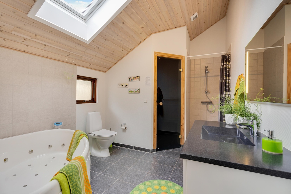 Skal der skrues op for afslapningen, kan I finde vej til det store af sommerhusets 2 badeværelser, der begge har gulvvarme. På det store badeværelse står både en spa og en sauna klar til jer, hvor I kan læne jer tilbage og slappe fuldstændig af.