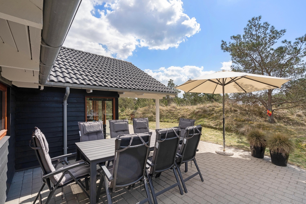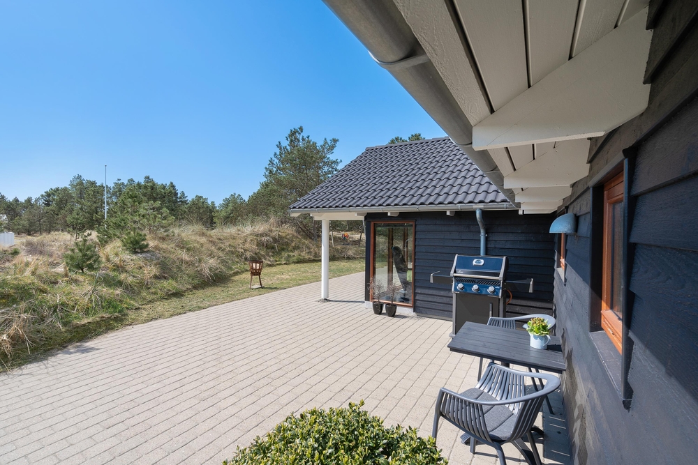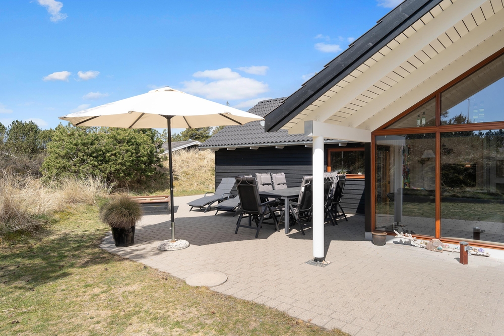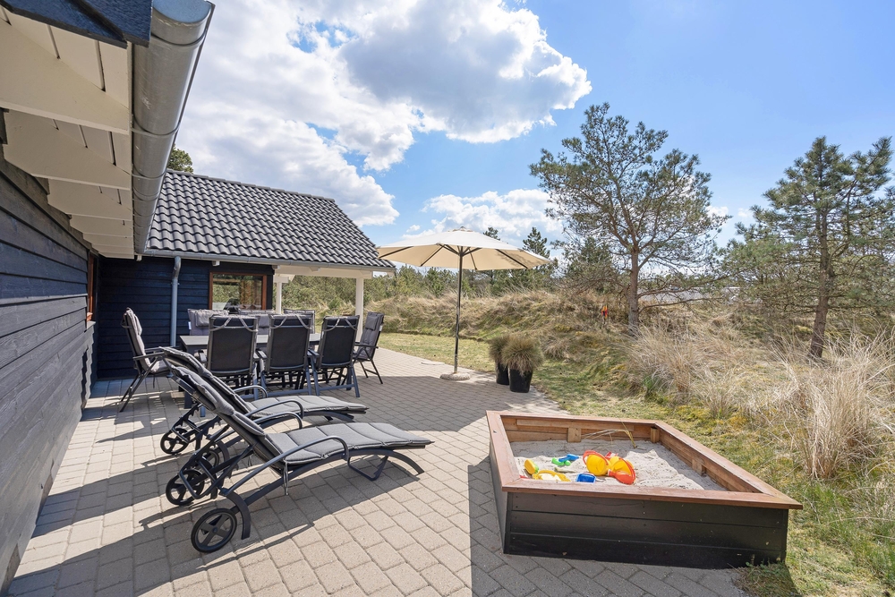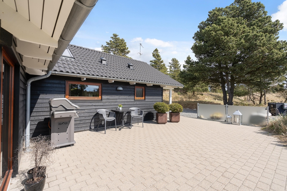 Omkring sommerhuset løber en stor åben terrasse. Her vil I altid kunne finde jer et godt spot, hvor I kan finde jer til rette i havemøbler og liggestole, mens solen bager løs. En del af terrassen er overdækket, som I kan søge hen mod, hvis I trænger til skygge.