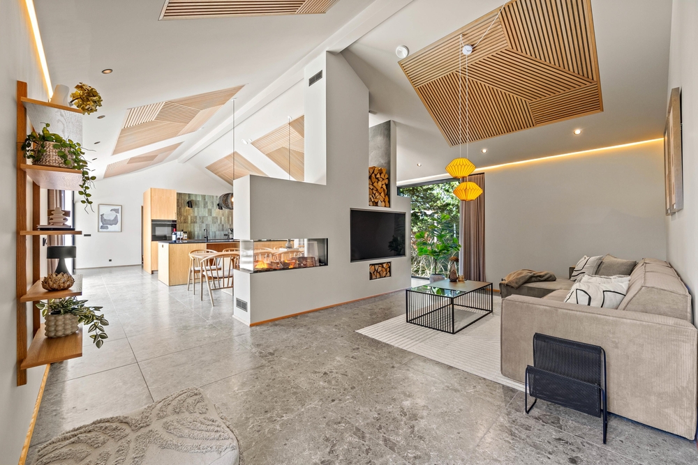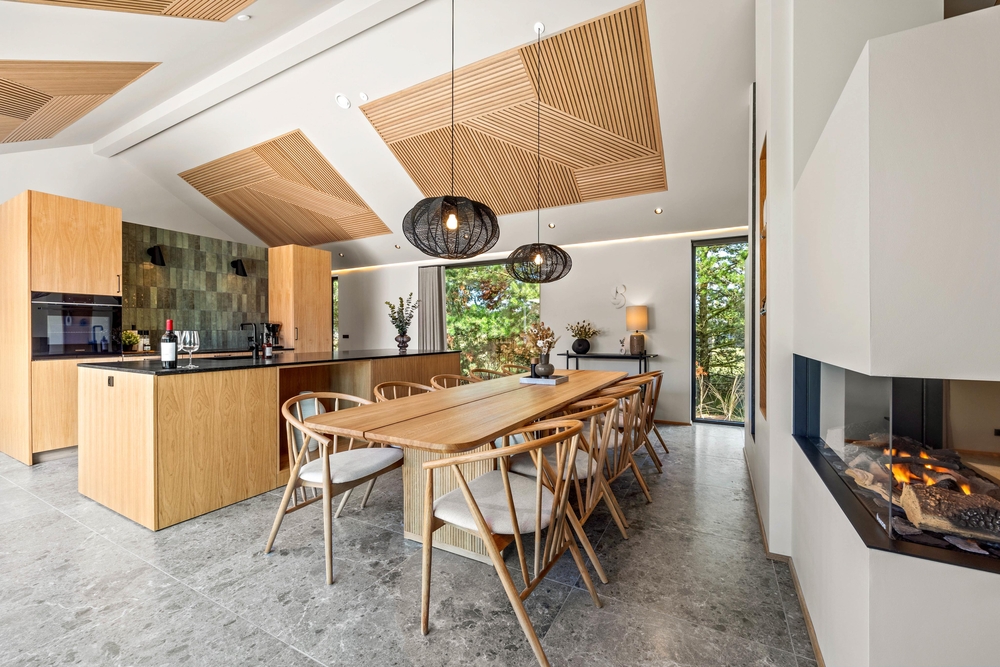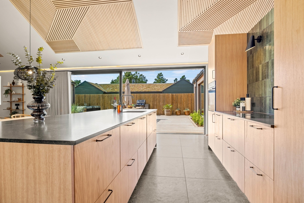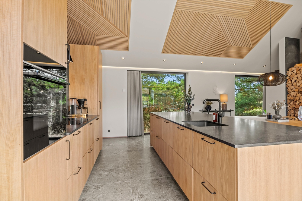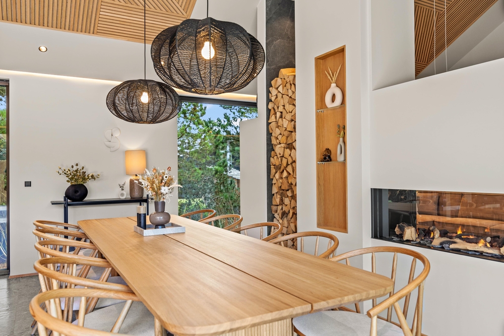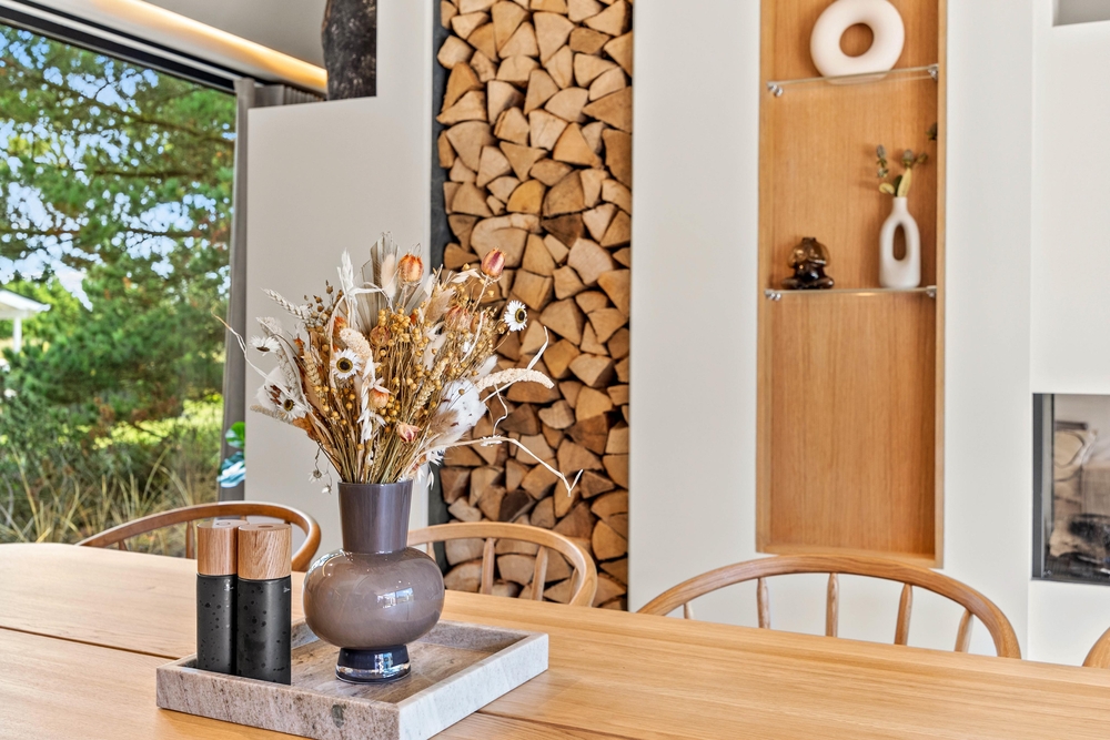 Ved ankomst til huset møder I de lyse og gedigne materialer, der giver en let og lys stemning, som fortsætter gennem hele huset. Lige fra det flotte åbne snedkerkøkken med kogeø, opvaskemaskine, mikroovn, ovn og induktionskogeplade til spisebordet foran pejsen, som i øvrigt også kan nydes i stuen på den anden side af rumadskillelsesmuren.