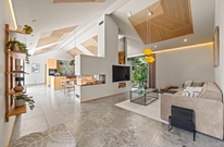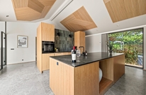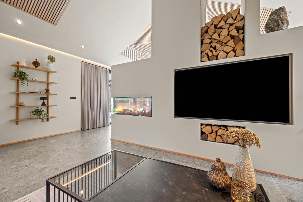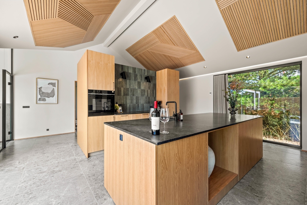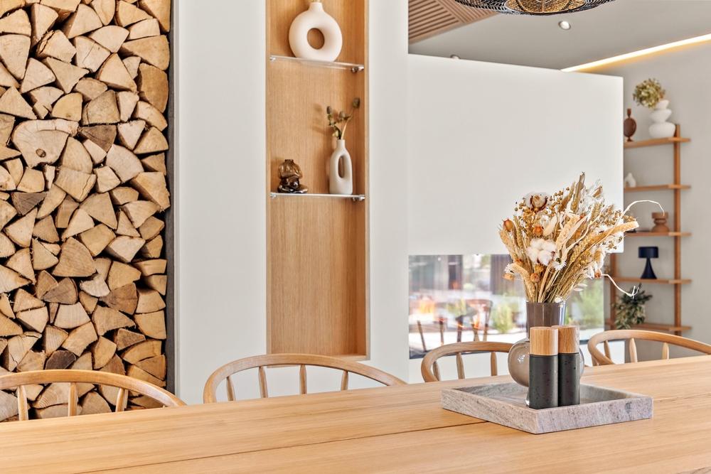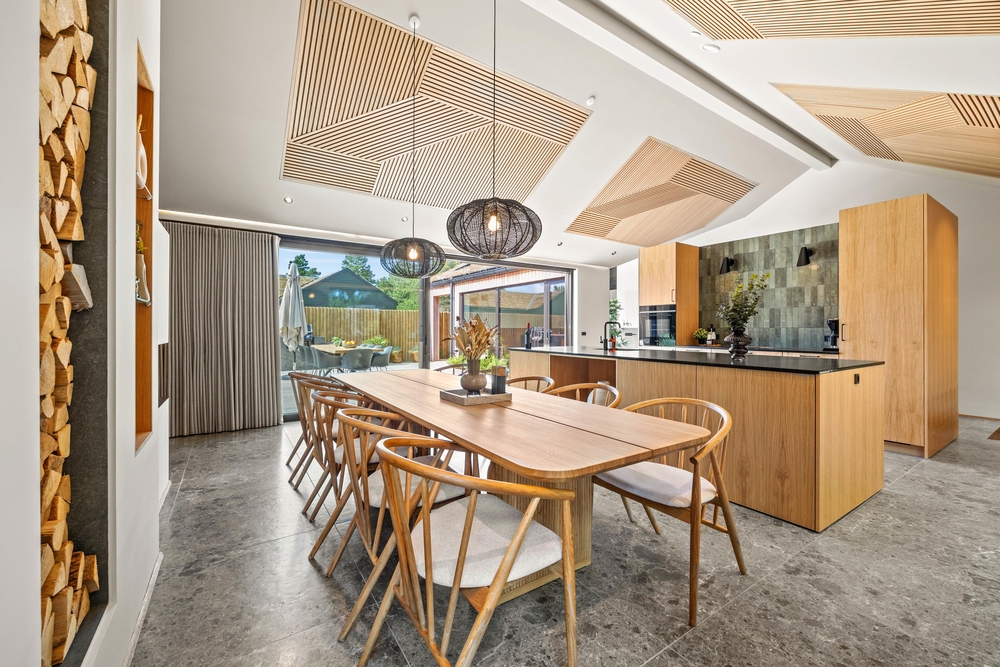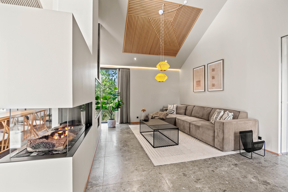 Ved ankomst til huset møder I de lyse og gedigne materialer, der giver en let og lys stemning, som fortsætter gennem hele huset. Lige fra det flotte åbne snedkerkøkken med kogeø, opvaskemaskine, mikroovn, ovn og induktionskogeplade til spisebordet foran pejsen, som i øvrigt også kan nydes i stuen på den anden side af rumadskillelsesmuren.