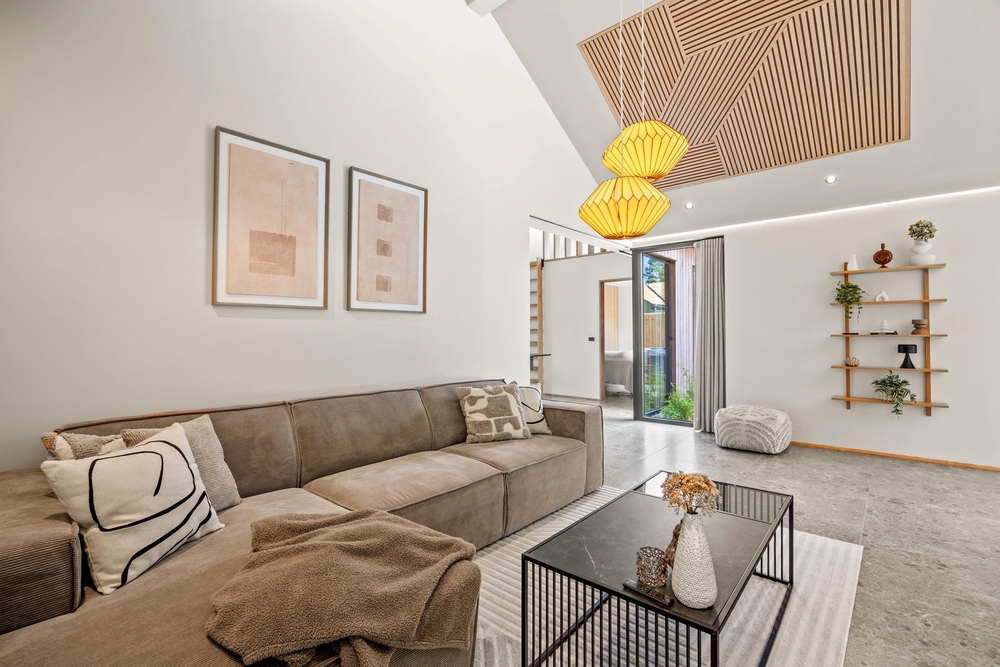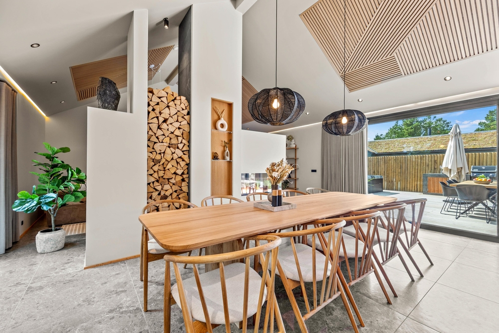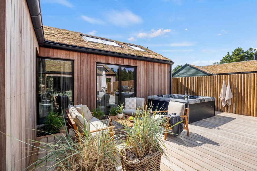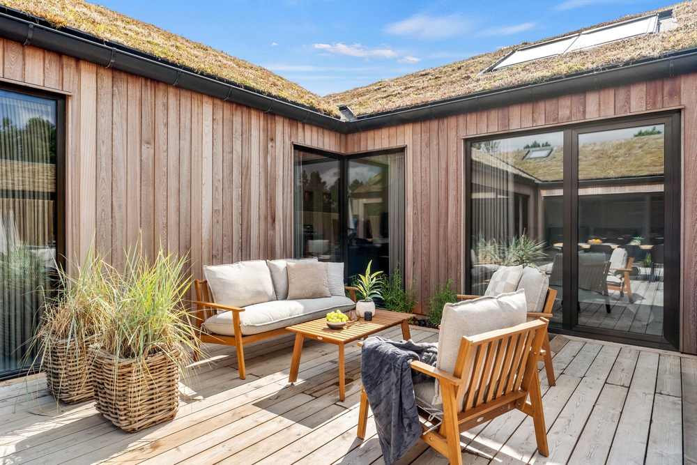 De store vinduer i opholdsrummet lukker dejligt meget lys ind og giver udsyn til den store flotte træterrasse med gasgrill og havemøbler skabt til hyggeligt samvær.