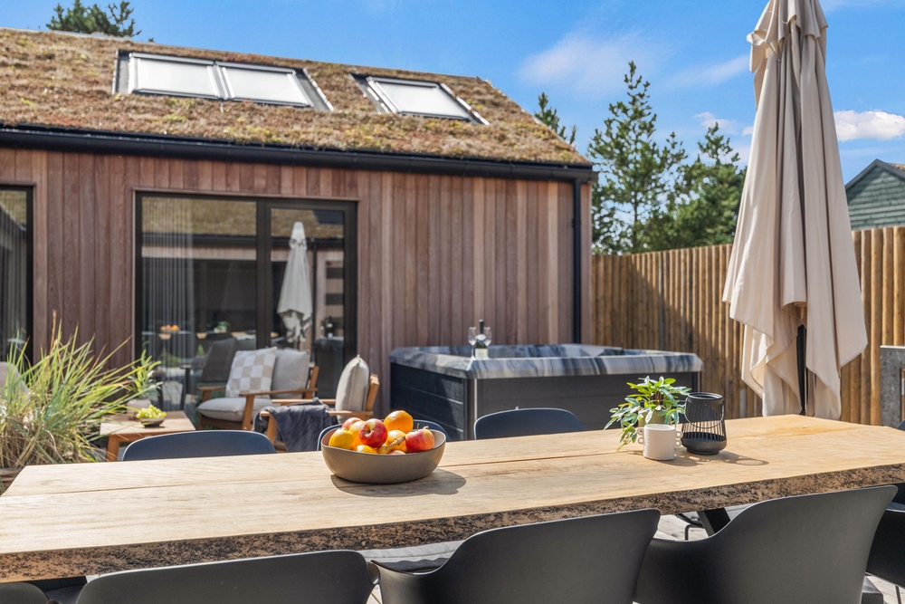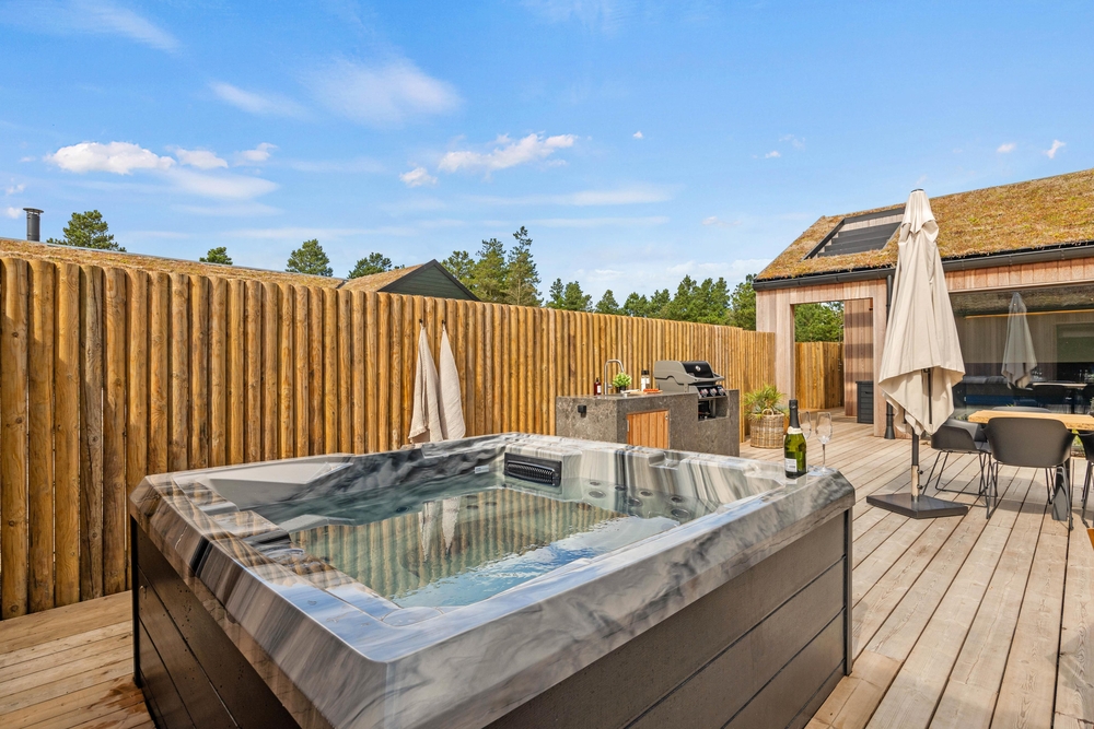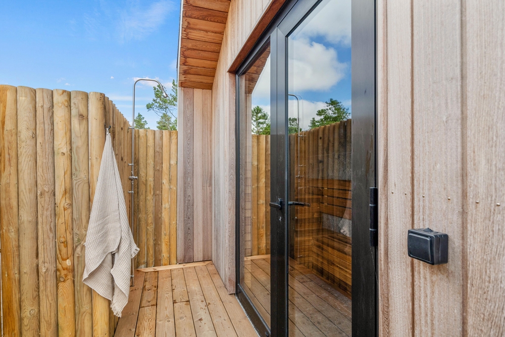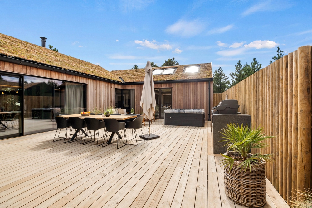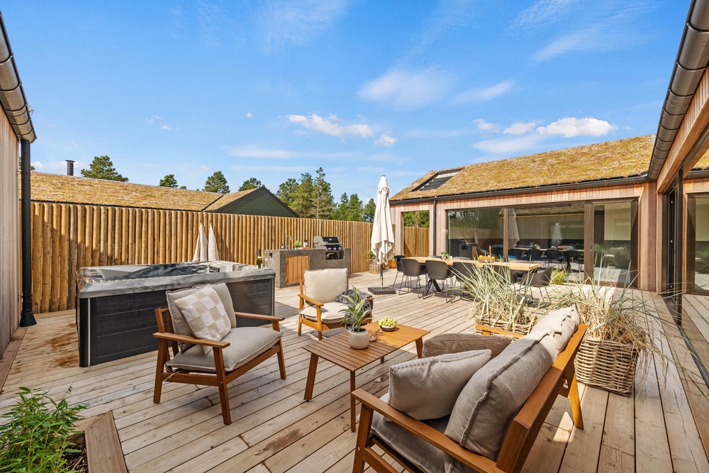 Den store flotte træterrasse er indrettet med spisepladser, liggestole og hygge-loungemøbler, der sammen med den 5-personers udespa og udesaunaen er designet til fælles hygge i det fri. I spaen og saunaen kan der slappes af efter dagens indtryk uanset årstid. Udebruseren er til rådighed fra 1. april til 30. oktober.