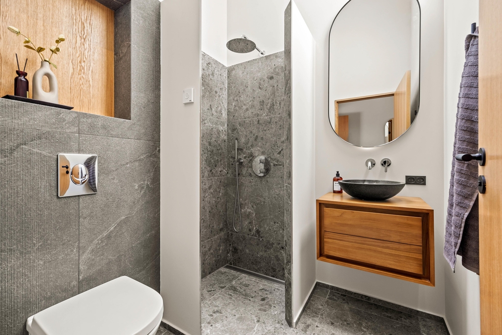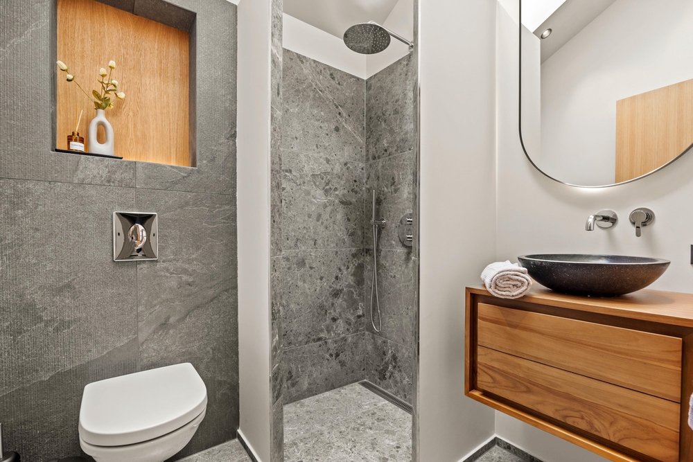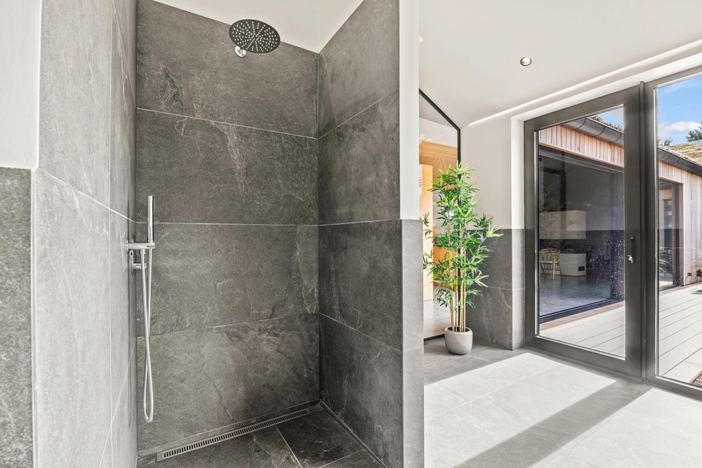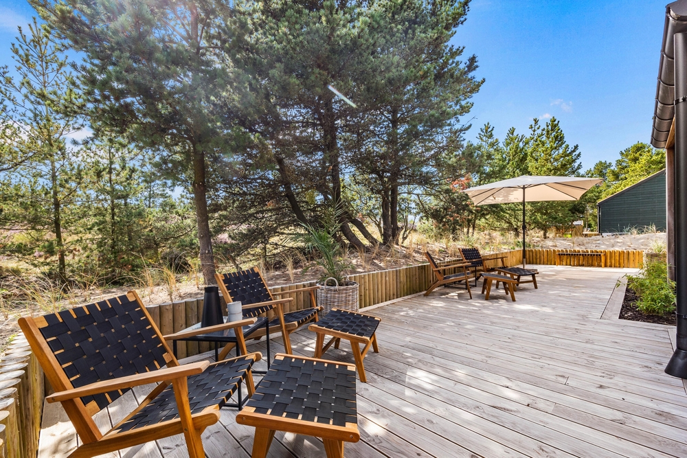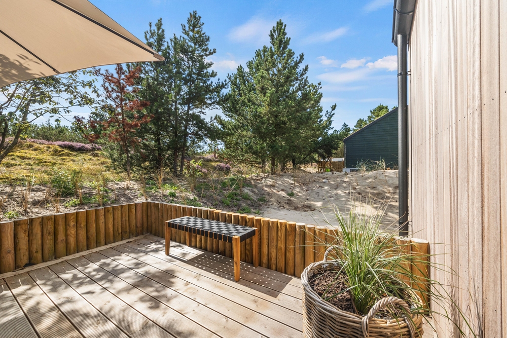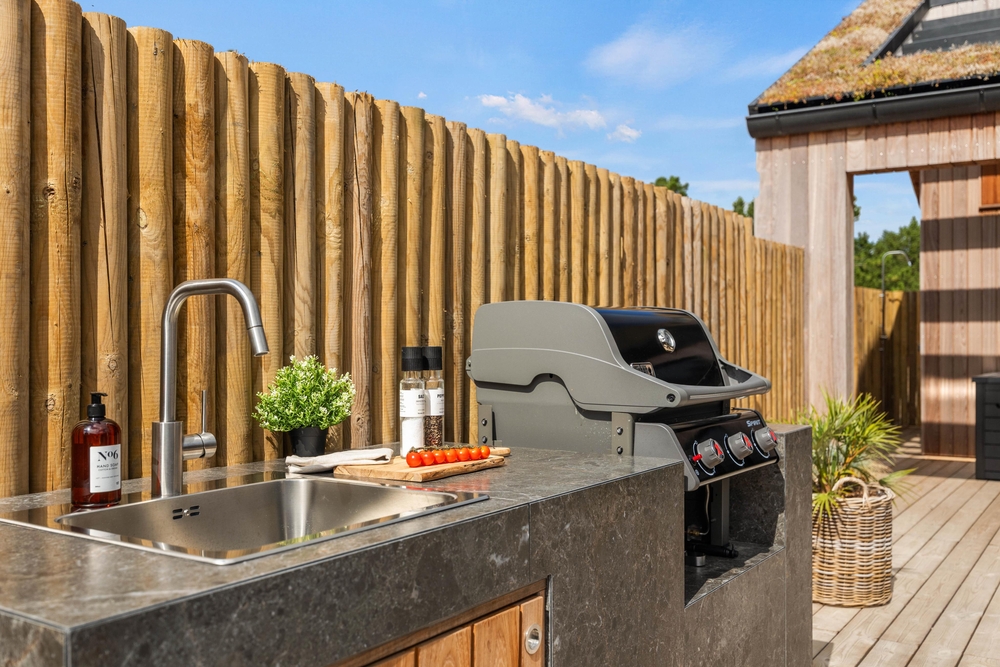 Den store flotte træterrasse er indrettet med spisepladser, liggestole og hygge-loungemøbler, der sammen med den 5-personers udespa og udesaunaen er designet til fælles hygge i det fri. I spaen og saunaen kan der slappes af efter dagens indtryk uanset årstid. Udebruseren er til rådighed fra 1. april til 30. oktober.