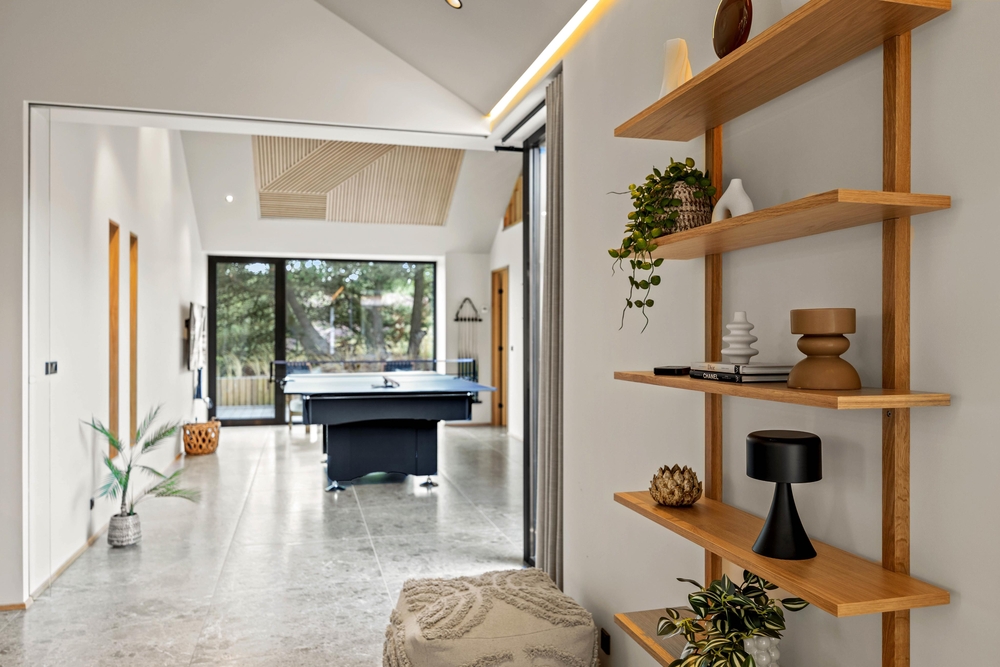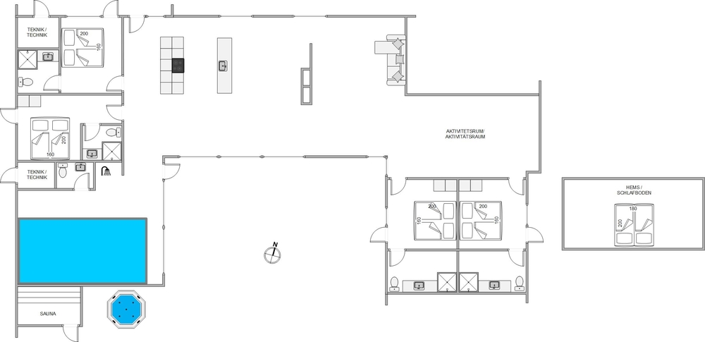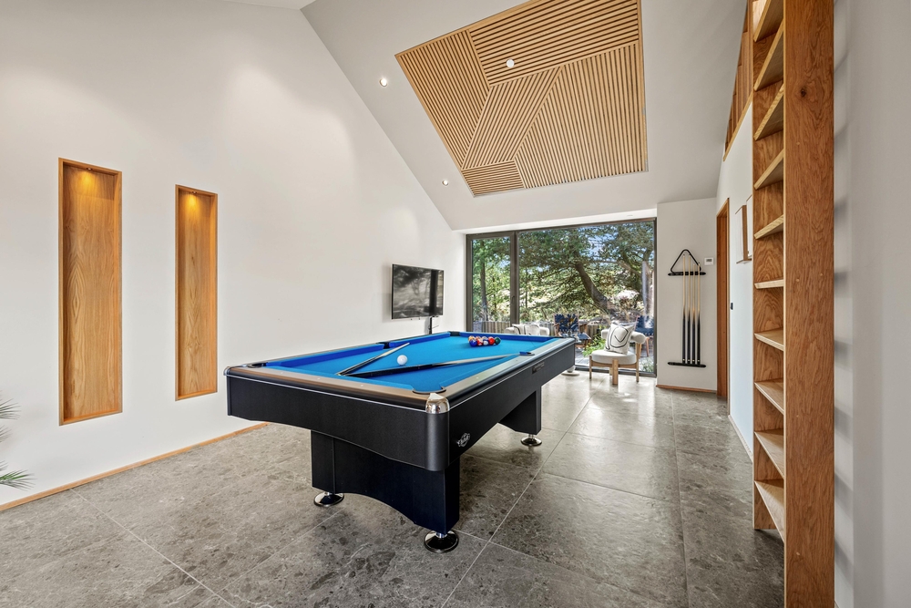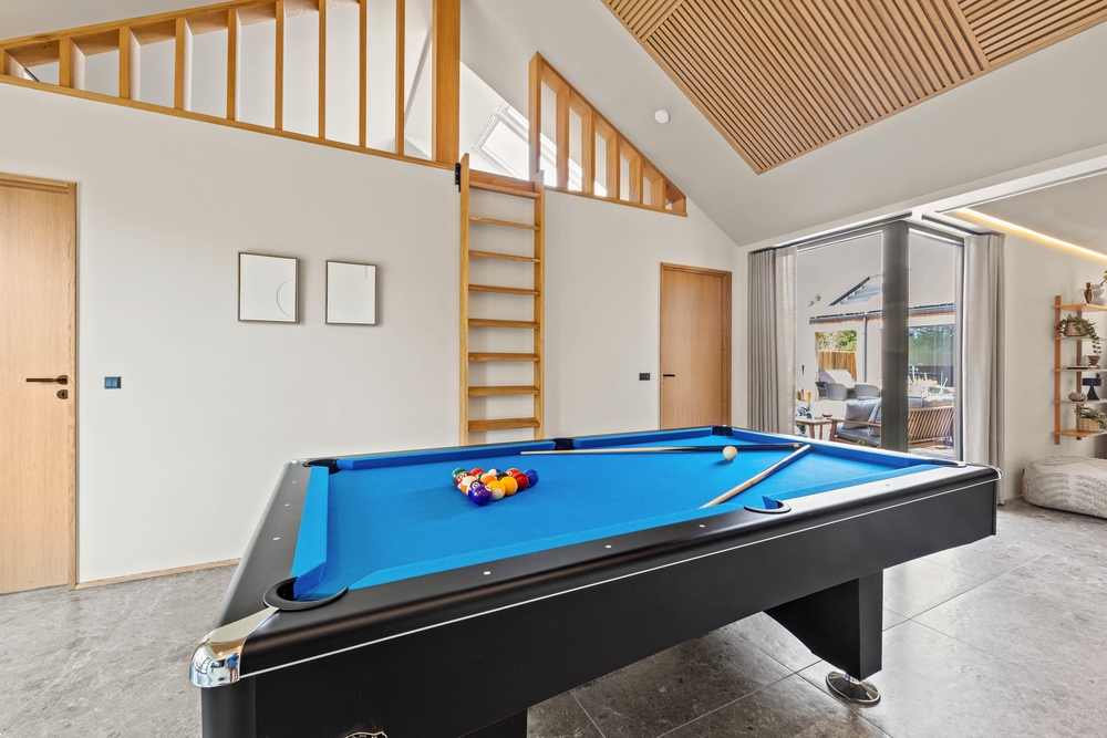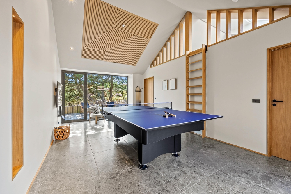 Aktivitetsrummet med billard ligger i forlængelse af stuen, så de spillelystne kan udfolde sig og finde feriens mester. Overalt i huset er der gulvvarme under de smukke klinker og det kan anbefales at bruge den energivenlige varmepumpe.