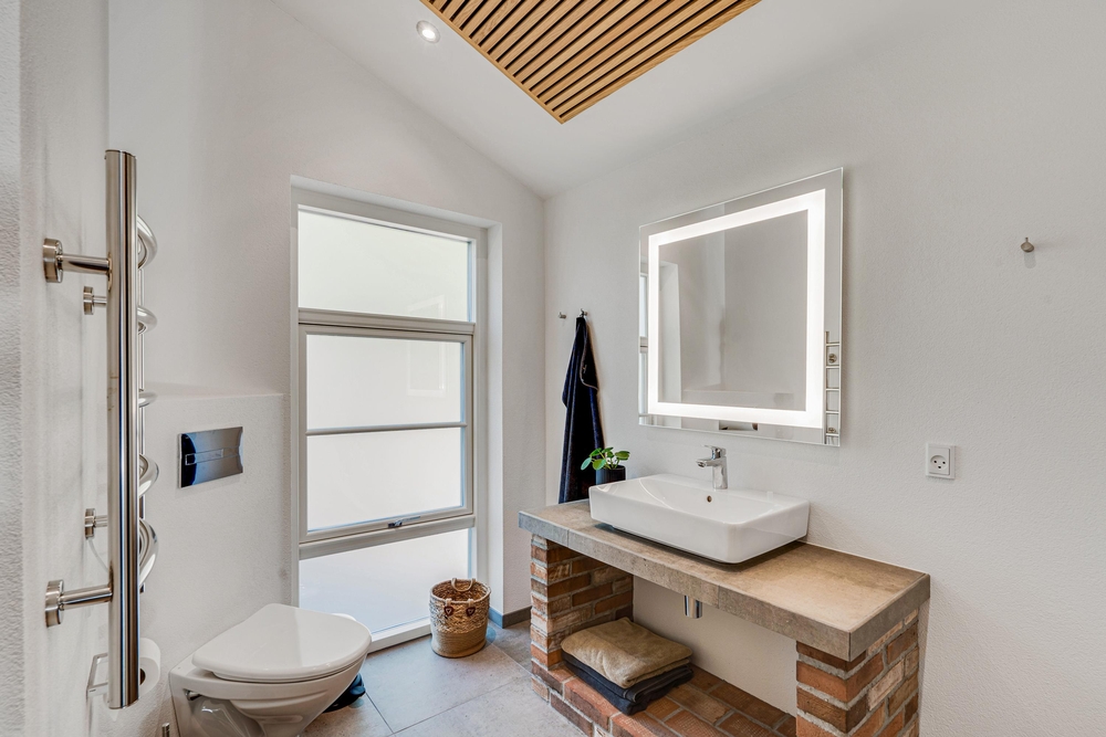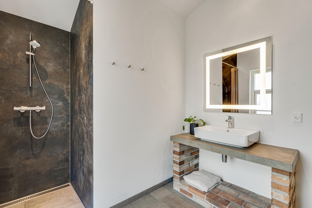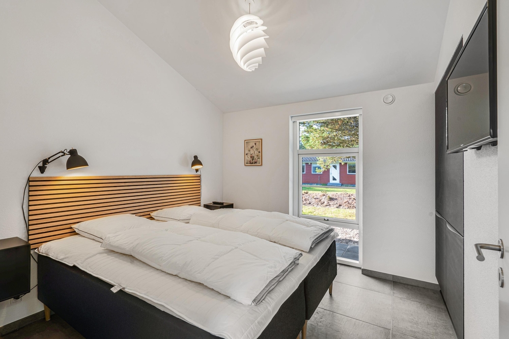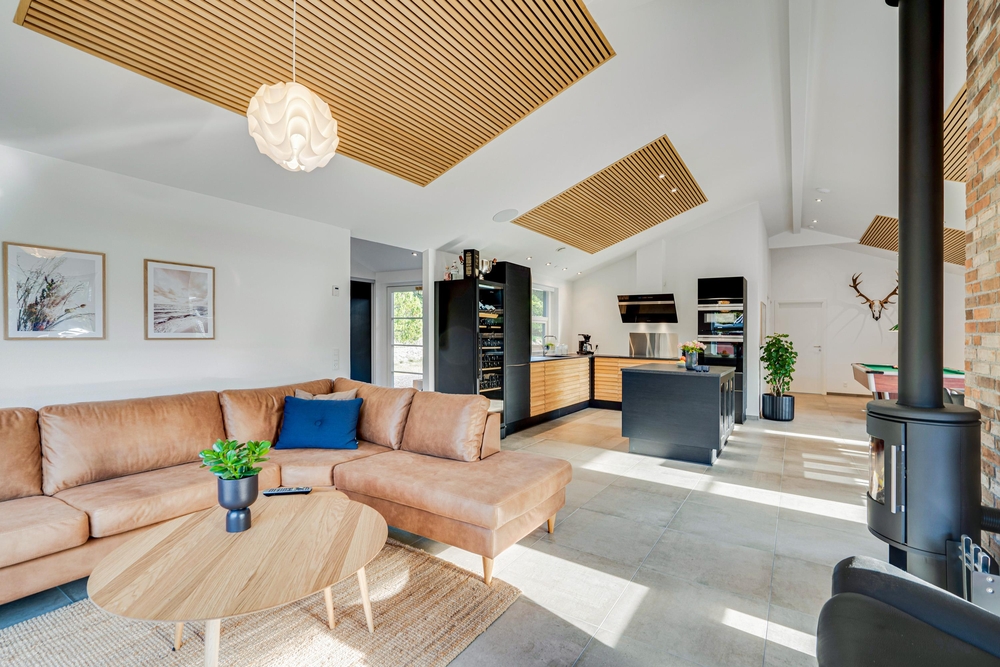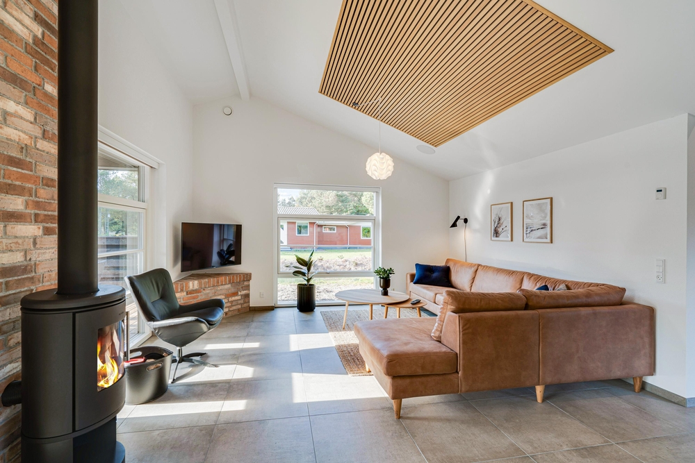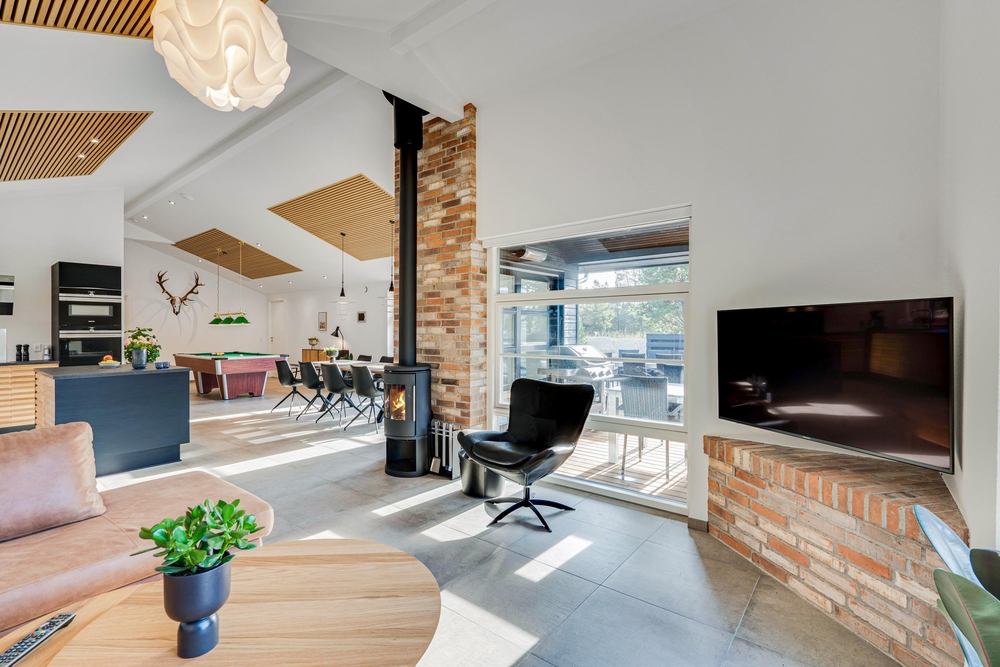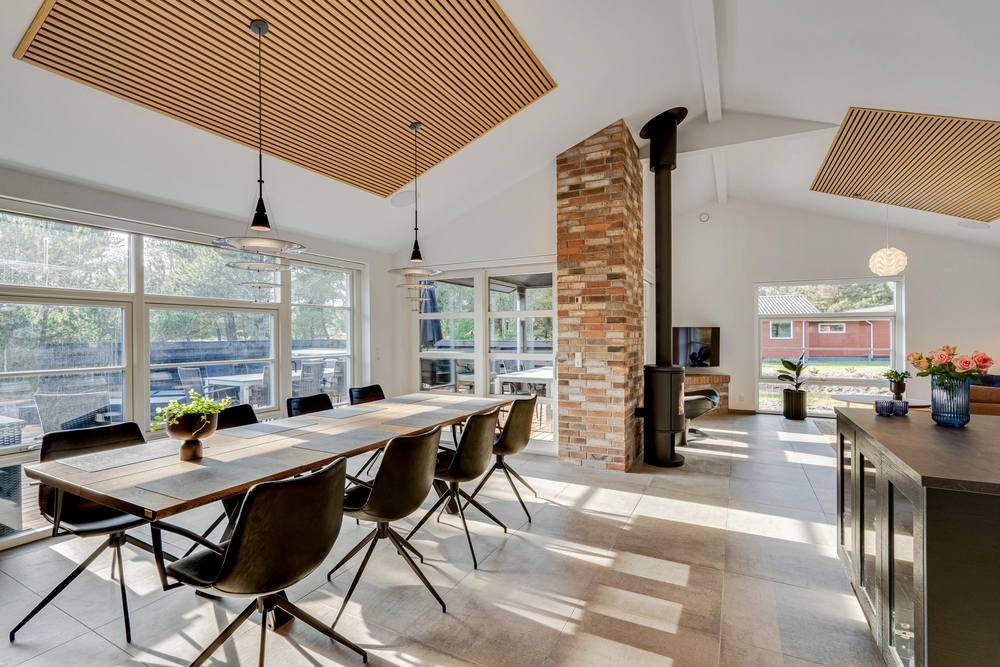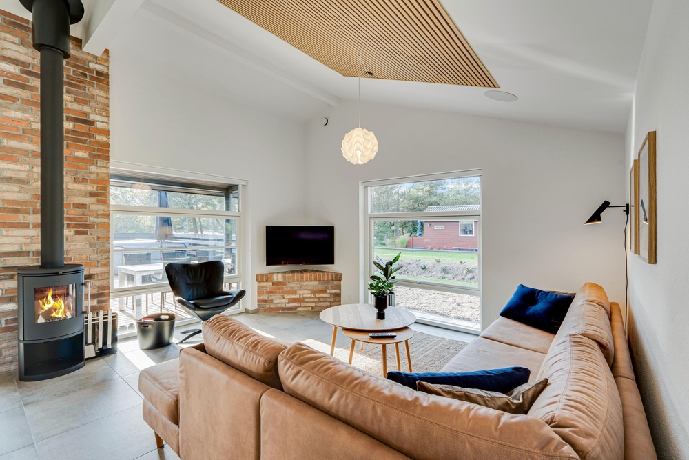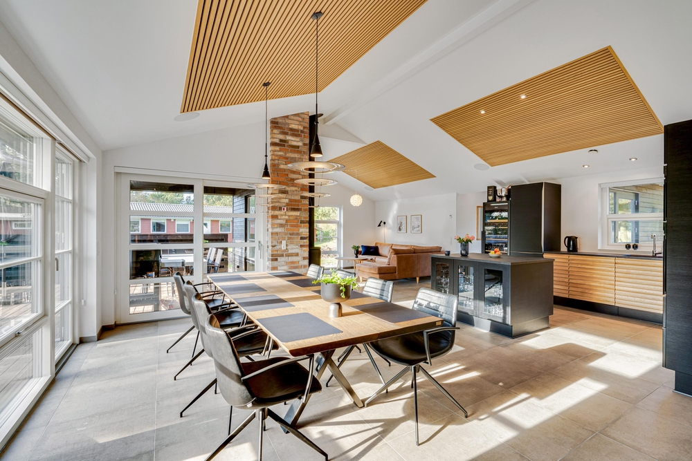I sommerhuset vil I møde en moderne indretning med et nordisk præg, som straks vil give jer en hjemlig stemning. Her er træpaneler og mursten med til at skabe en unik indretning, og de kvalitetsbevidste møbler tilfører feriehuset en hyggelig atmosfære.