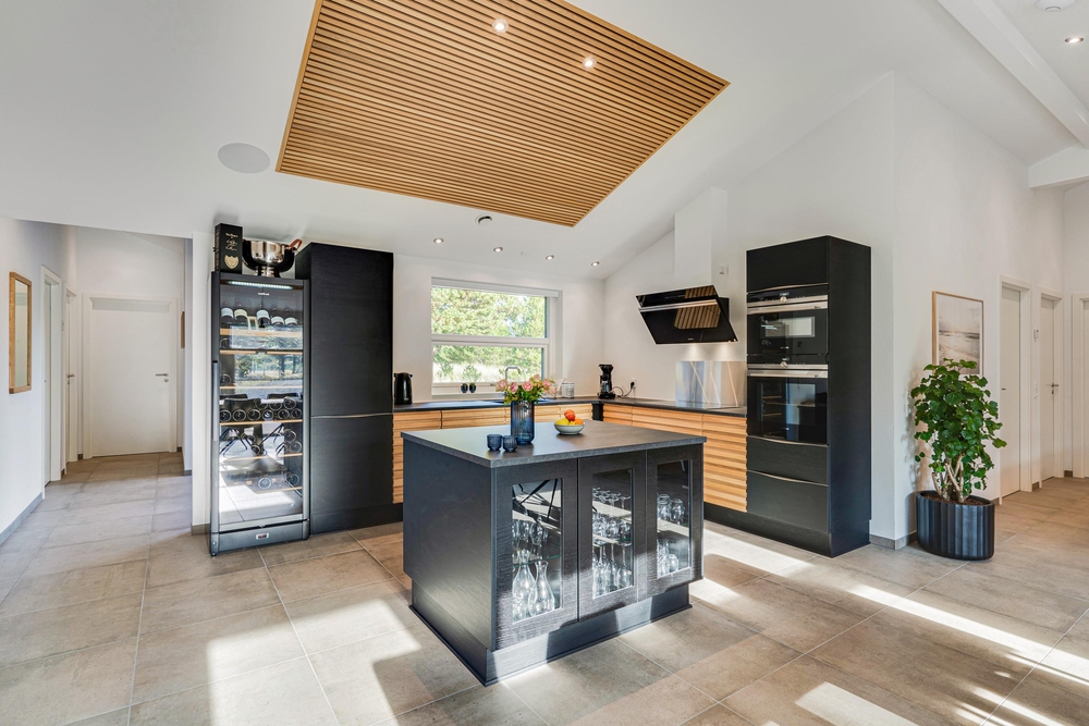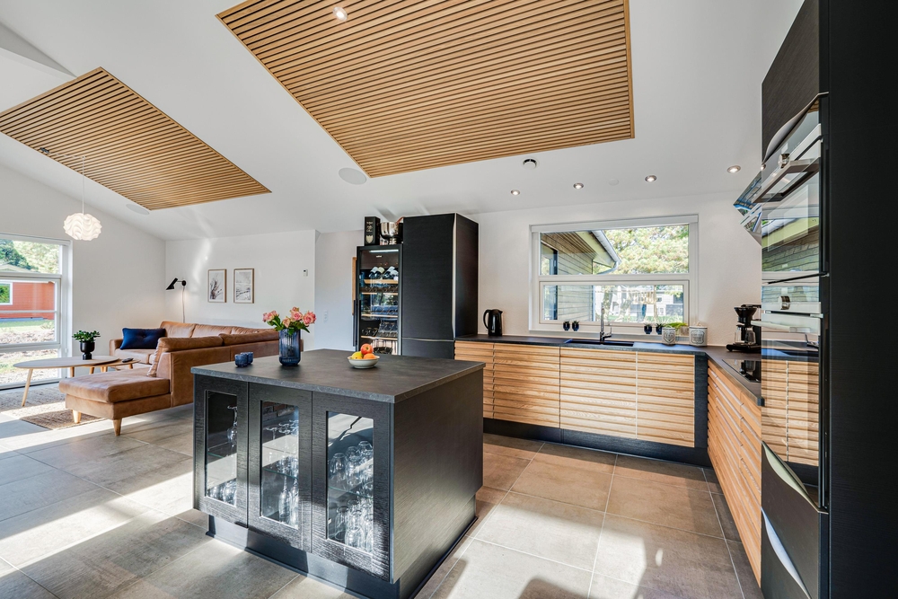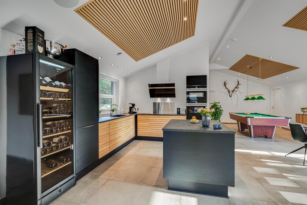Sommerhusets kerne er det store flotte alrum, der forbinder køkken, stue og spiseplads. Alrummet vil uden tvivl blive et af de rum, hvor I kommer til at tilbringe mange hyggelige timer sammen med madlavning, spisning, spil og film. I køkkenet har I både en vinkøler, så I altid kan få et glas kold vin, samt en opvaskemaskine, så I slipper for at bruge en masse tid på opvask.