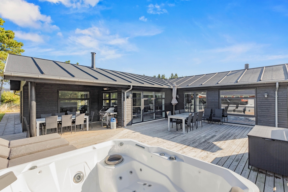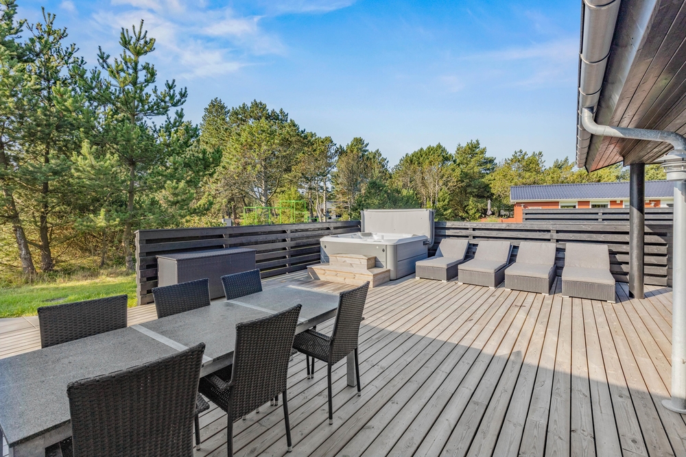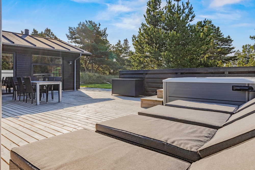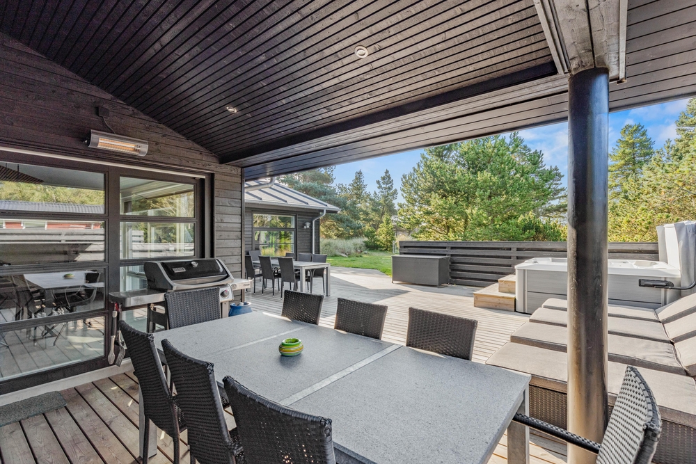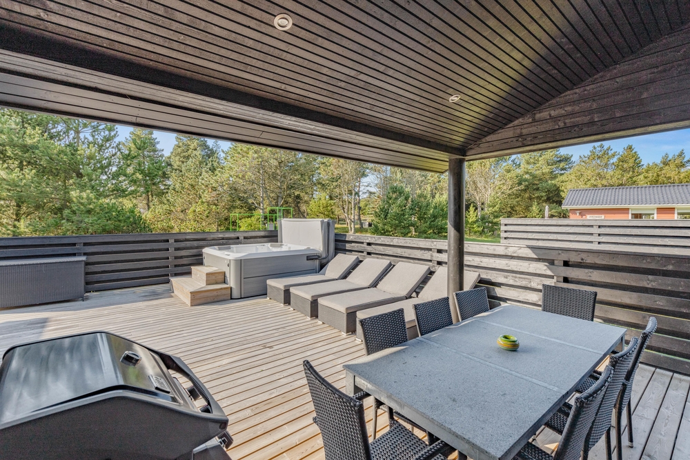 Udendørs har I en stor, lækker træterrasse, der er delvist overdækket og afskærmet. Foruden udespaen, der er at finde på terrassen, står der også havemøbler, liggestole og en grill klar, så I har alt til en dejlig feriedag i den friske luft.
