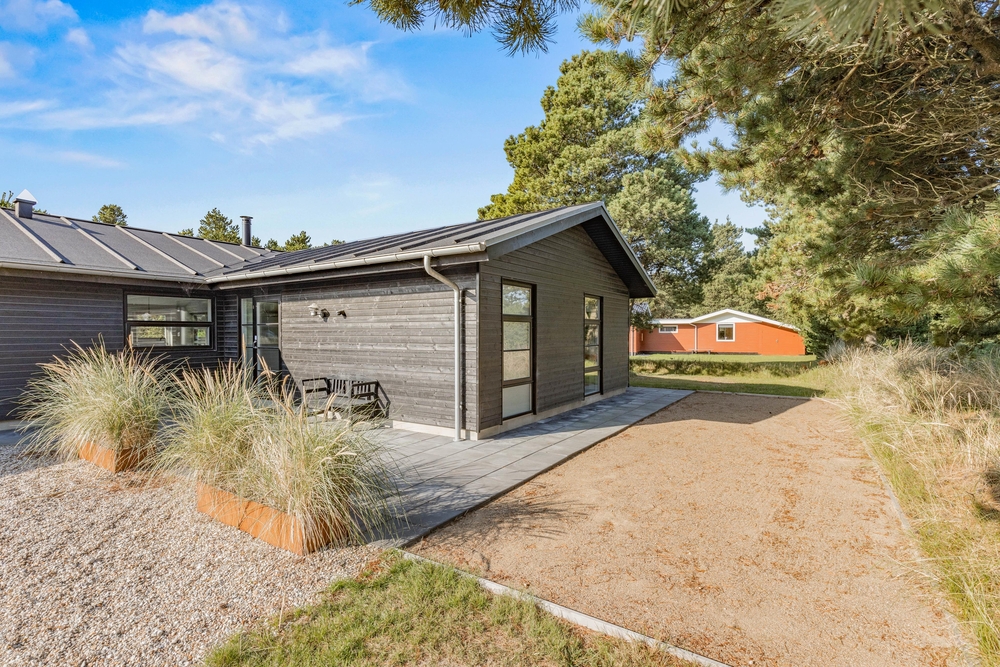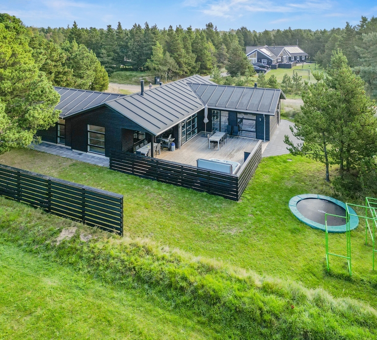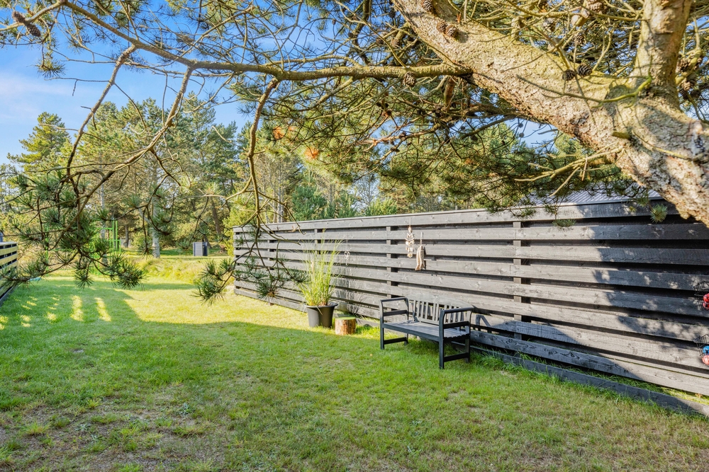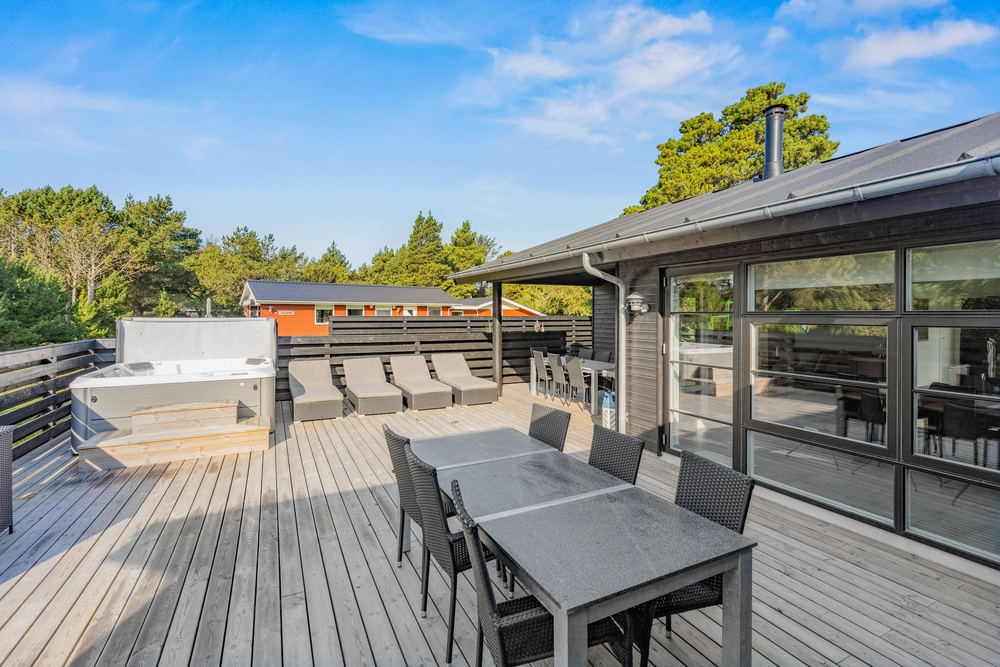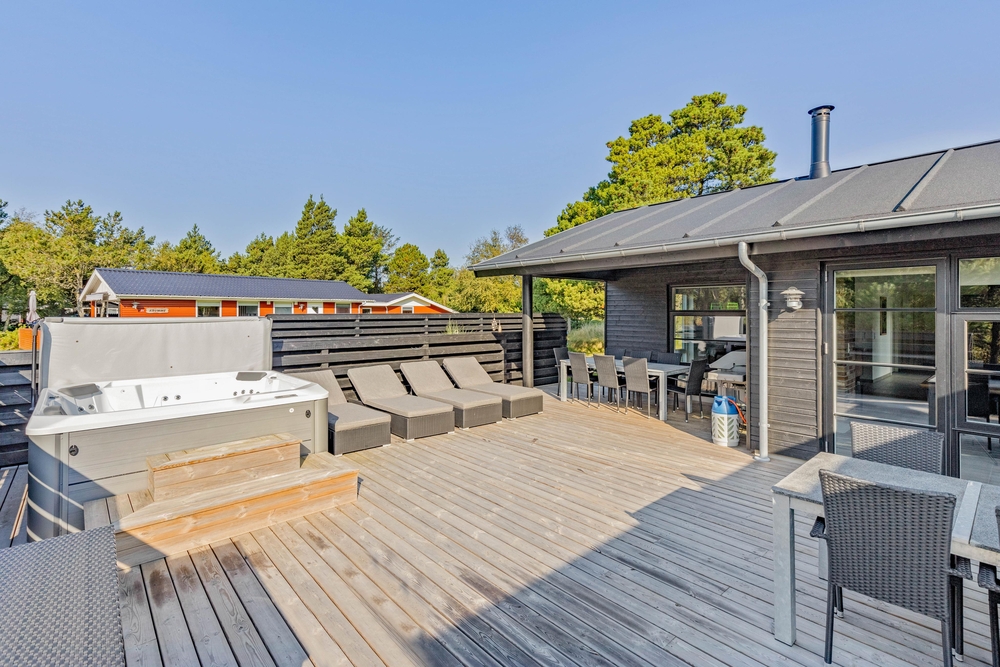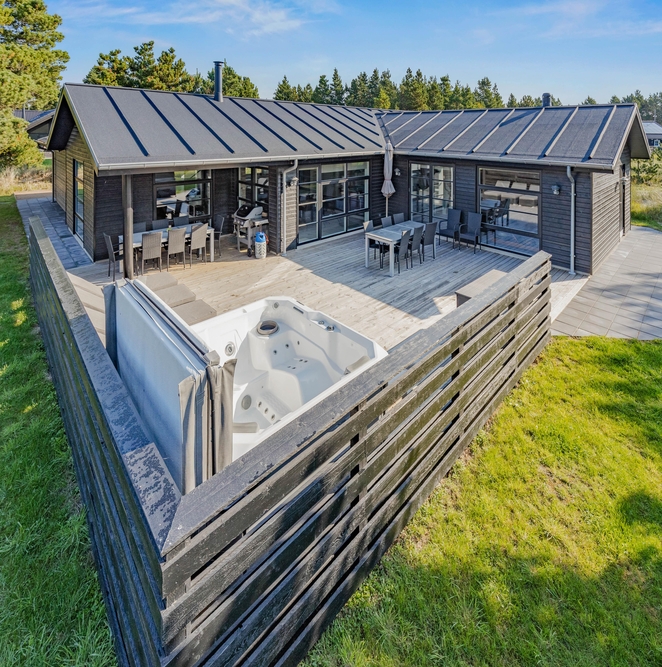 Udendørs har I en stor, lækker træterrasse, der er delvist overdækket og afskærmet. Foruden udespaen, der er at finde på terrassen, står der også havemøbler, liggestole og en grill klar, så I har alt til en dejlig feriedag i den friske luft.