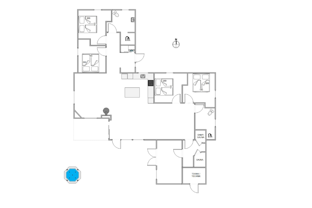 Det 186 kvadratmeter store sommerhus har rigelig plads til 8 personer. De 4 soveværelser er alle indrettede med dobbeltseng, og med 2 badeværelser er der ingen kø om morgenen.