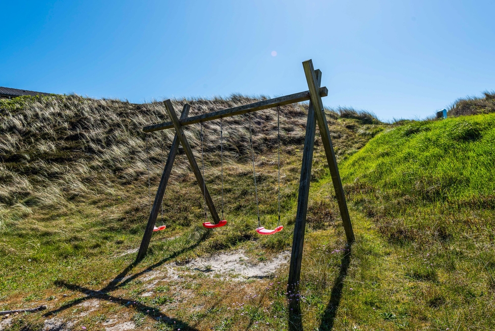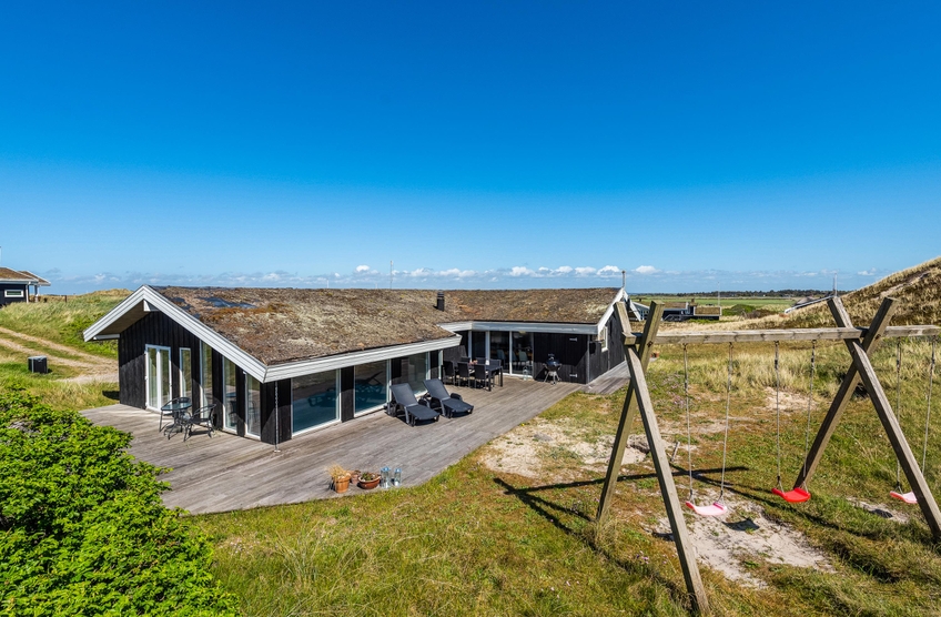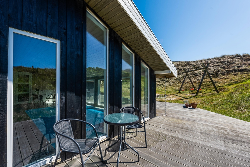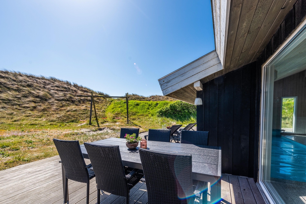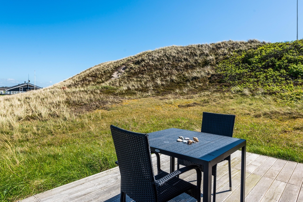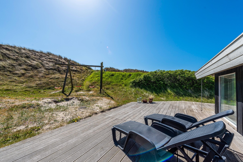 På terrasserne rundt om huset, kan man til enhver tid finde et læ-hjørne, og mod syd er terrassen omgivet af klitter, så man er helt privat og kan nyde solen og lugten af havet, mens børnene gynger eller leger i sandet.