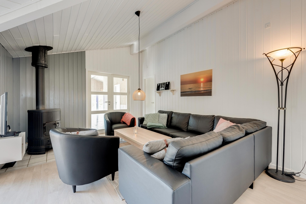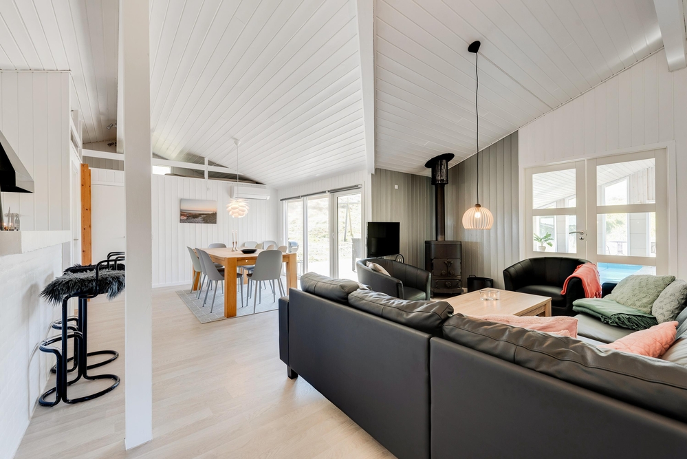 På de lidt koldere dage, indbyder stuen til afslapning foran brændeovnen ? og herfra kan man også nemt følge børnenes leg i poolen eller på hemsen.