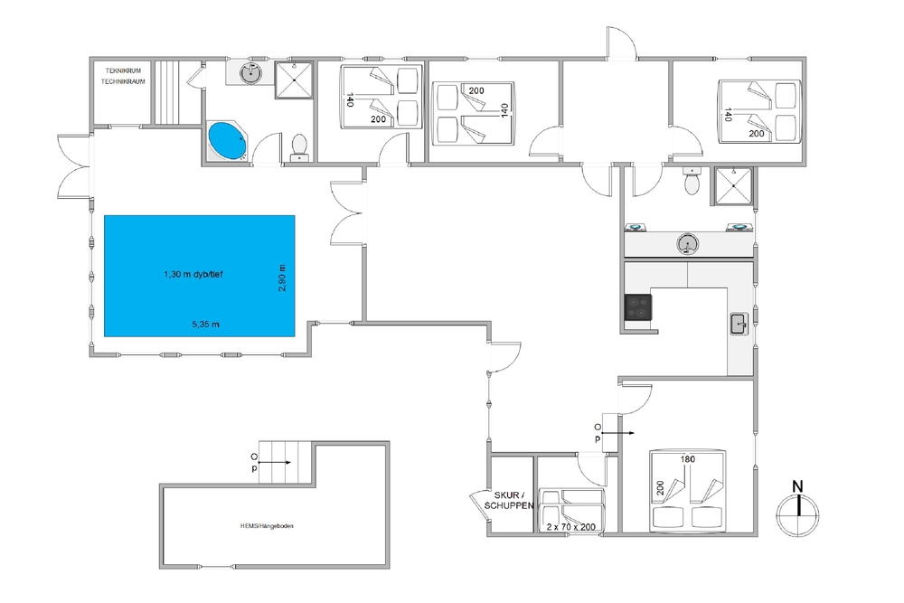 Der er 5 soveværelser i huset, hvoraf de 4 værelser er med dobbeltsenge og 1 værelse er med køjeseng. Derudover er der en hems med 2 ekstra sovepladser. Her vil måske især børnene nyde at sove, lege og lave hyggelige huler.