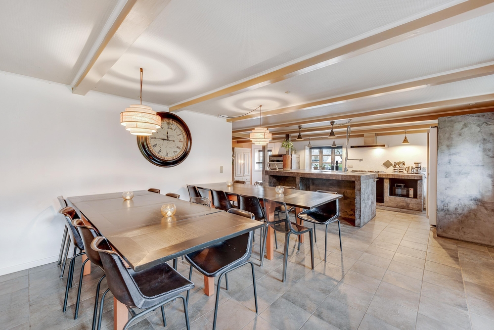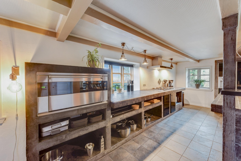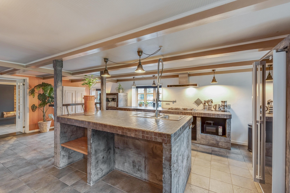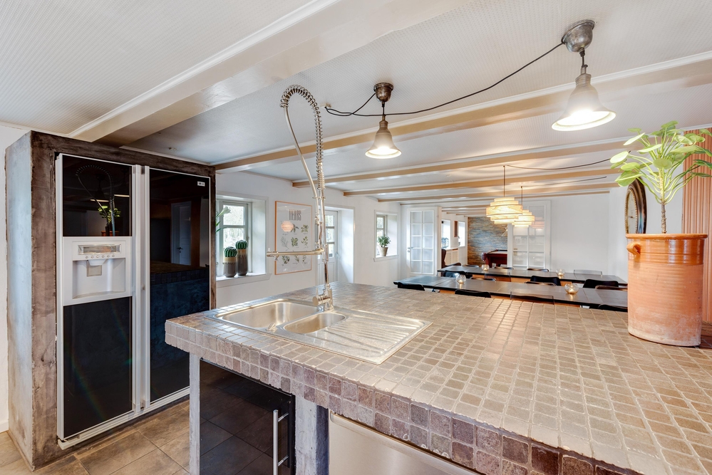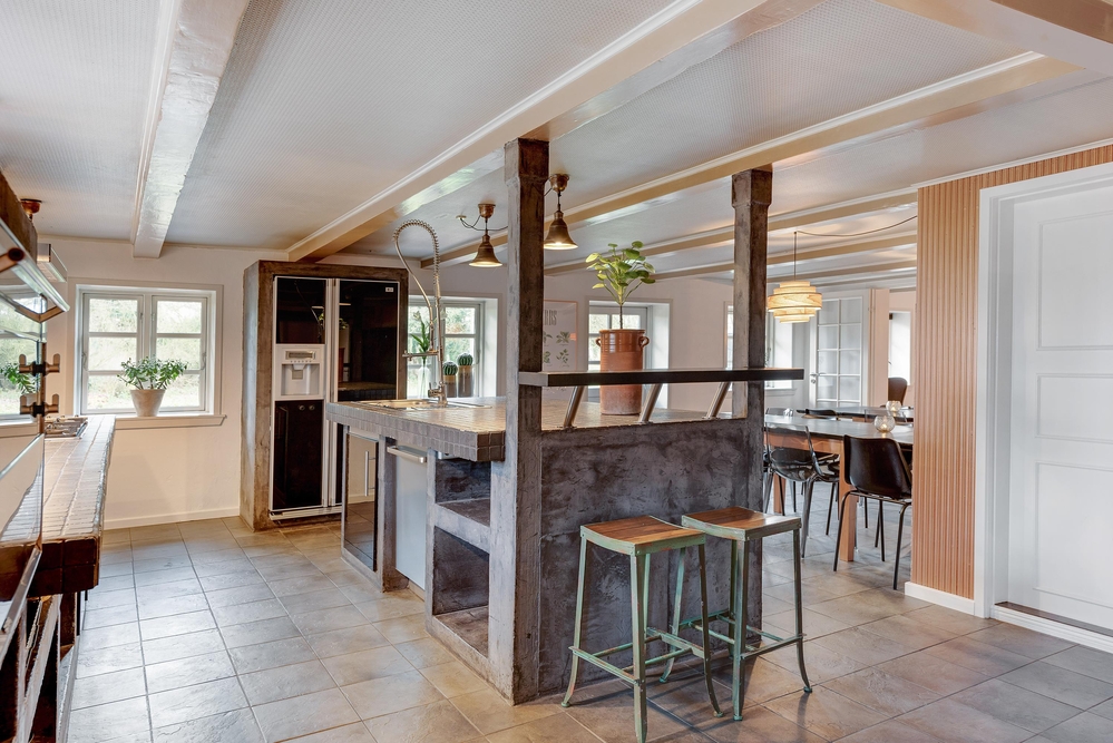 Fra entreen går man direkte ind til køkkenet gennem de to store terrasselignende døre. I det store åbne køkken kan madelskere slå sig løs ? her er alt hvad man skal bruge til at kunne lave mad til jer alle sammen. Med store døre der kan åbnes op hele vejen og en direkte adgang til terrassen er der hele tiden mulighed for samvær og hygge.