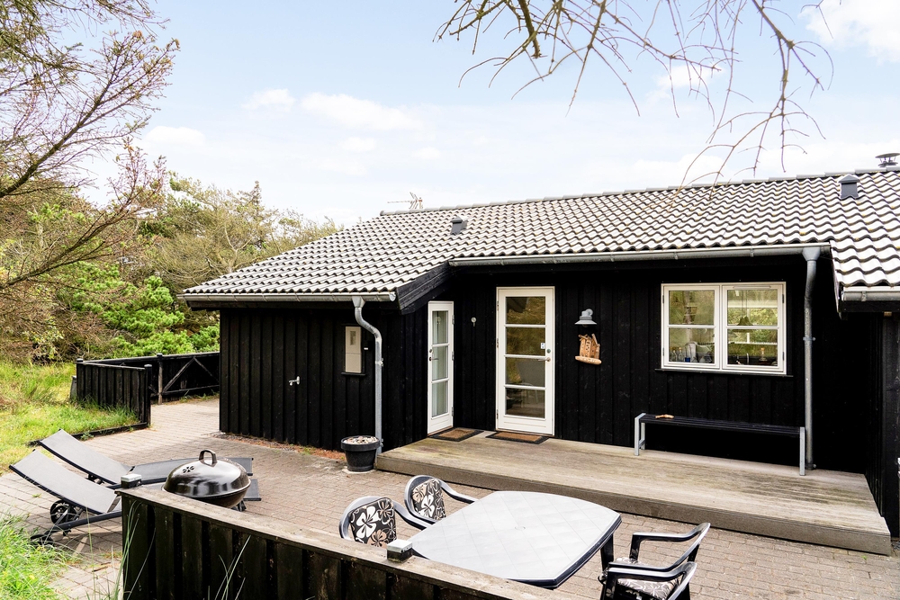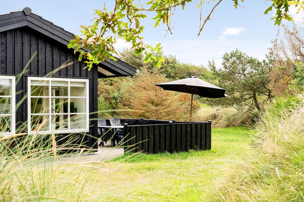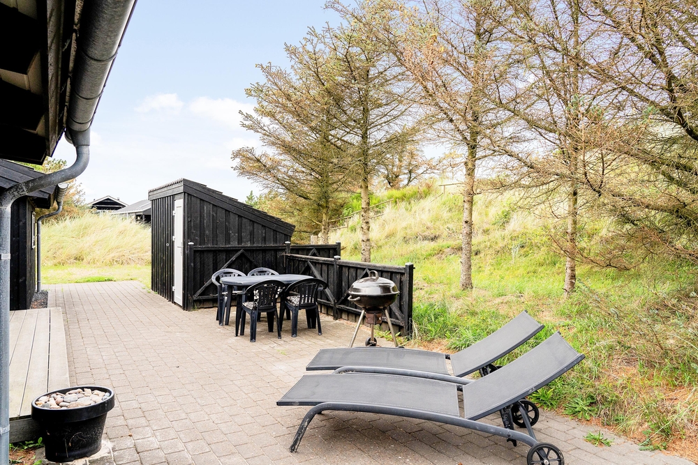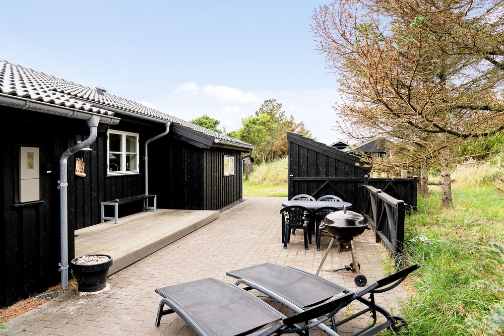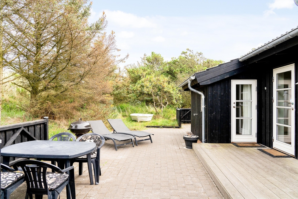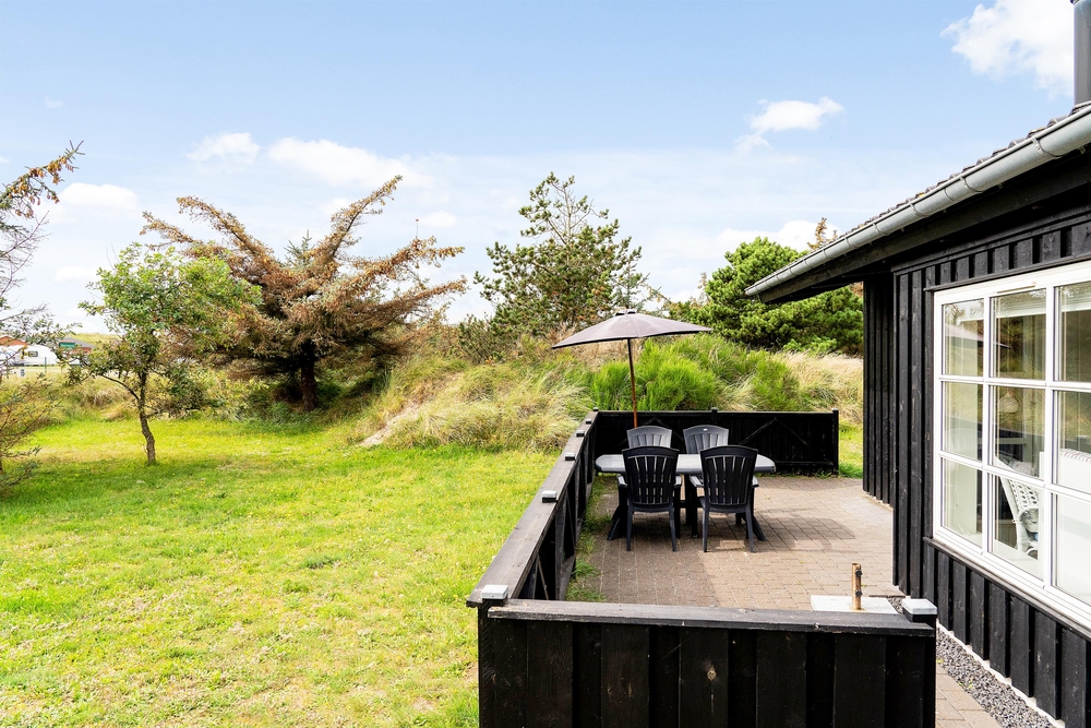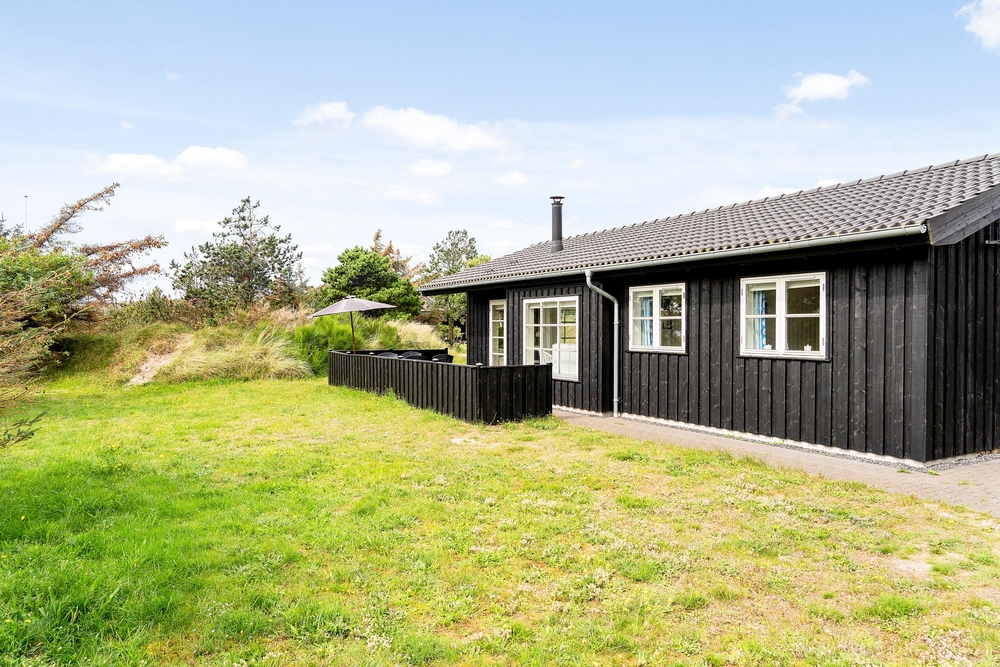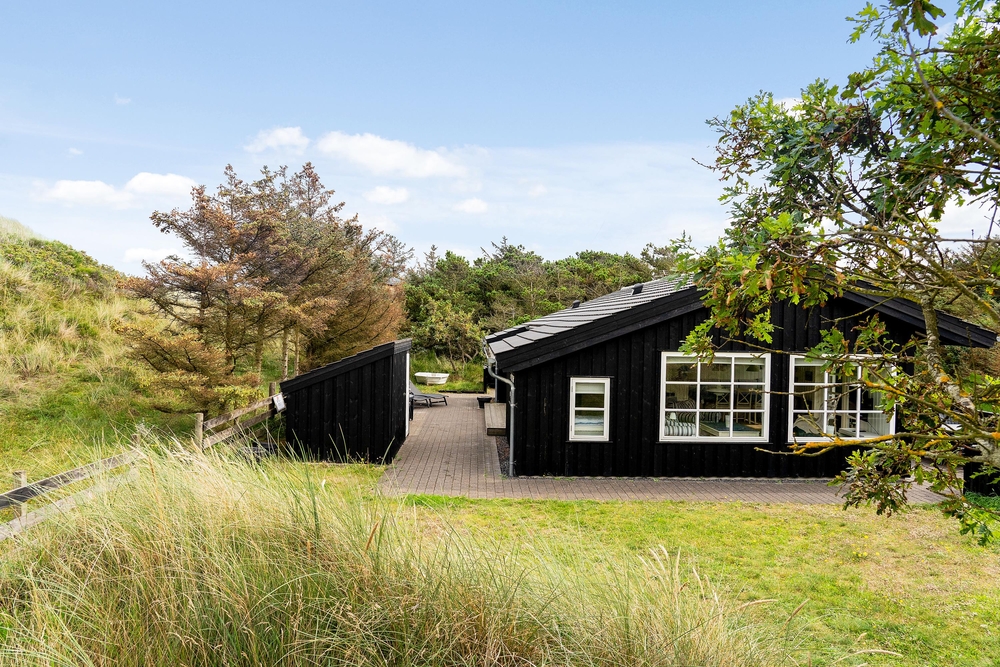 Huset ligger på en dejlig lyst naturgrund, der er omsluttet og beskyttet af klitter, lave træer og buske. Rundt om huset har I terrasser og især på sydvest-terrassen, der er afskærmet, kan I allerede i det tidlige forår sidde ude og nyde de allerførste solstråler. Åben dobbeltdøren fra stuen og luk den skønne duft af salt og lyng ind. Spurvevej 2 ligger kun 300 meter fra havet, så du kan sagtens smide håndklædet over skulderen og smutte ned over klitten til en morgendukkert før morgenmaden. Eller hvad med en frisk efterårs- eller vinterdukkert med efterfølgende opvarmning i saunaen?