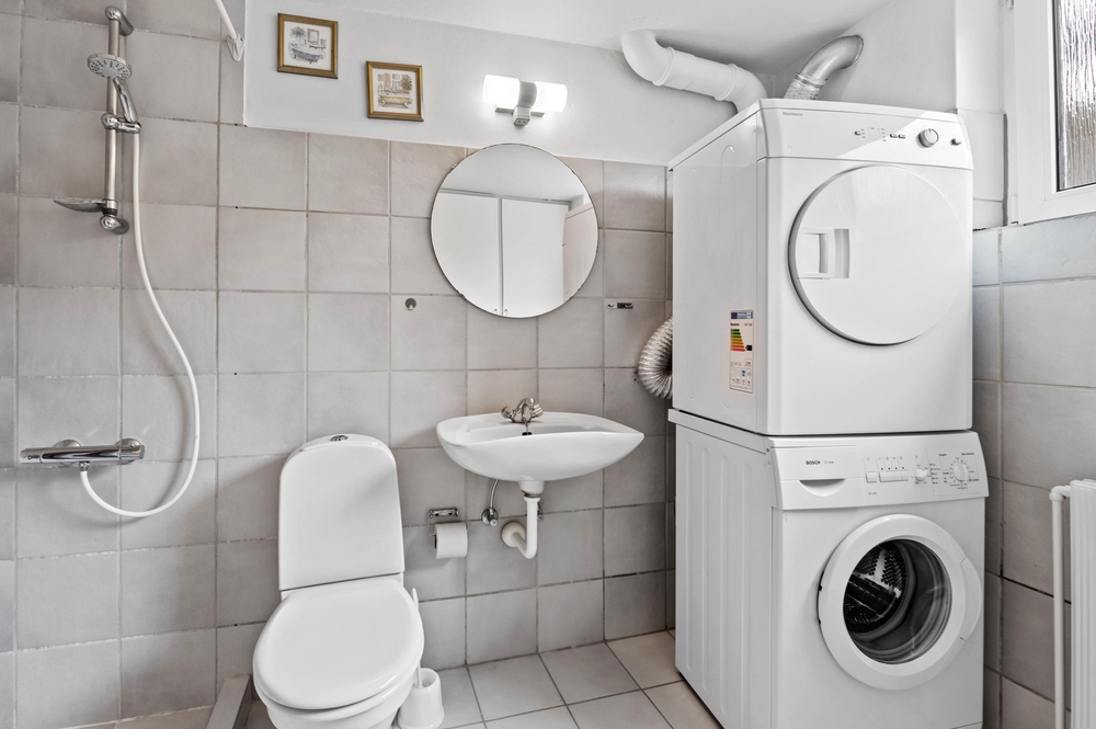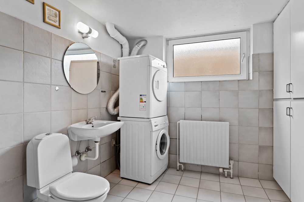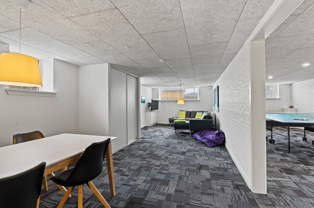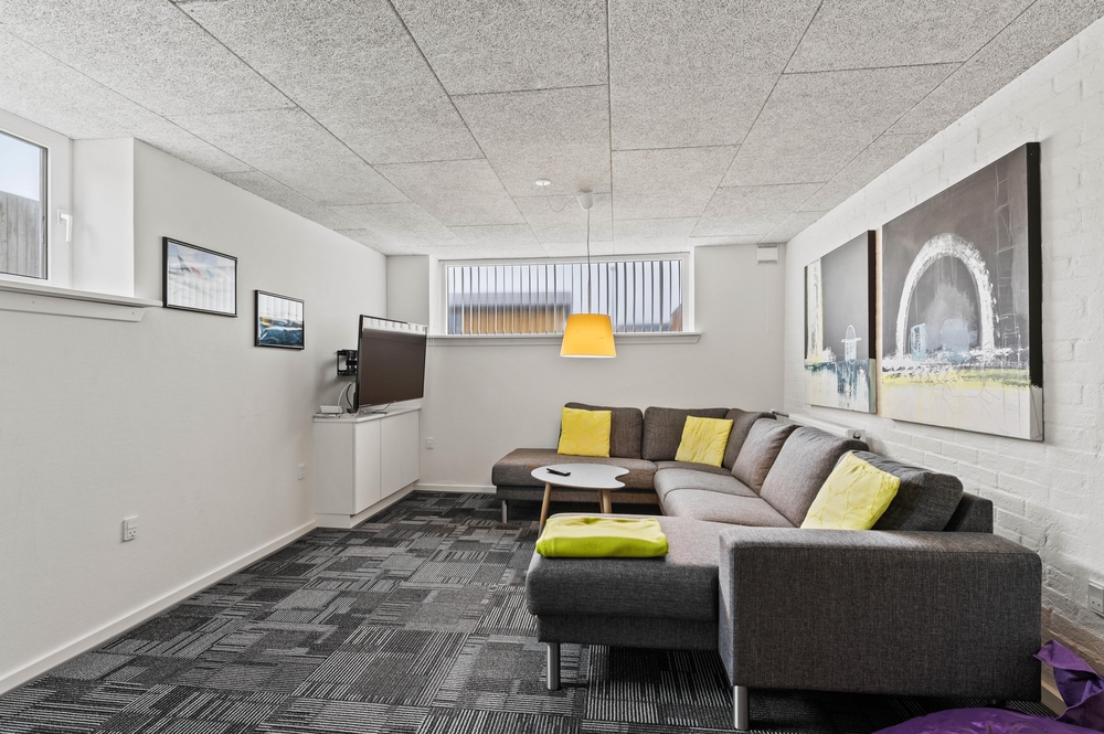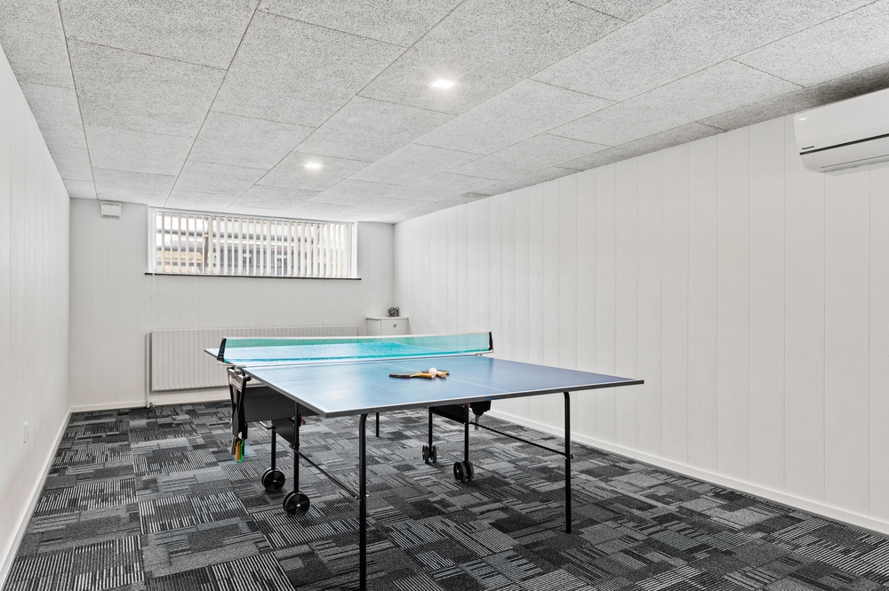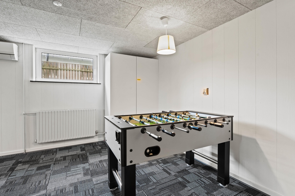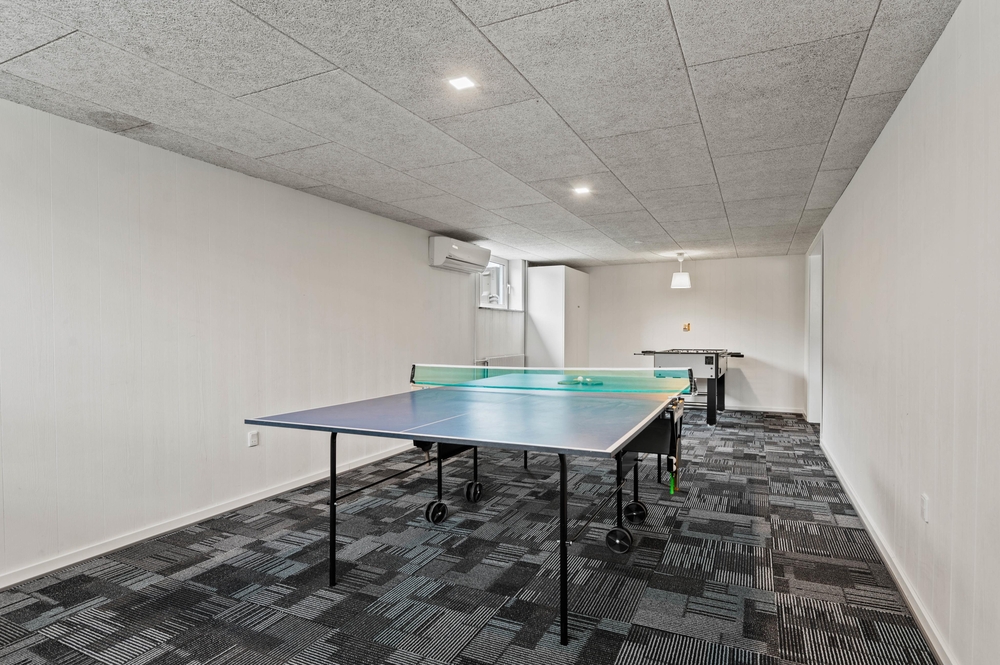 I den nederste etage finder du det andet badeværelse med vaskemaskine og tørretumbler, samt endnu en stue med en behagelig sofa og tv. Praktisk, hvis I vil se forskellige tv-programmer samtidig. For dem, der gerne vil bruge ekstra energi på ferien, findes også aktivitetsrummet hernede.