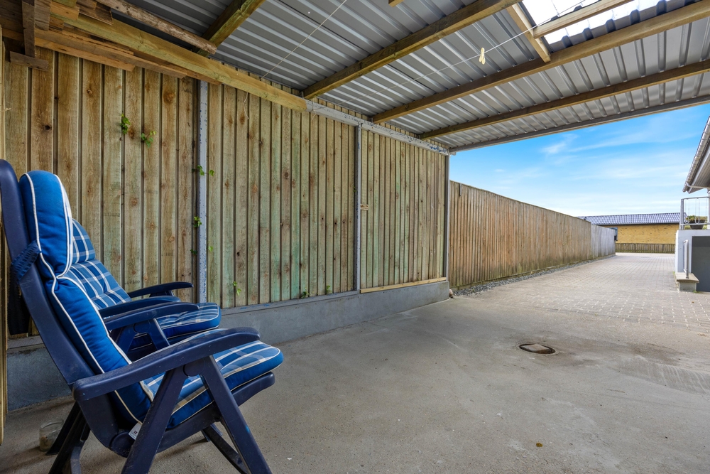 Det smukke terrasseområde er ideelt for hundeejere eller småbørnsfamilier, da man trygt kan lade de små færdes der. Her kan du altid finde en rolig plet til en kop kaffe i den friske luft. Komfortable havemøbler og liggestole står til din rådighed. Du kan parkere din bil i carporten. Om aftenen er en lækker BBQ på grillen en god måde at afslutte dagen på.