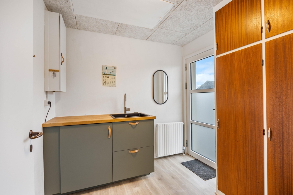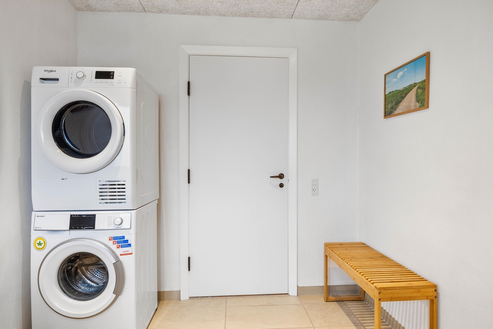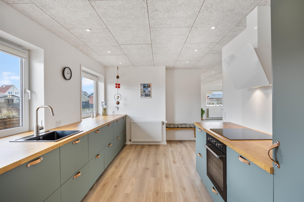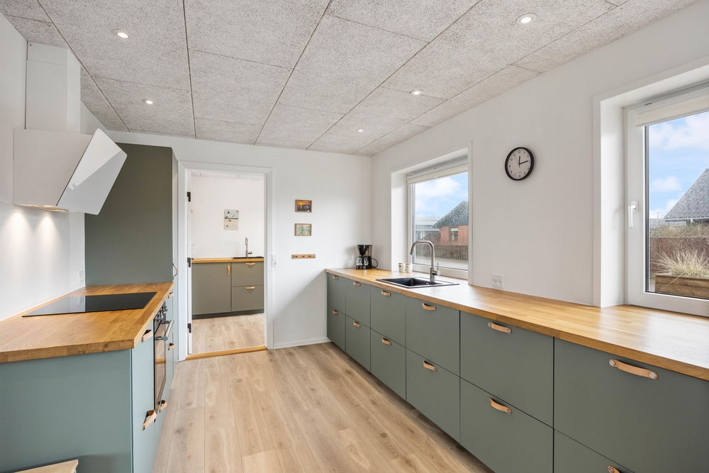 Det første, I træder ind i, når I kommer til sommerhuset, er et godt bryggers med god plads til fodtøj og overtøj. Herfra er der indgang til et stort og åbent køkken, hvor blandt andet opvaskemaskine, mikroovn og induktionskomfur står til jeres rådighed ? alt, feriens kok har brug for. Dagens måltider tilberedes derfor uden problemer, hvis I ikke vælger at spise på et af byens lækre spisesteder, der ligger i gåafstand fra huset.