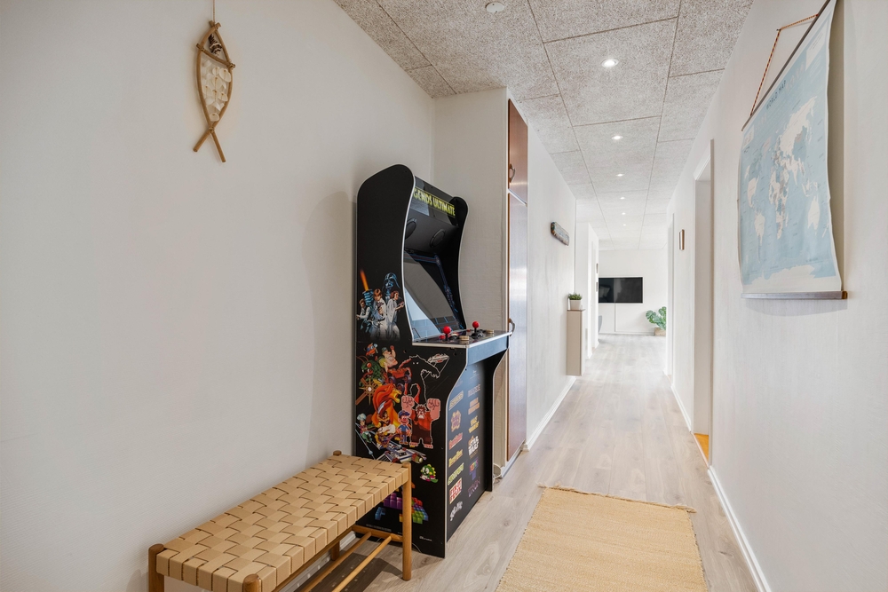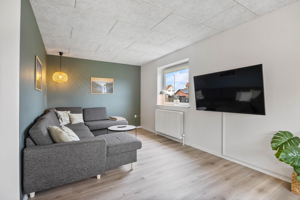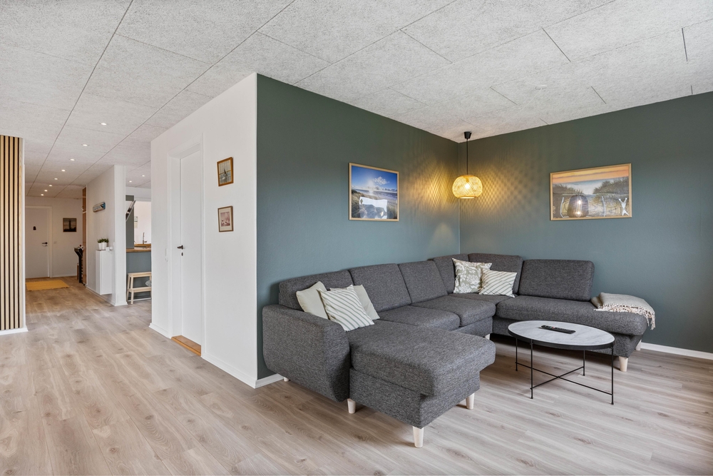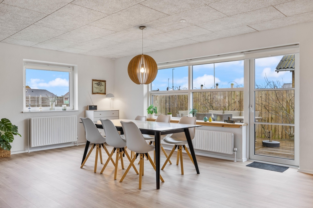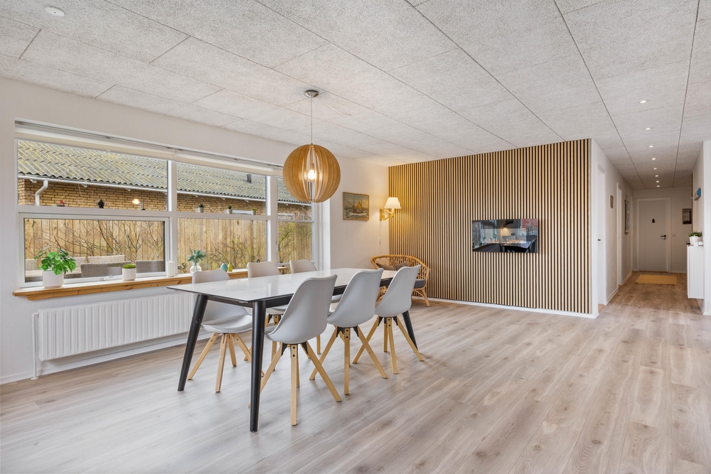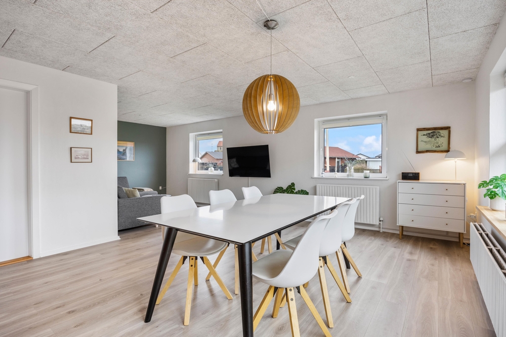 Spisestue og opholdsstue ligger i åben forbindelse med og tæt på køkkenet. Den smarte pejseindsats spreder hygge hele året rundt, og i de kolde måneder sørger den for god varme, mens I hygger med en god film, spil, eller surfer på internettet efter gode idéer til planlægning af næste dag.