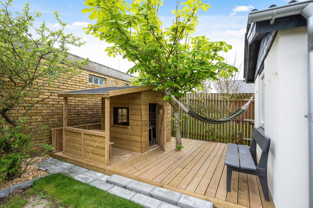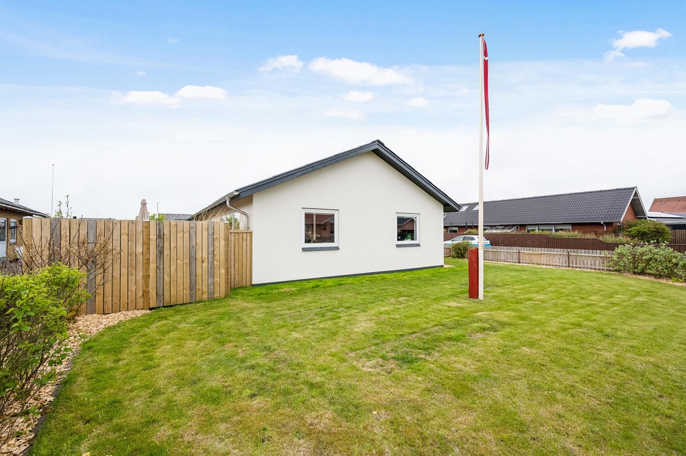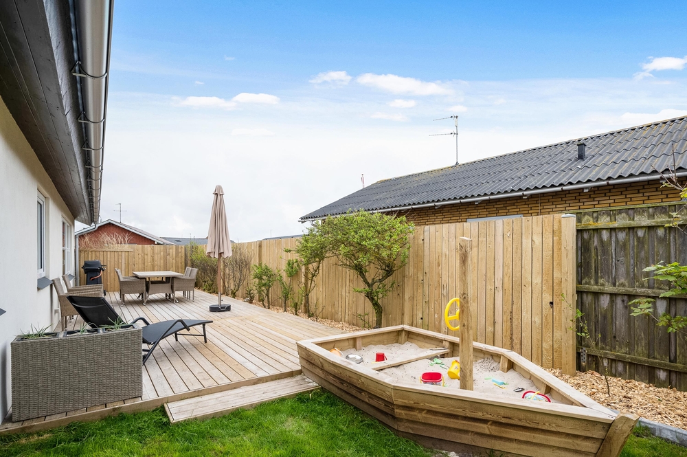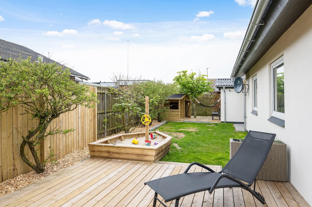 Til sommerhuset hører en dejlig plænegrund, og fra stuen er der udgang til en sydvestvendt terrasse, hvor havemøbler og liggestole står klar til jer. Her kan I nyde solen om dagen, mens de mindste hygger sig i sandkassen i haven.